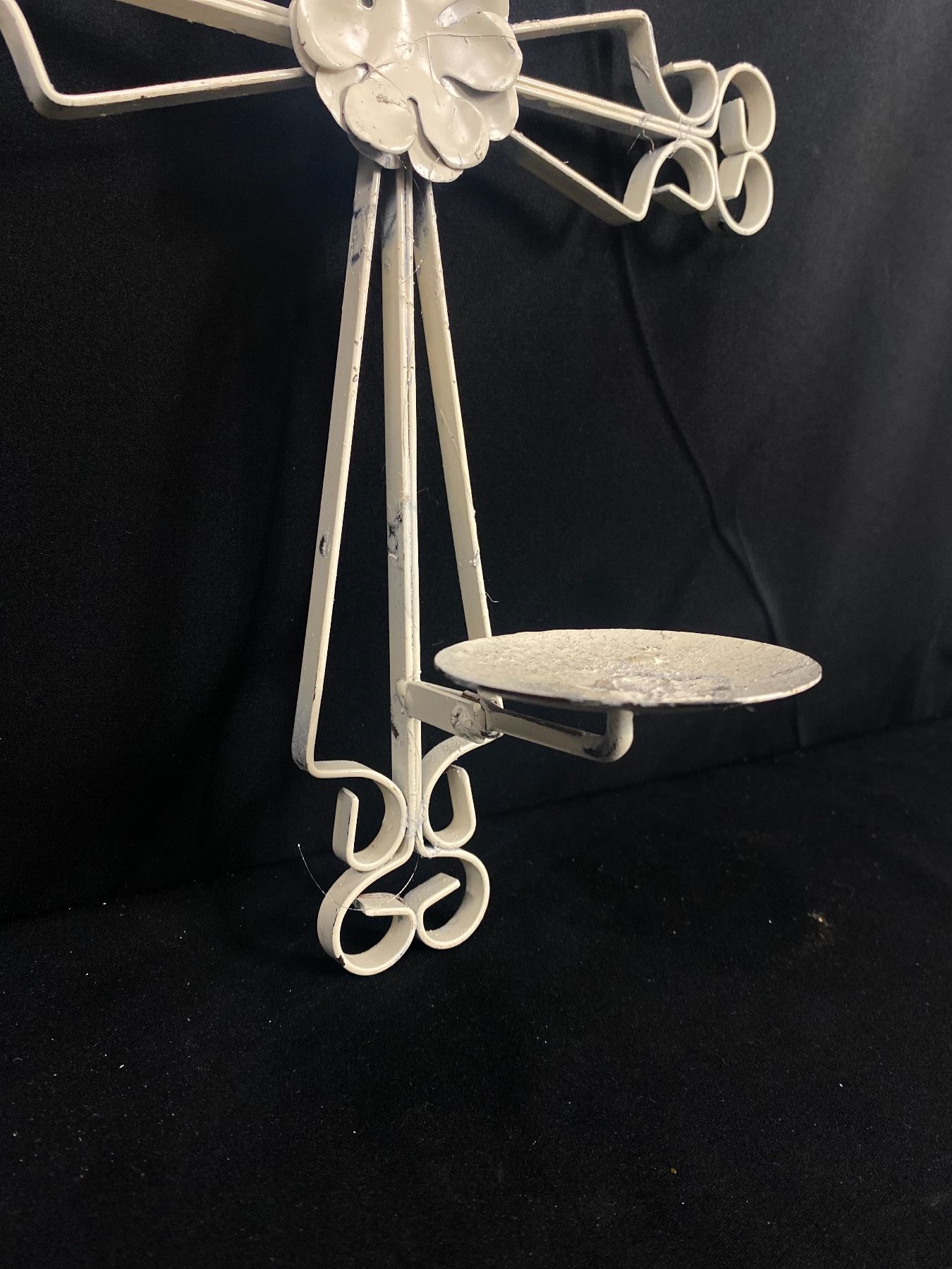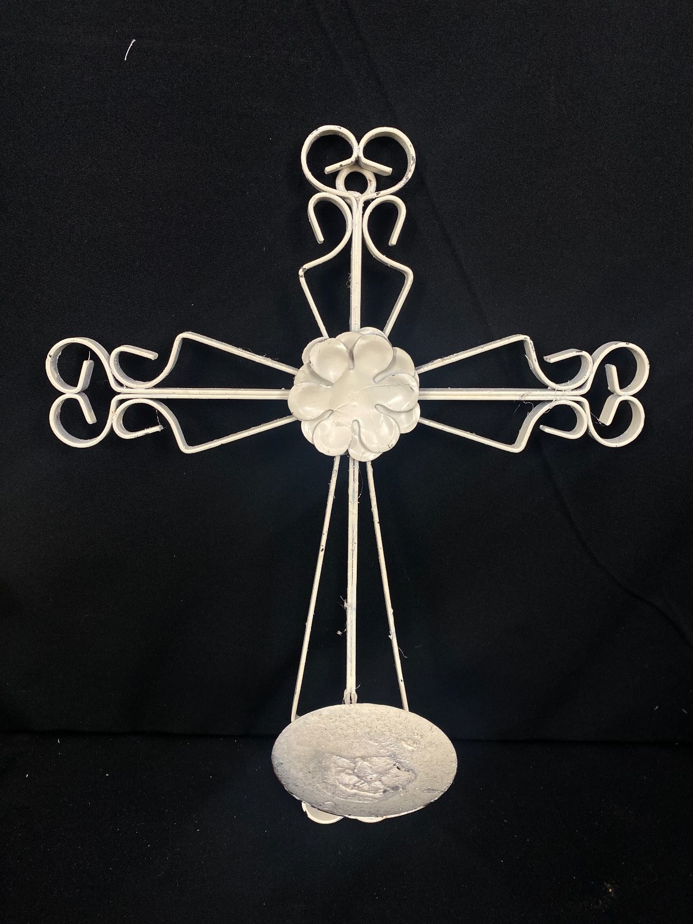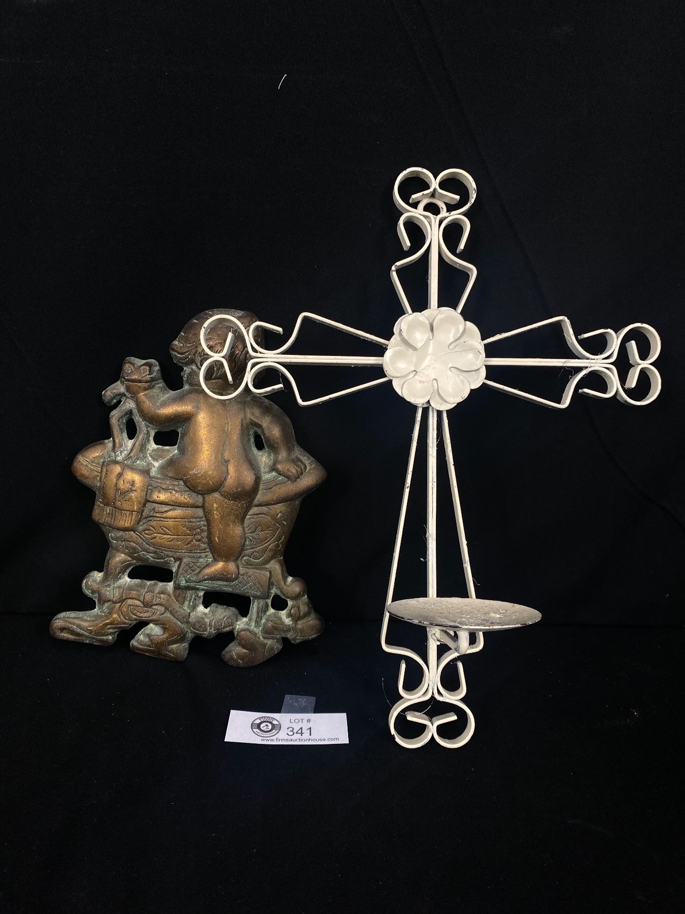 Vintage Collectible Lot Including Metal Wall Hanger and Metal Cross Candle Holder
