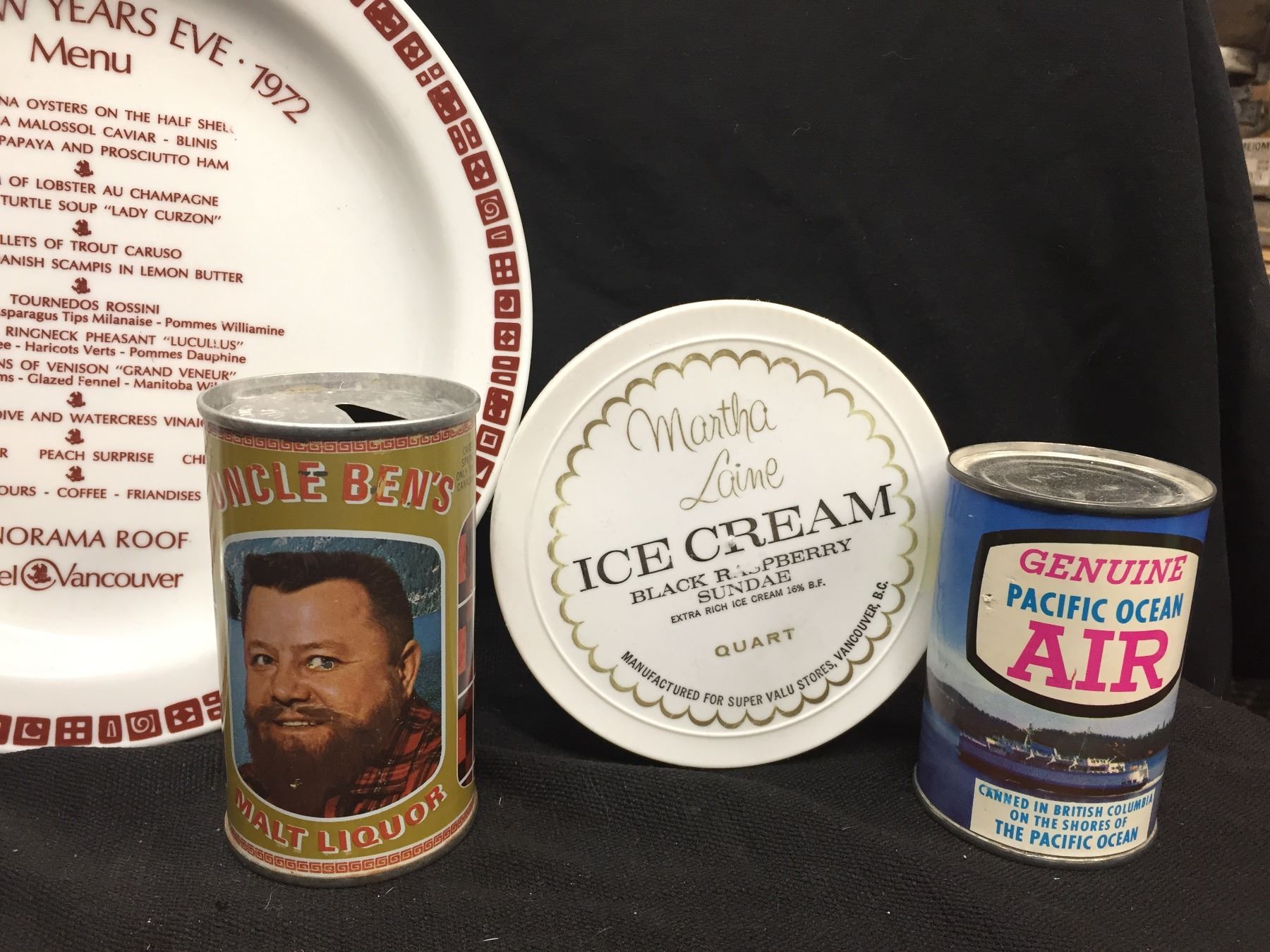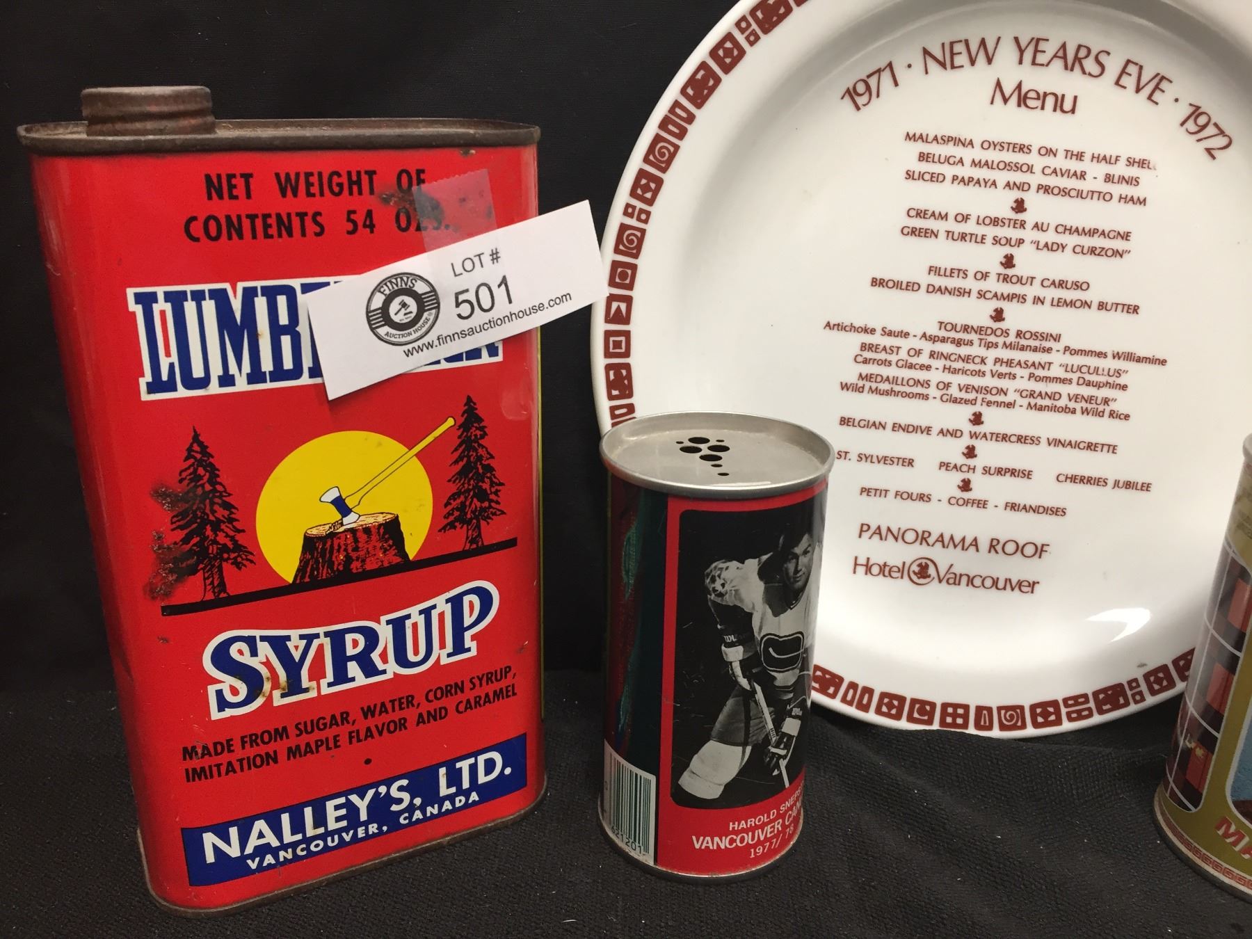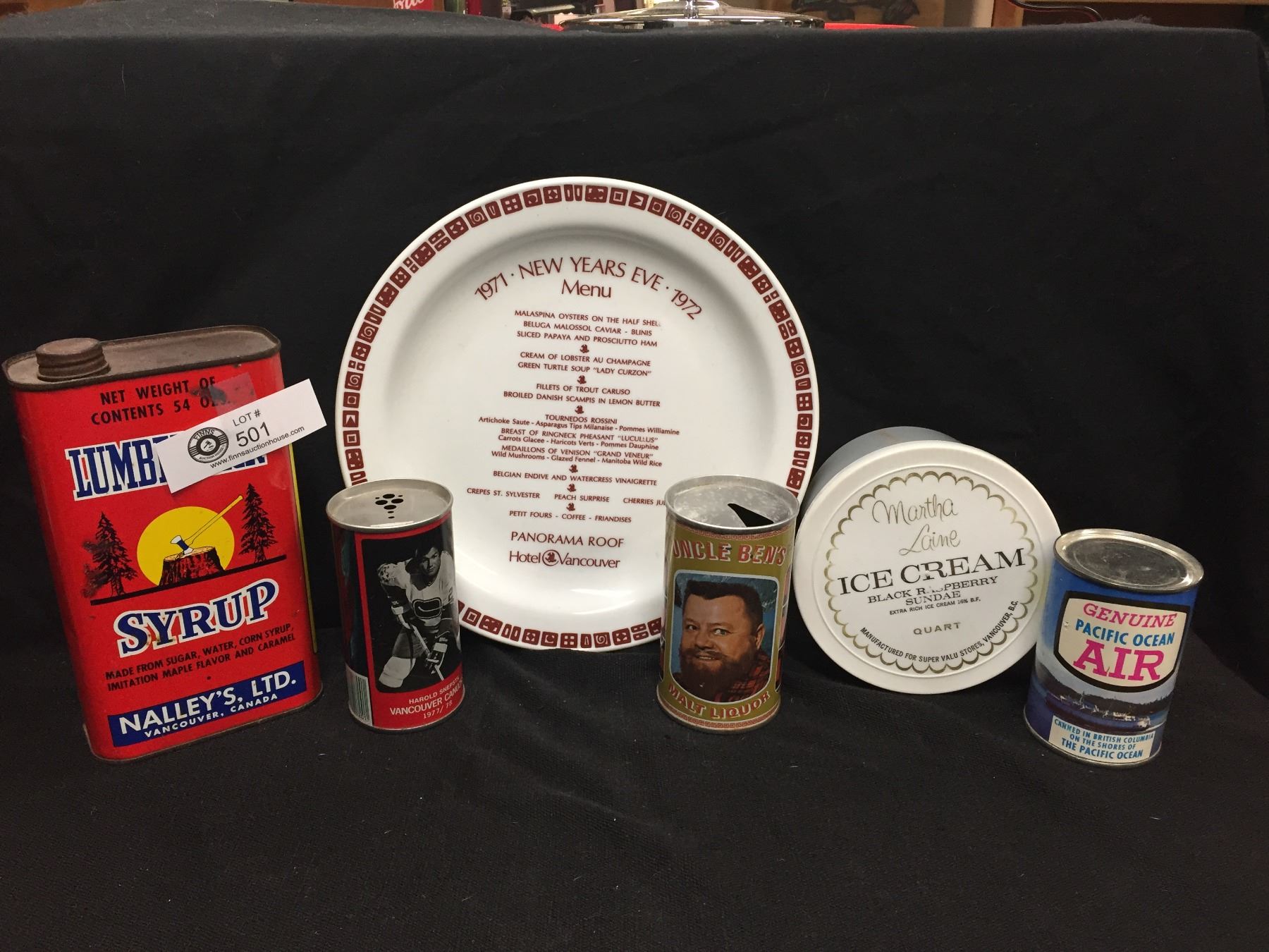 Vintage Collectible Lot. Lumberjack Syrup Tin, Panorama Roof Hotel Menu Plate from 1972 Ice Cream Pail and Uncle Ben's Malt Liqour Beer Can etc