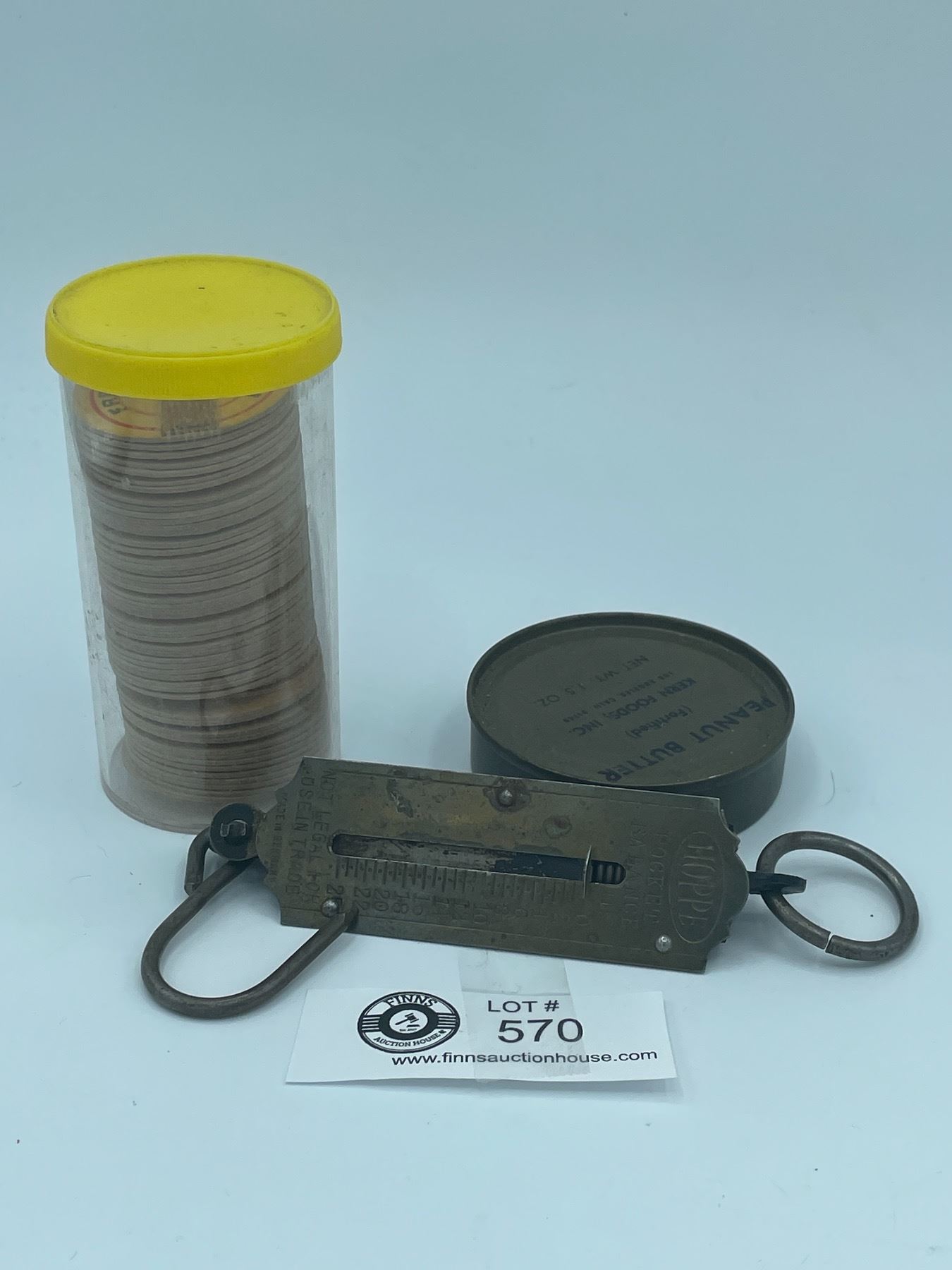 Vintage Collectible Lot of Peanut Butter Full Ration Tin, Fish Scale and Milk Bottle Tops