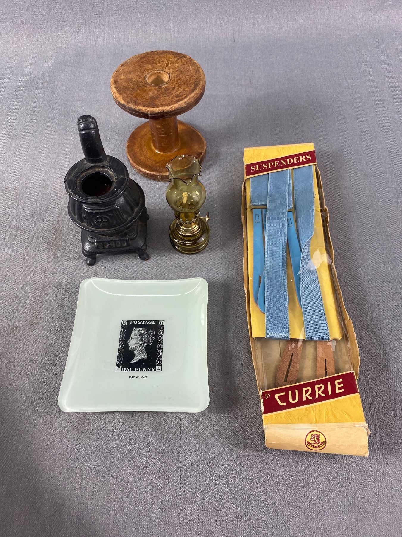 Vintage Collectibles - Suspenders In Original Box, Cast Iron Stove, Mini Oil Lamp, Glass Trinket Tray & Wood Bobbin