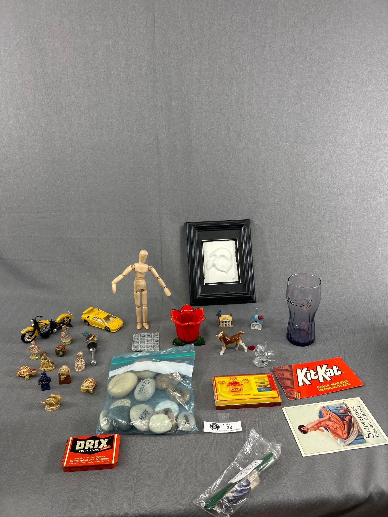 Vintage Collector Lot - Advertising Postcards, Pocket Game, German Drix Tin, Sheaffer Pen & Miniatures, Unused Blue Chip Stamps Sheet