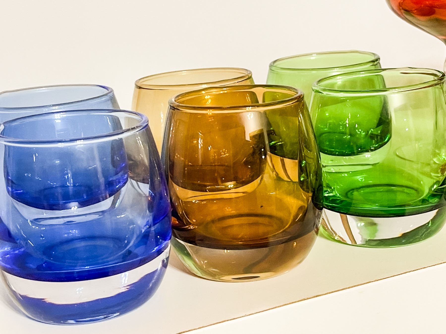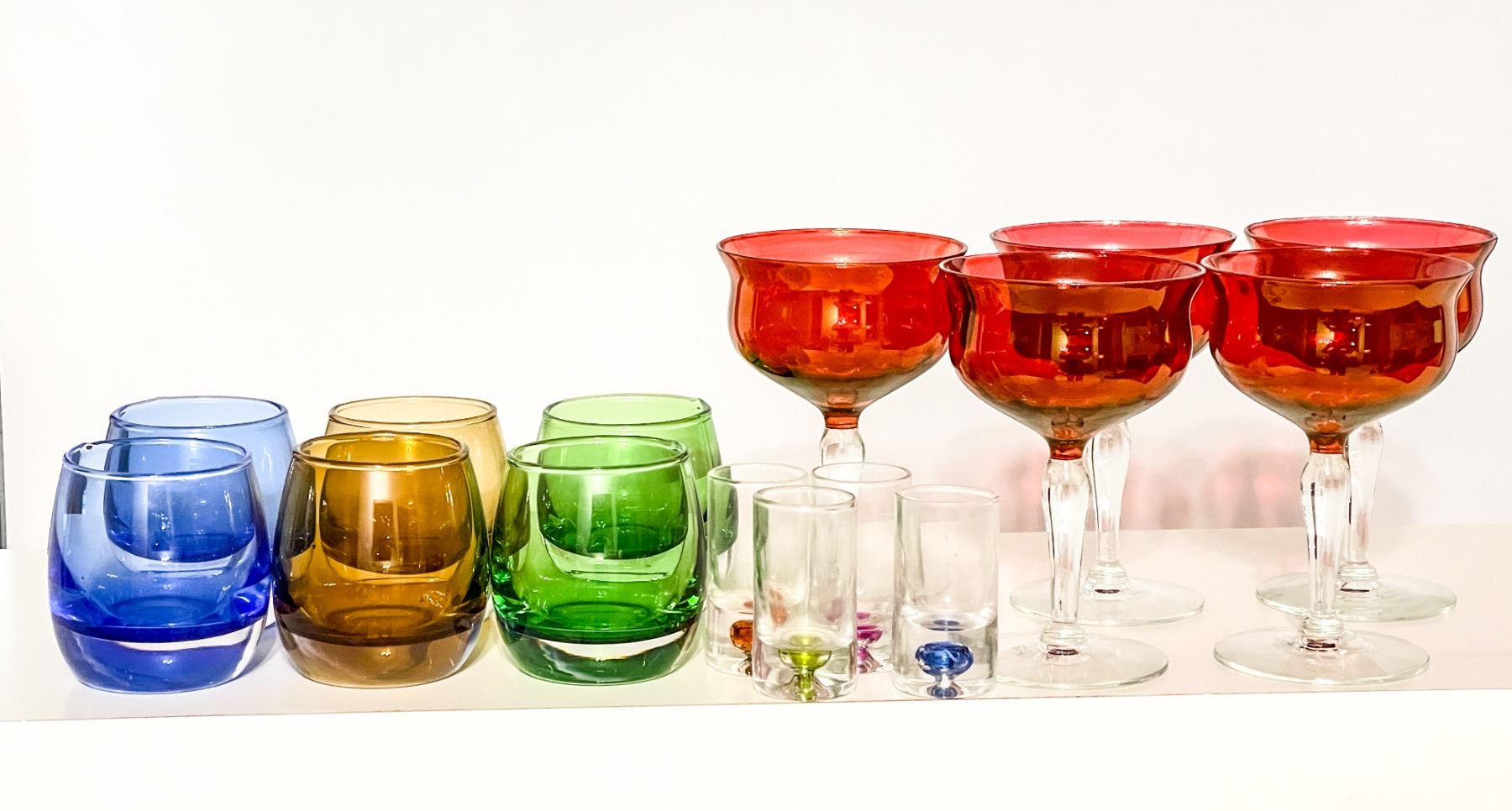 Collection of vintage glassware in vibrant colors. Includes 5 ruby red coupe glasses with a subtle gold iridescence (difficult to capture in photos), 6 heavy lowball glasses in amber, green, and blue with thick bases and excellent quality, plus 4 unusual shot glasses with colored “bubble” bases (Murano-style). The mix of bold mid-century color, iridescent finish, and unique bubble details make this set a standout.
