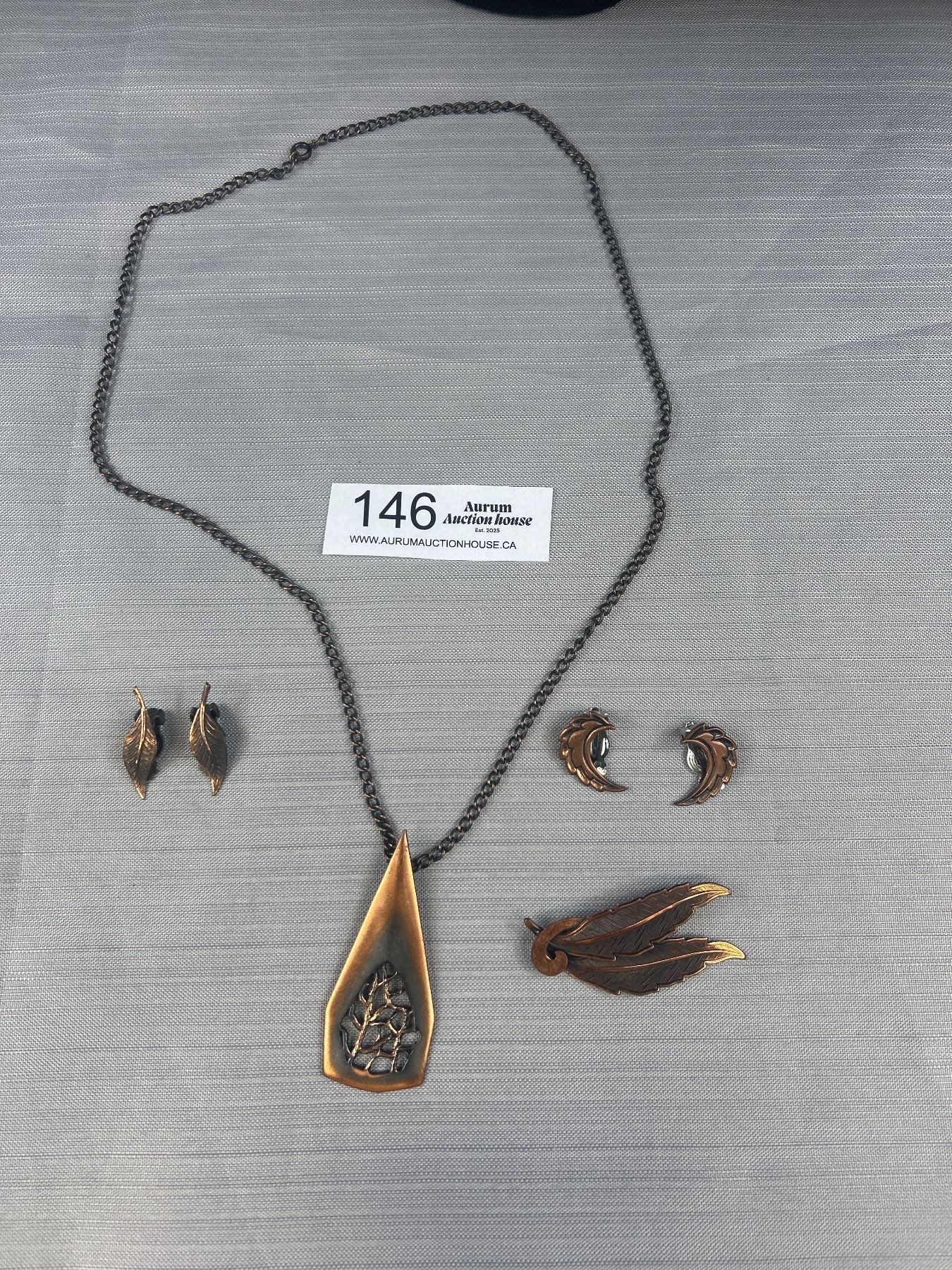Vintage Copper Pendant w/ Chain Necklace Brooch + 2 Pairs of Earrings