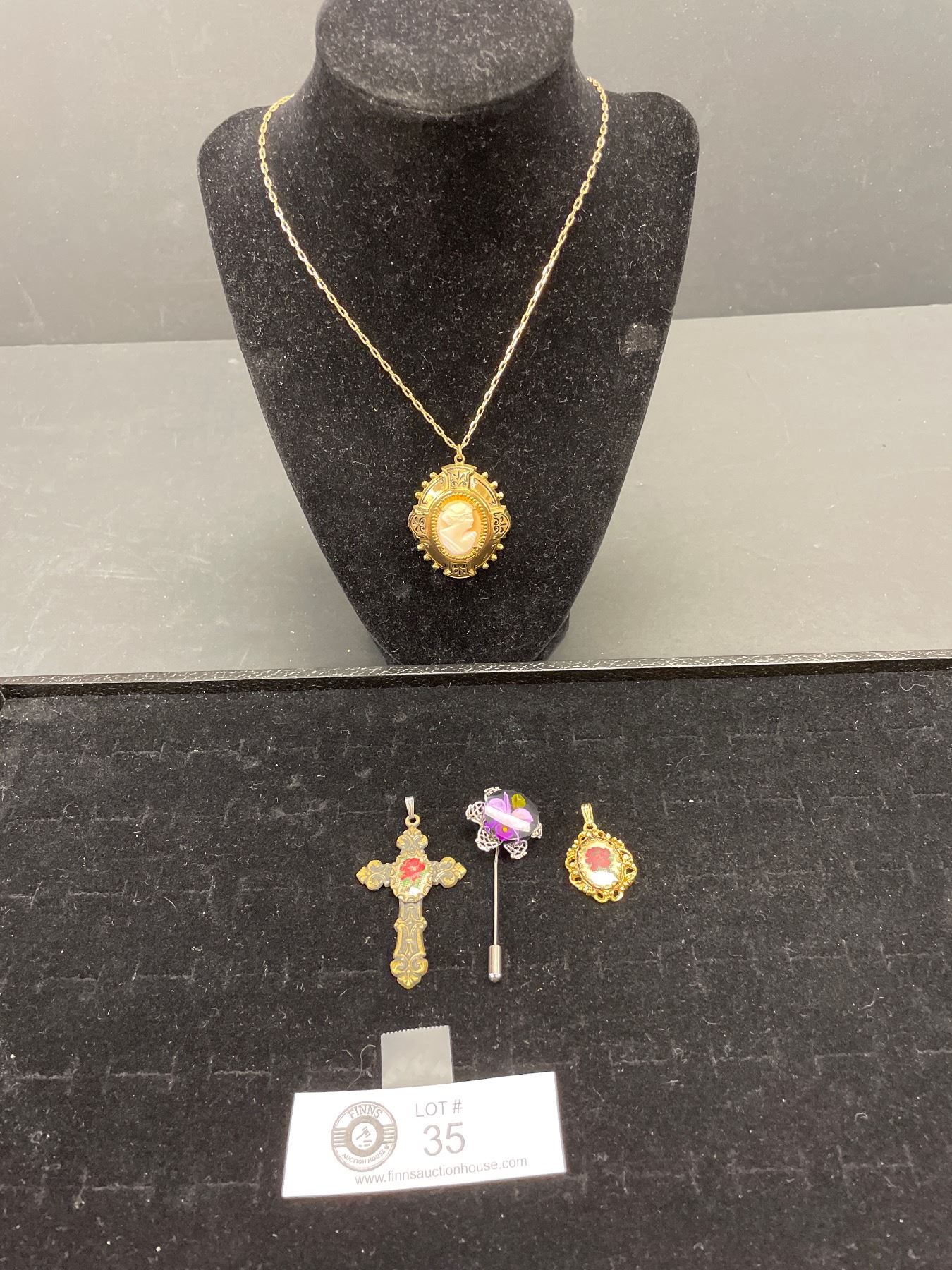 Vintage Costume Jewellery Lot - Petit Point Pendant, Acrylic Floral Pin, Cameo