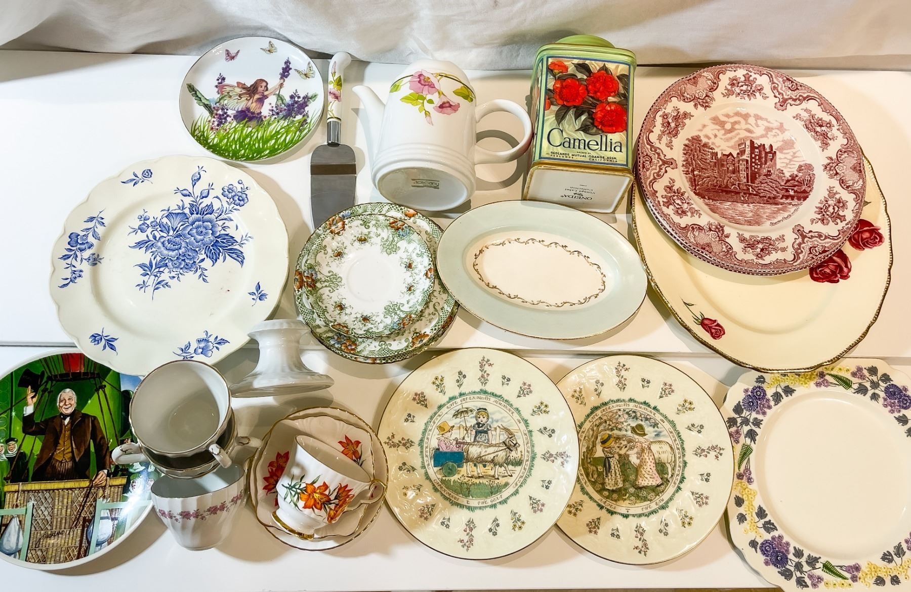 Charming mixed lot of cottage-style dishware and decor including Kate Greenaway Almanack 1884 plates, a Knowles Wizard of Oz collector plate, a Oneida Camellia ceramic jar from the Vintage Label Collection, and a Limoges France candlestick. Also includes assorted floral plates, cups, and serving pieces in coordinating tones of cream, green, and rose. Lovely mix for display, tea service, or vintage décor.