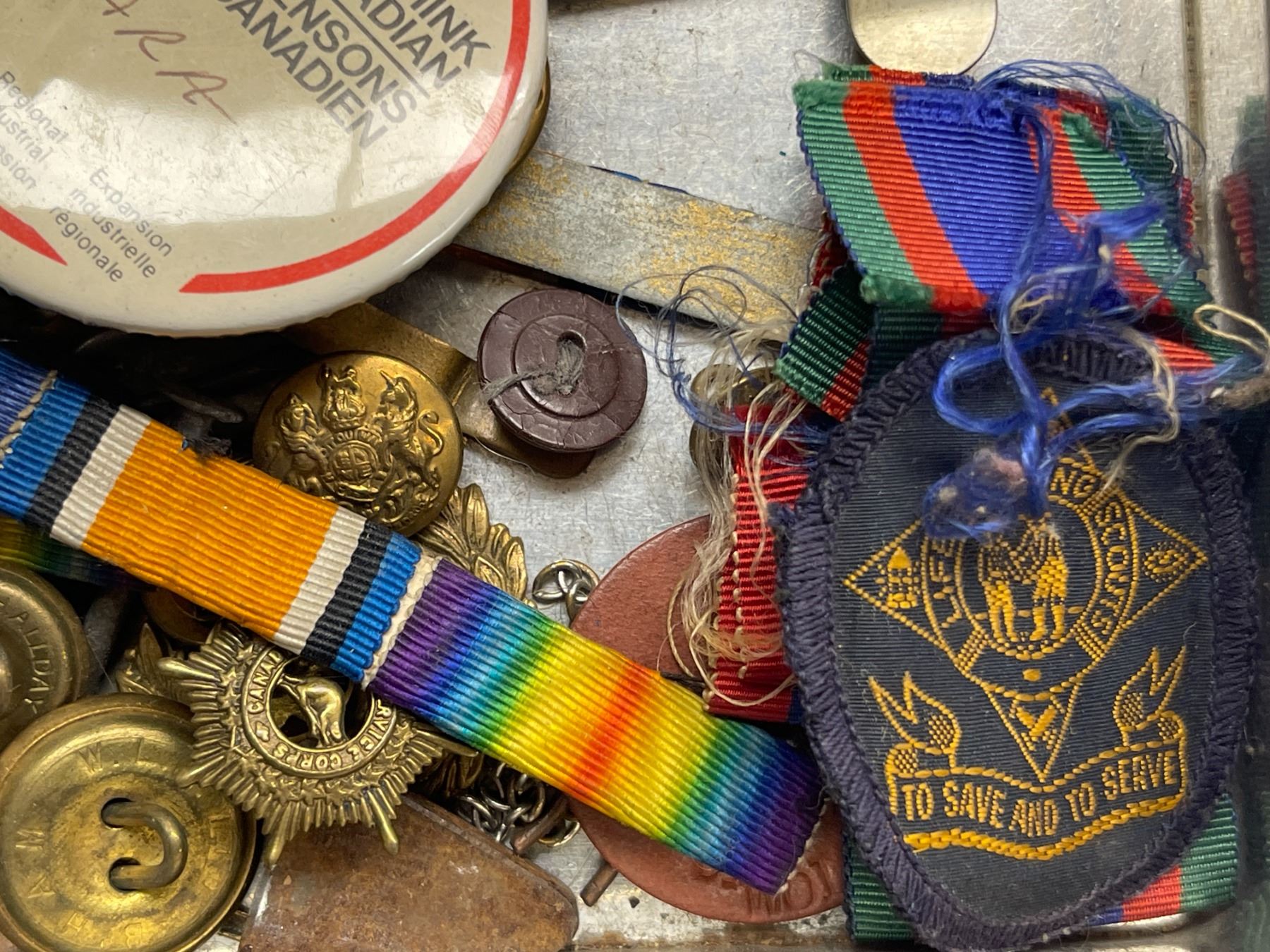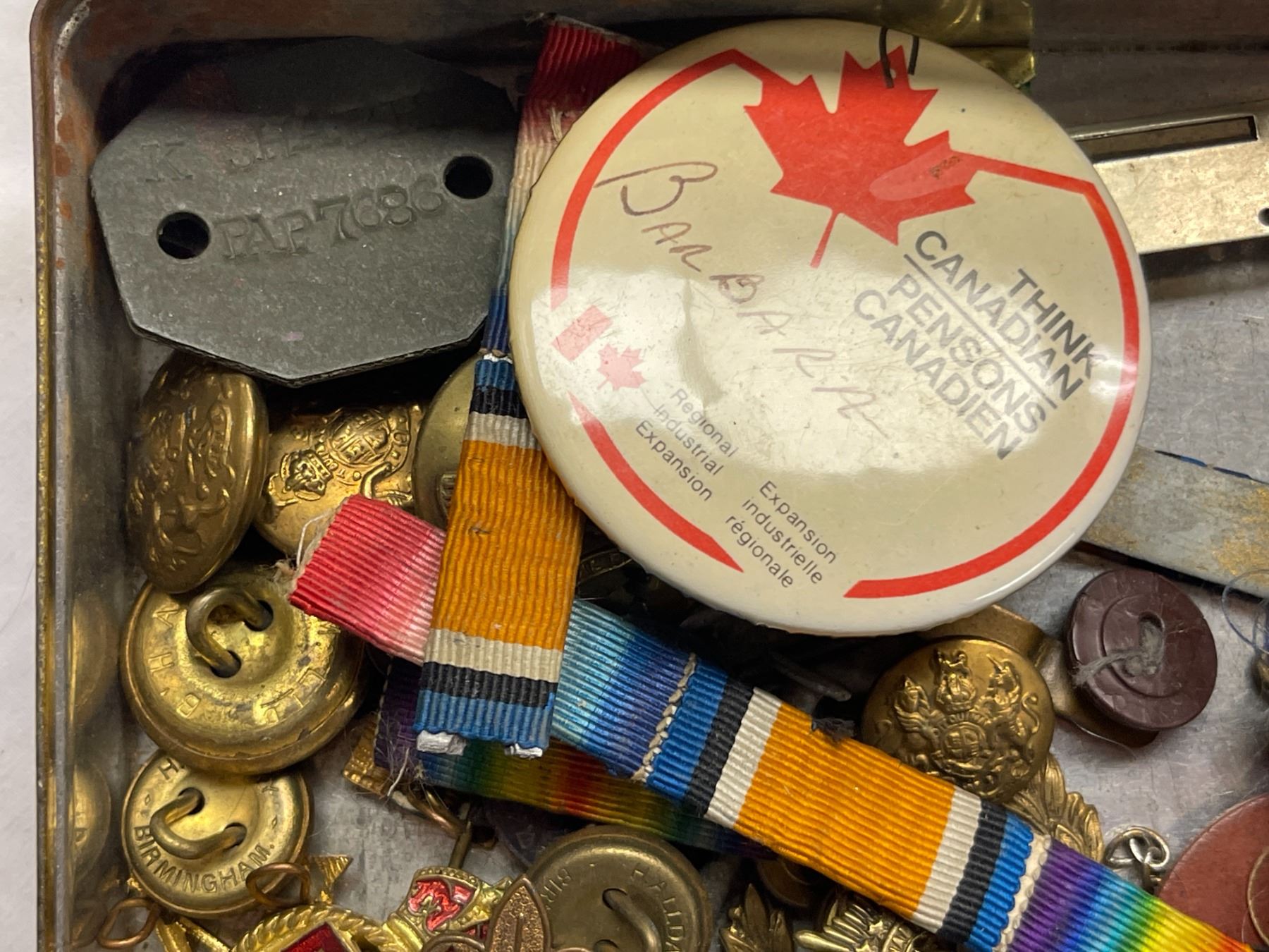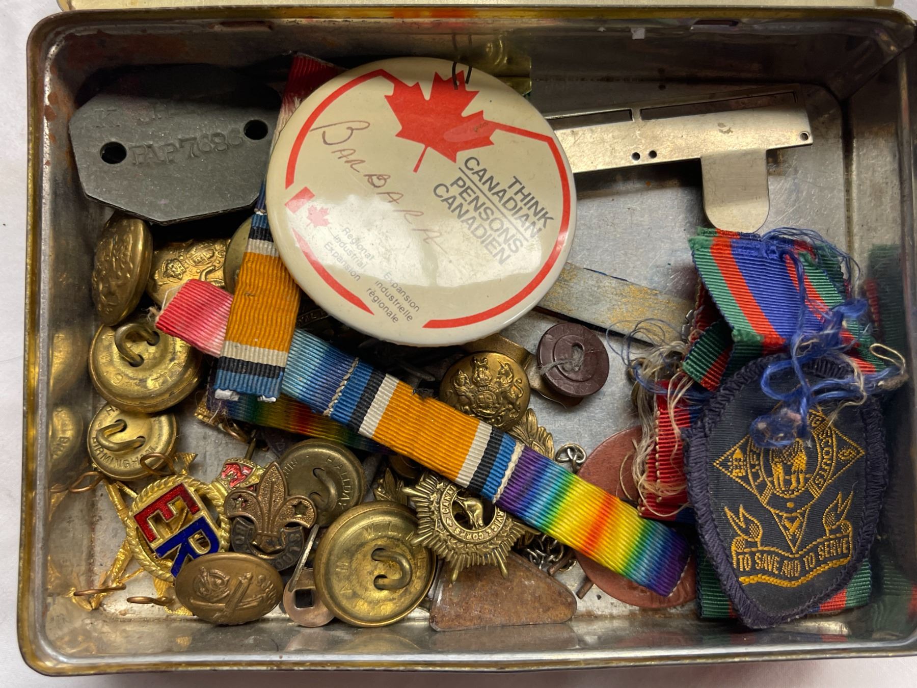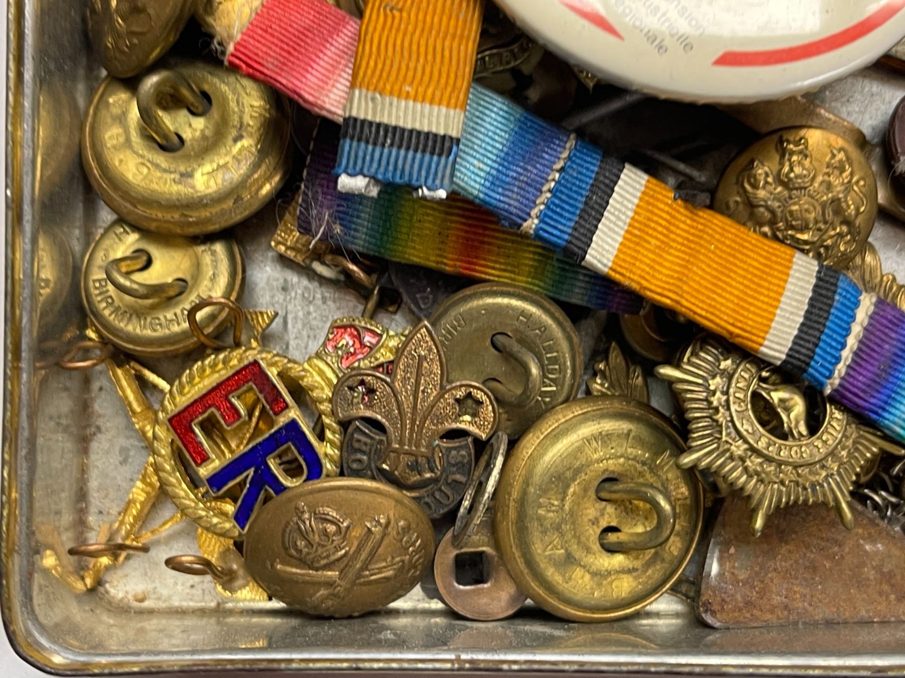 Vintage Craven A Cigarette Tin With Assorted Vintage Military Buttons, Pin Backs, & Cloths