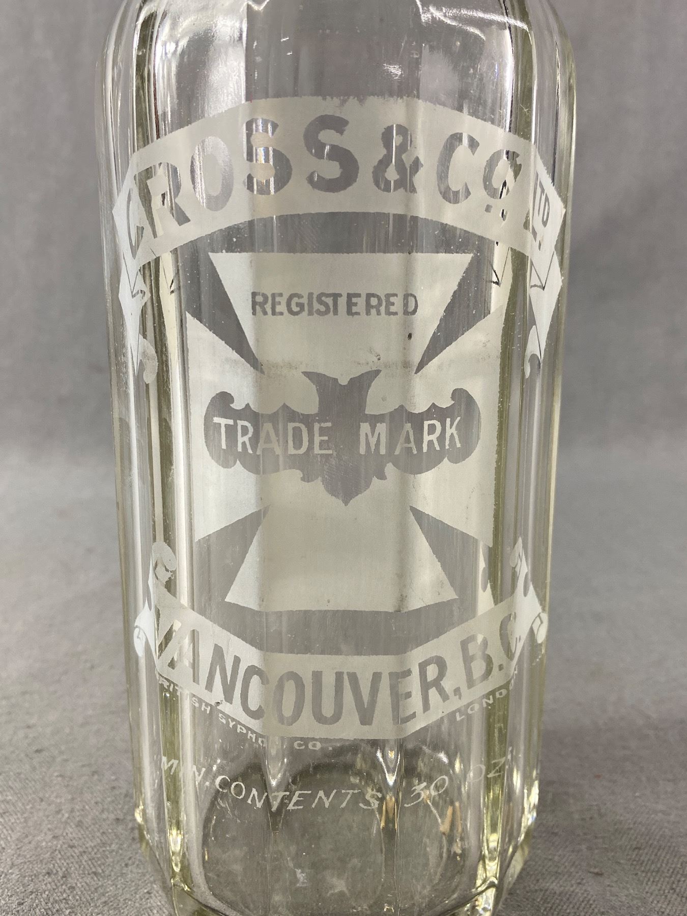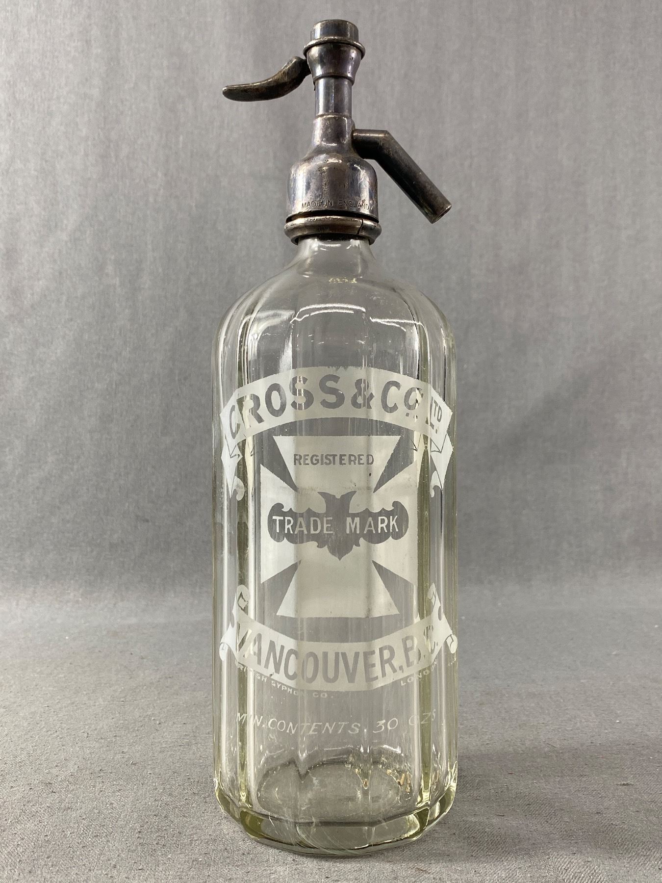Vintage Cross & Co. Ltd. Vancouver B.C. Seltzer Glass Bottle w/Spout. Approx. 12.5"H