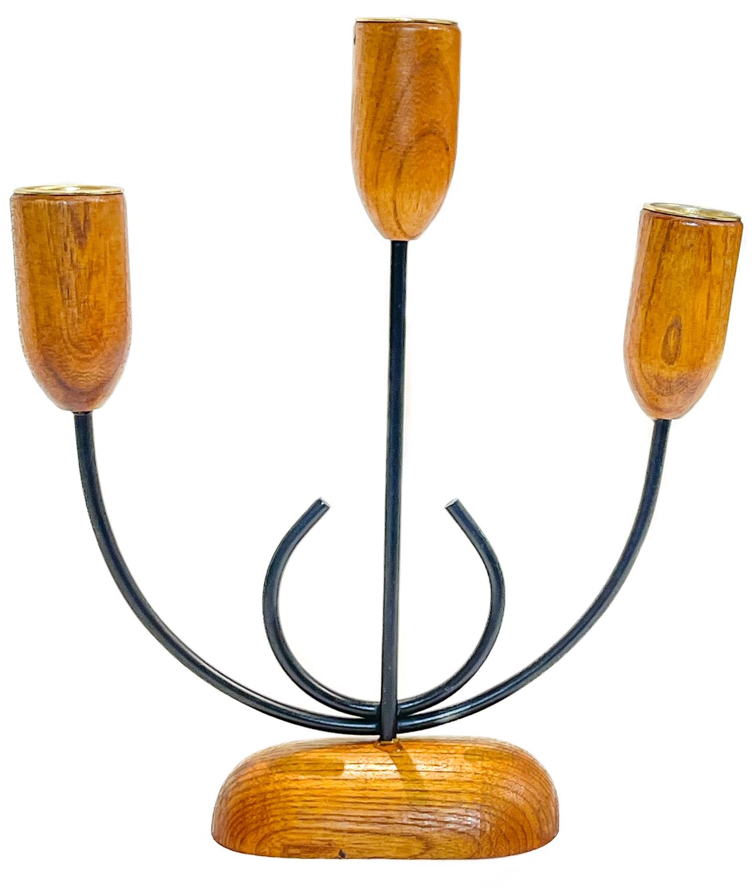 Elegant mid-century modern 3-arm candelabra featuring solid teak candle cups and base with curved black wrought iron arms. Distinctive Danish modern styling with warm wood tones and minimalist lines, reminiscent of designs by Digsmed and Laurids Lønborg. A striking sculptural centerpiece in excellent vintage condition with only minor wear consistent with age. Holds three taper candles.