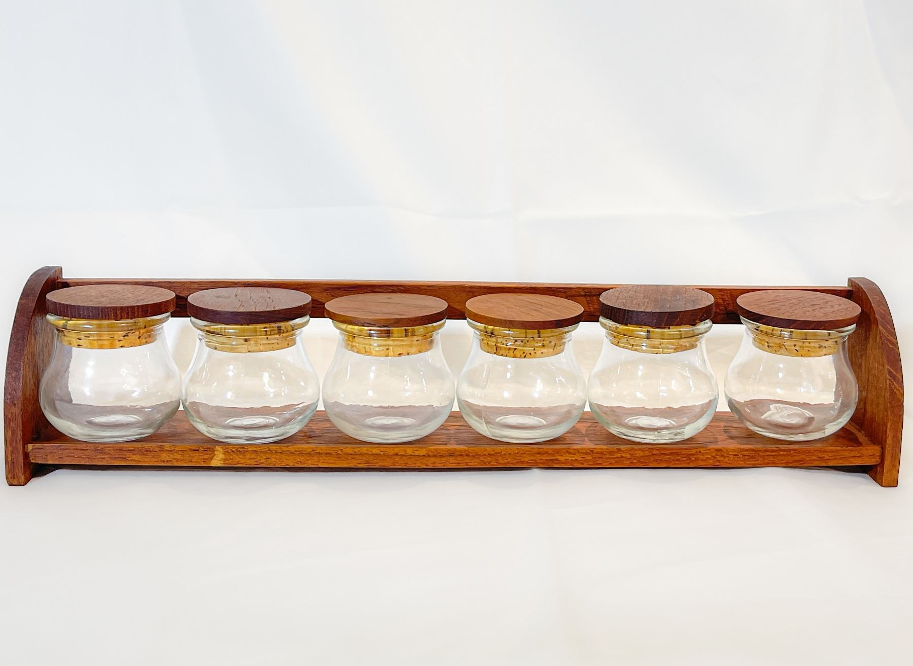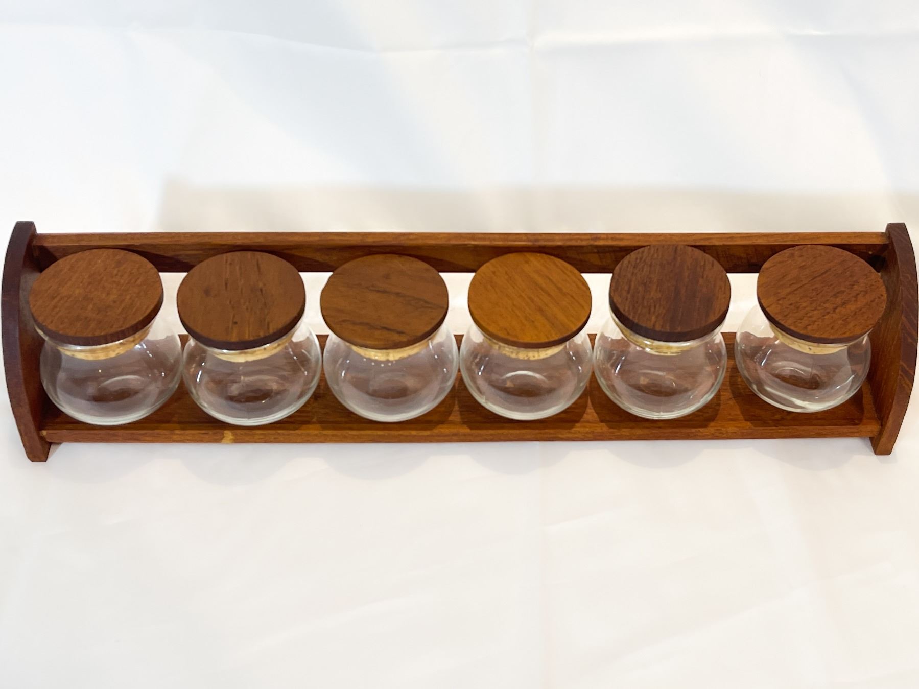 Exceptional vintage Danish mid-century modern teak and glass spice jar set with five jars and fitted rack, attributed to Digsmed. Each jar features a solid teak lid and cork seal, resting in a beautifully crafted teak holder. Highly collectible and sought after for its timeless Scandinavian design and craftsmanship. Excellent vintage condition with minimal wear — a stunning functional display piece for any MCM kitchen or collector.