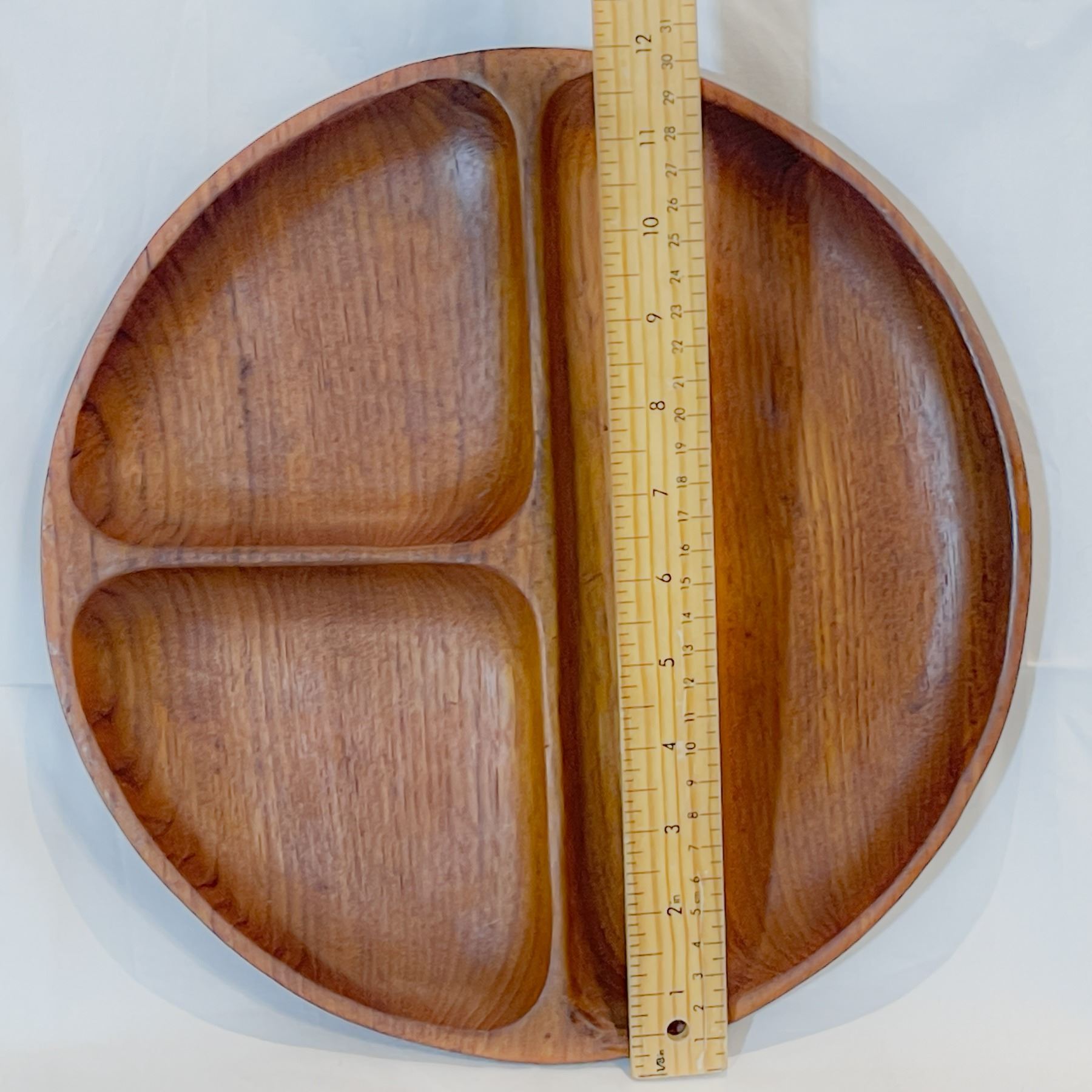 Vintage Dansk teak divided serving tray measuring approximately 12 inches in diameter, beautifully handcrafted and stamped on the underside with the faint green “Dansk Designs Denmark” mark typical of early production from the 1950s–60s. Designed in the style of Jens H. Quistgaard, this mid-century modern piece features smooth sculpted sections and rich teak grain, perfect for serving snacks or appetizers. Excellent vintage condition with only light wear consistent with age, showcasing the timeless elegance and craftsmanship of early Scandinavian design.