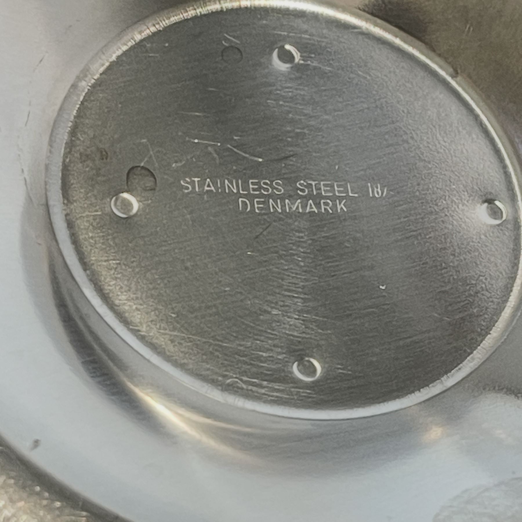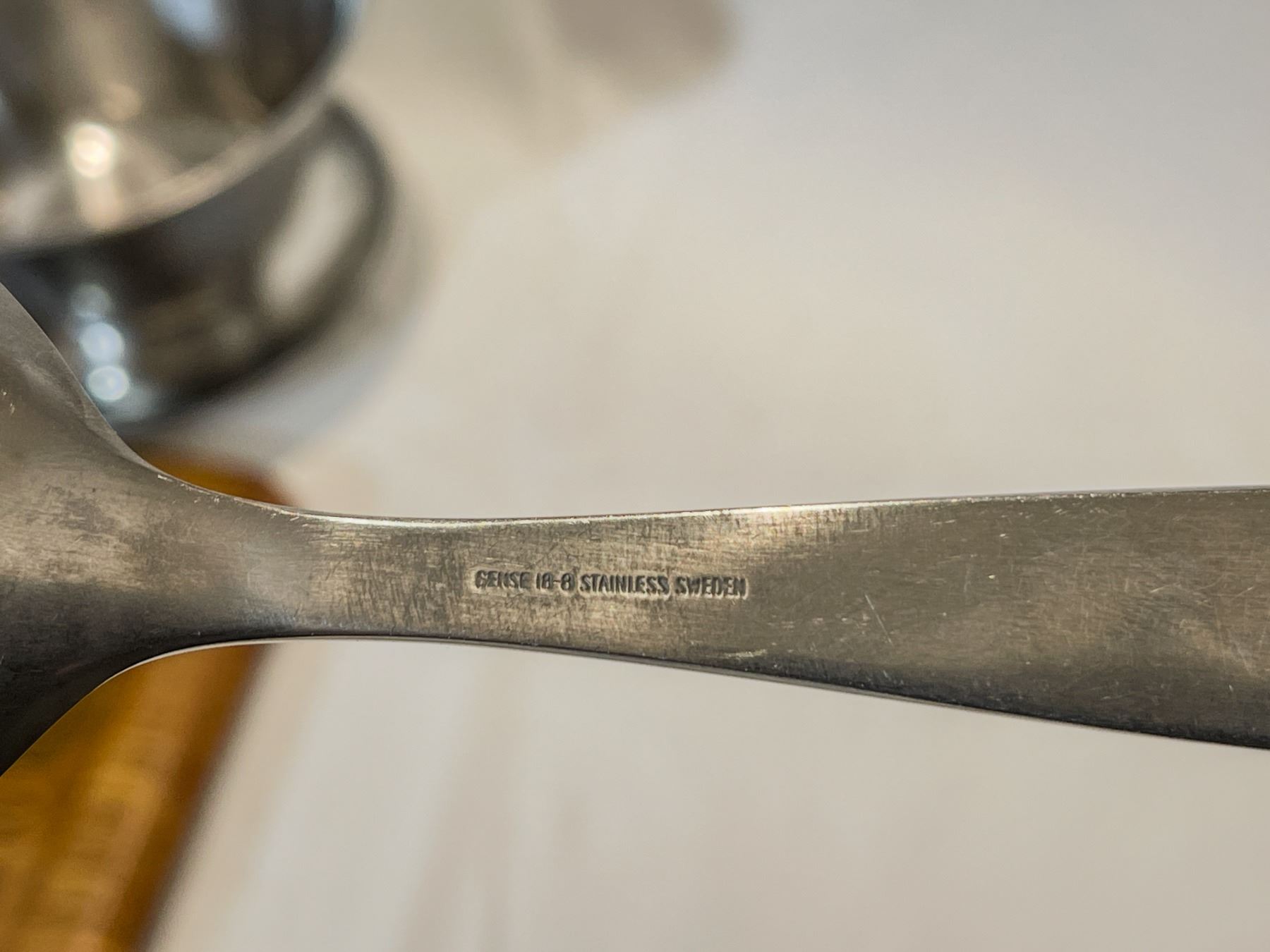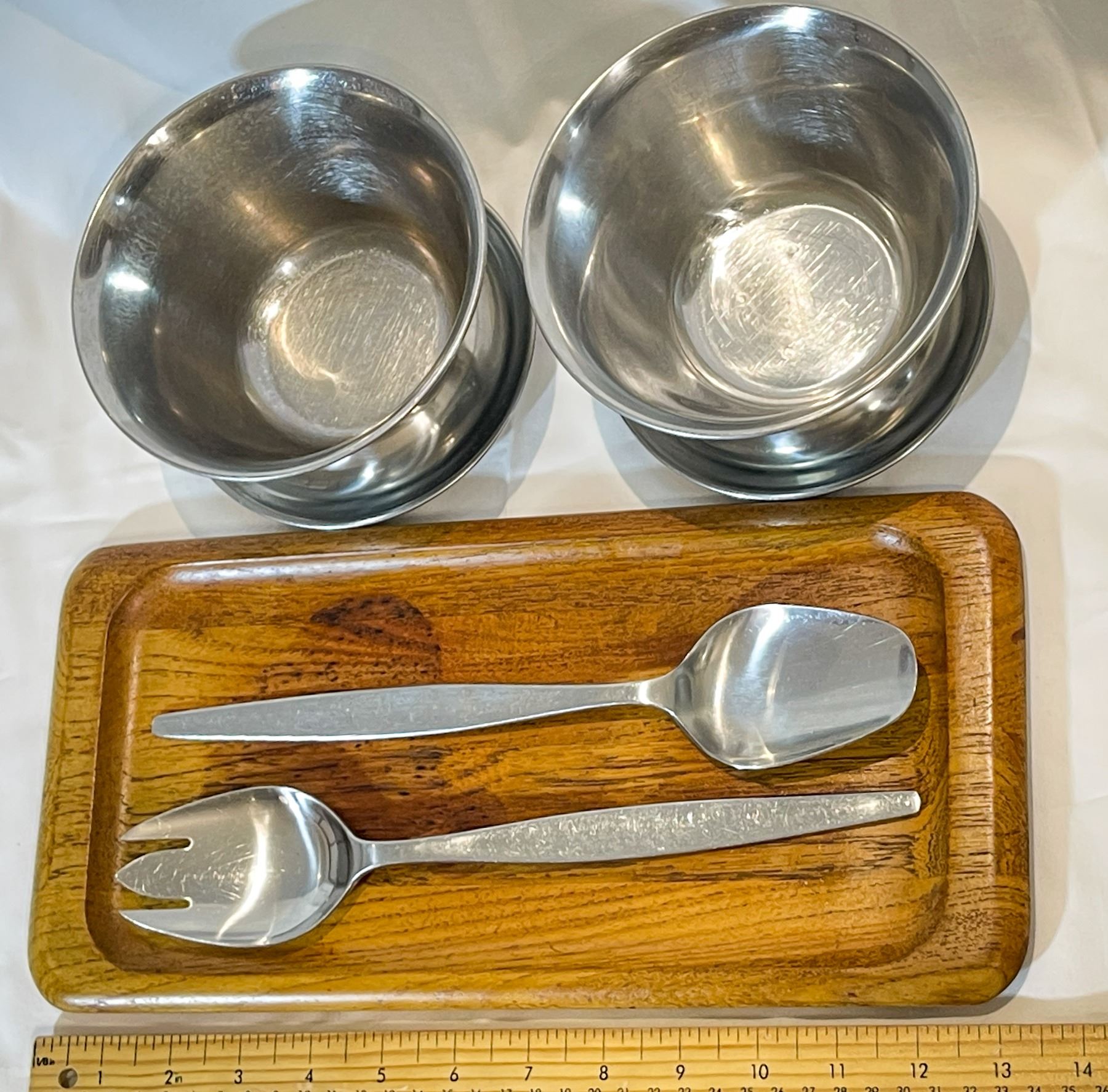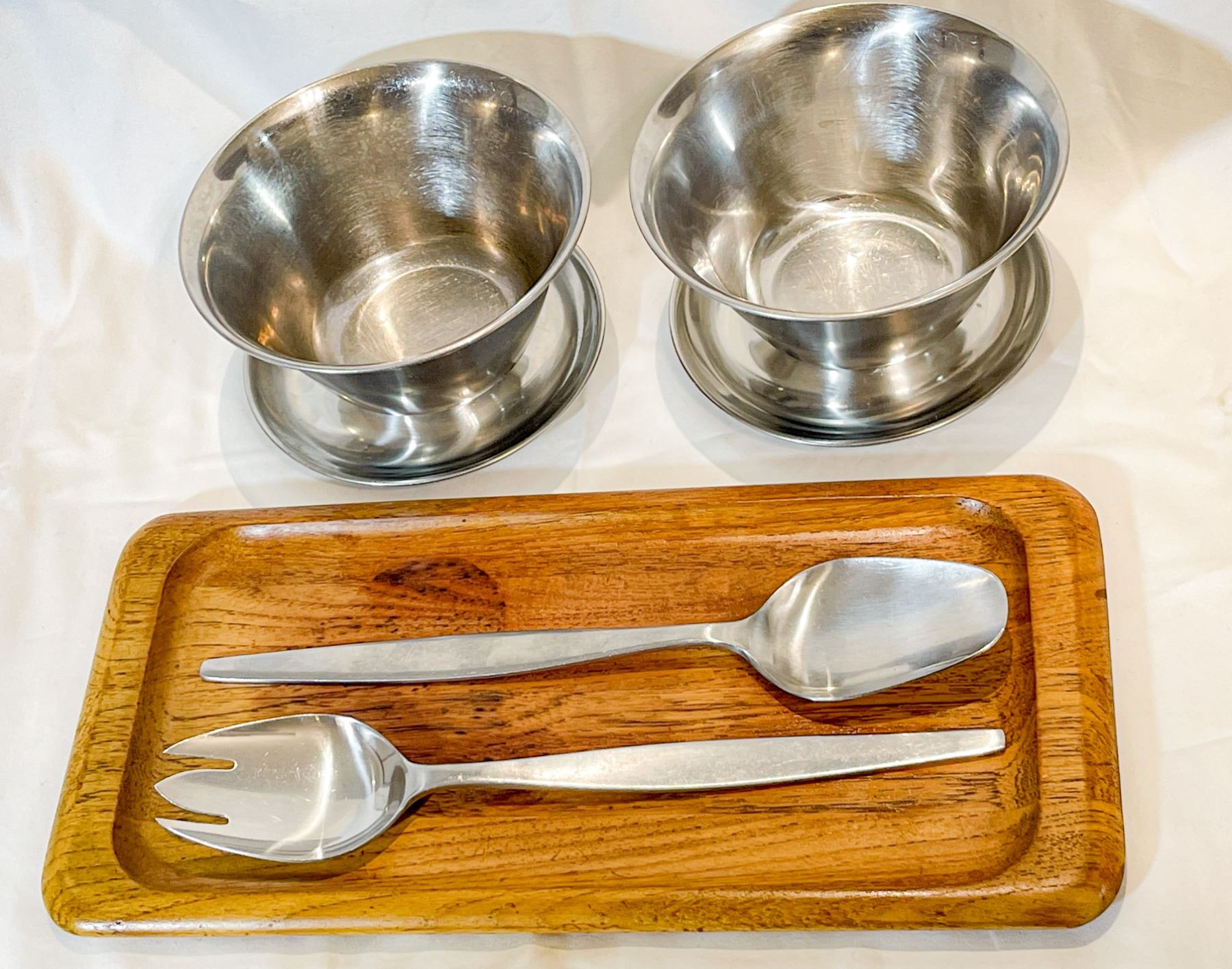 Beautiful mid-century modern serving set featuring a Digsmed Denmark solid teak tray (signed on base), paired with two Danish 18/8 stainless steel serving bowls and a matching Gense Sweden 18/8 stainless salad fork and spoon set. The combination of sculpted teak and brushed steel embodies classic Scandinavian design and craftsmanship. Tray measures approx. 13.5" long. All pieces in very good vintage condition with light wear consistent with age.