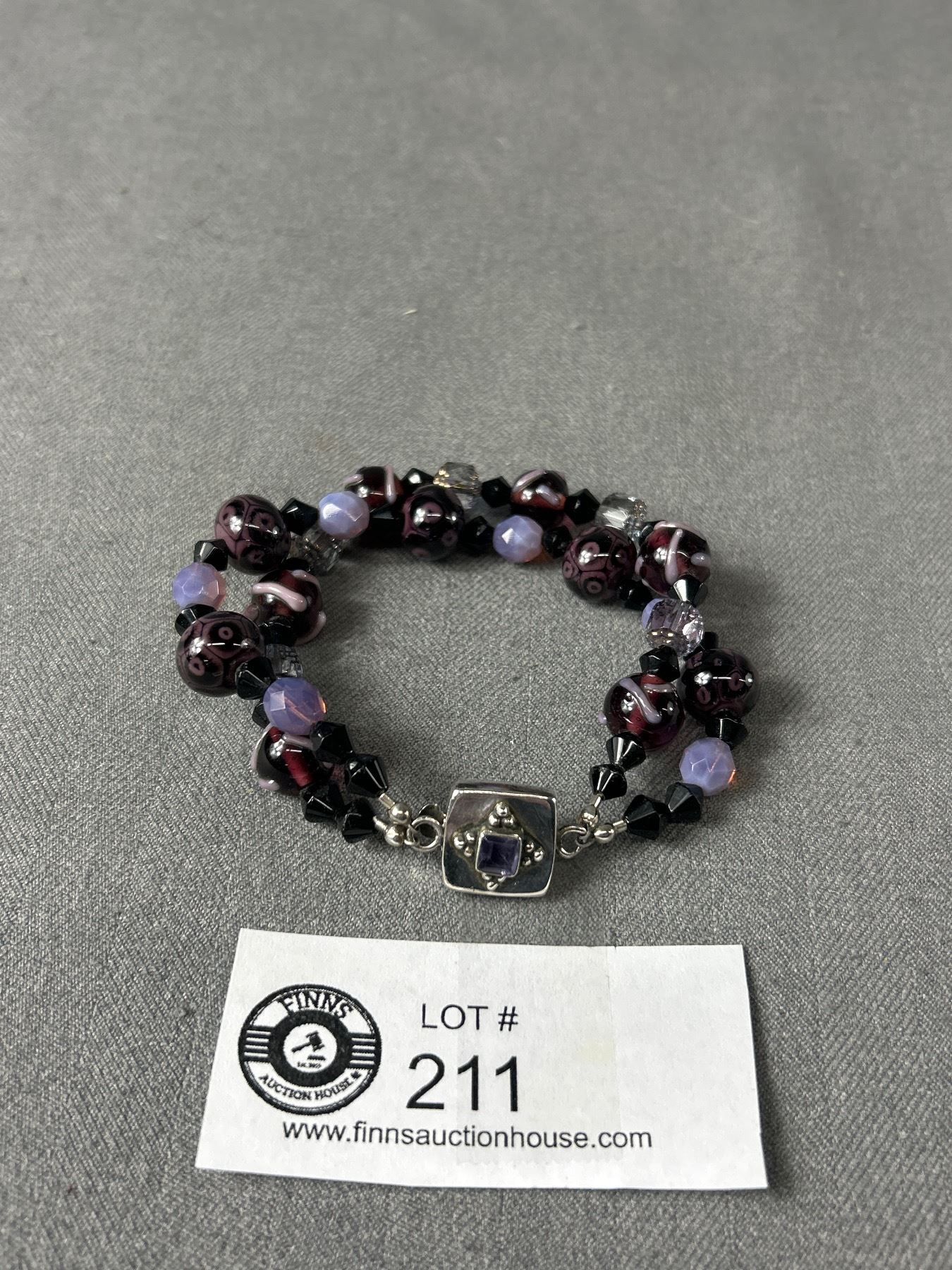 Vintage Double Strand Art Glass Bead Bracelet, Sterling Silver Amethyst Box Clasp - Tested