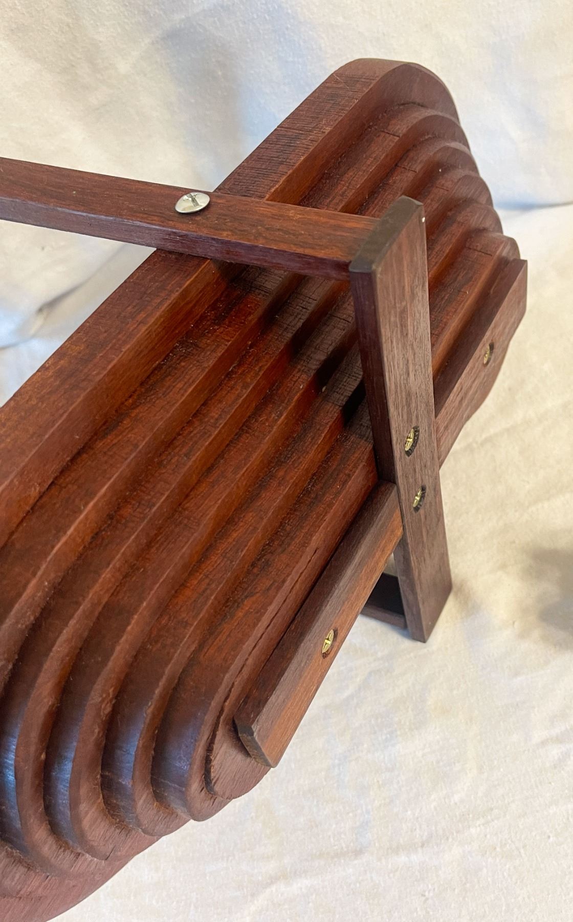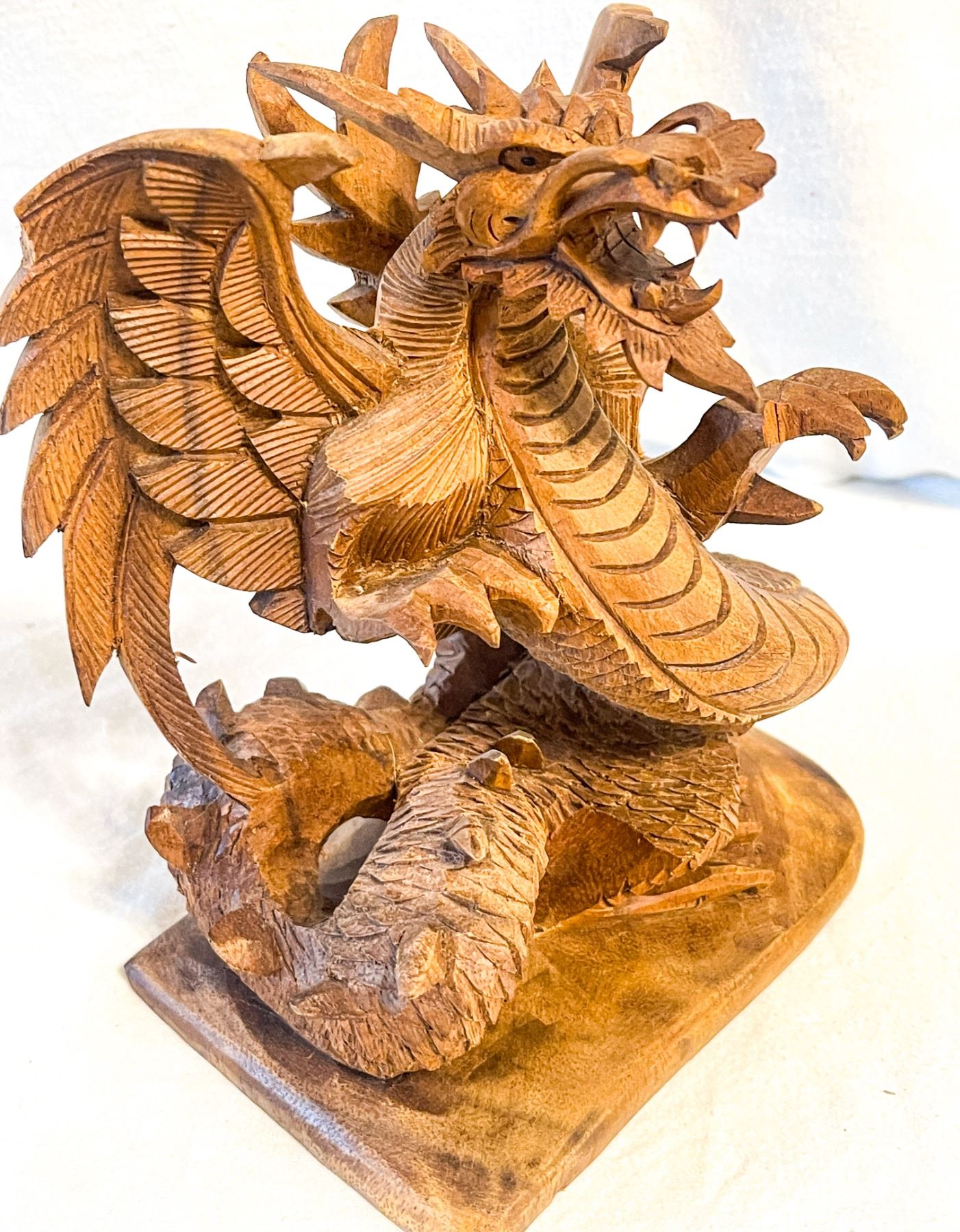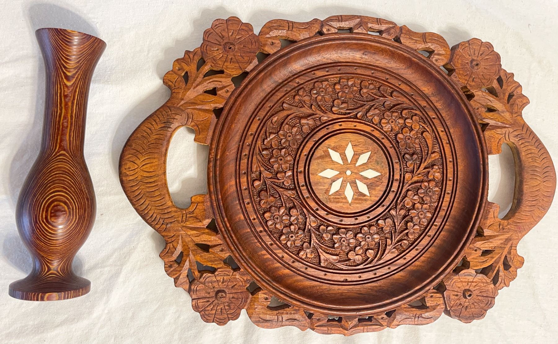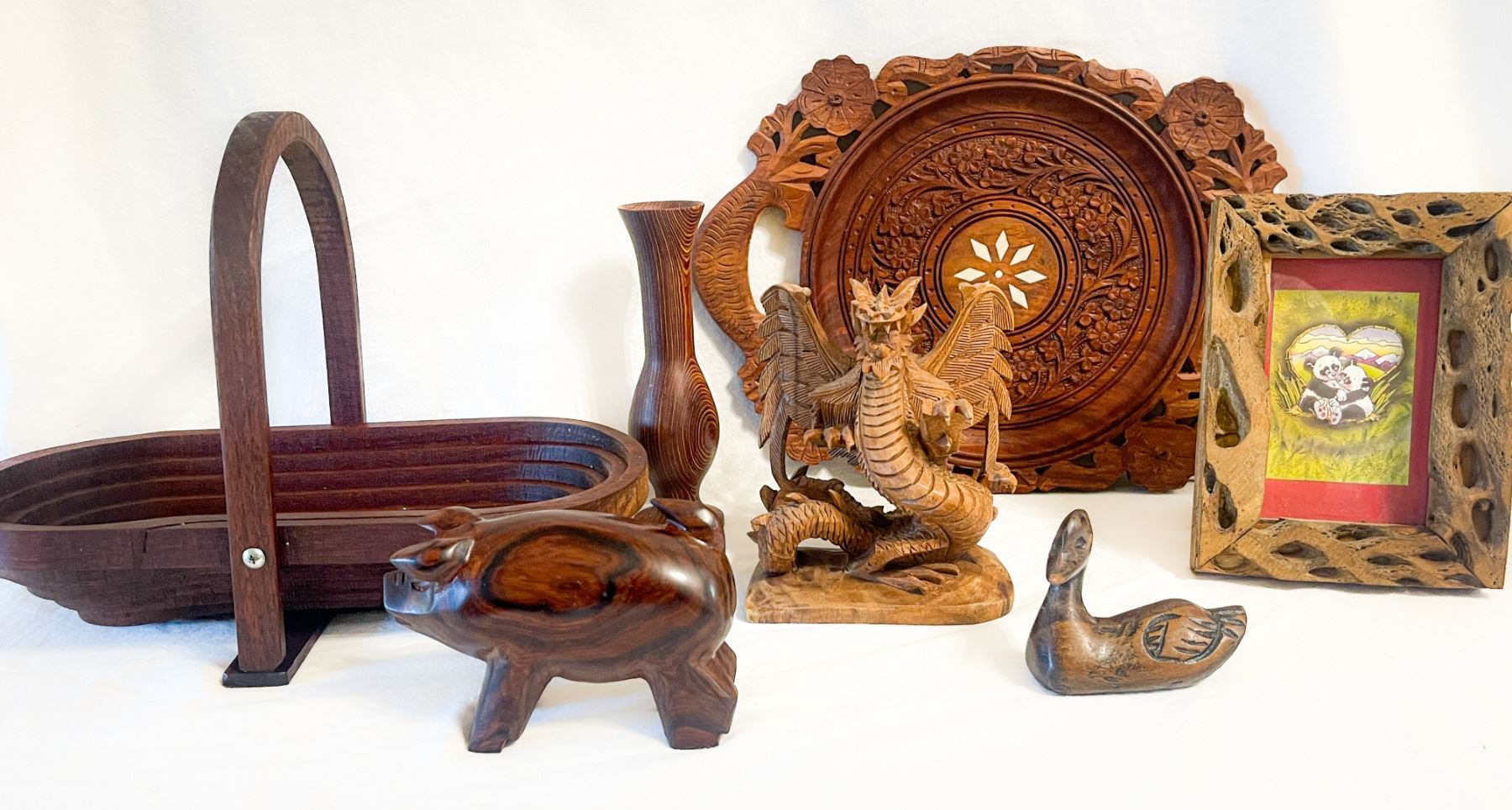 Collection of vintage carved and turned wood decor including a detailed dragon sculpture, carved floral tray with inlay, collapsible basket, animal figures, and a vase.