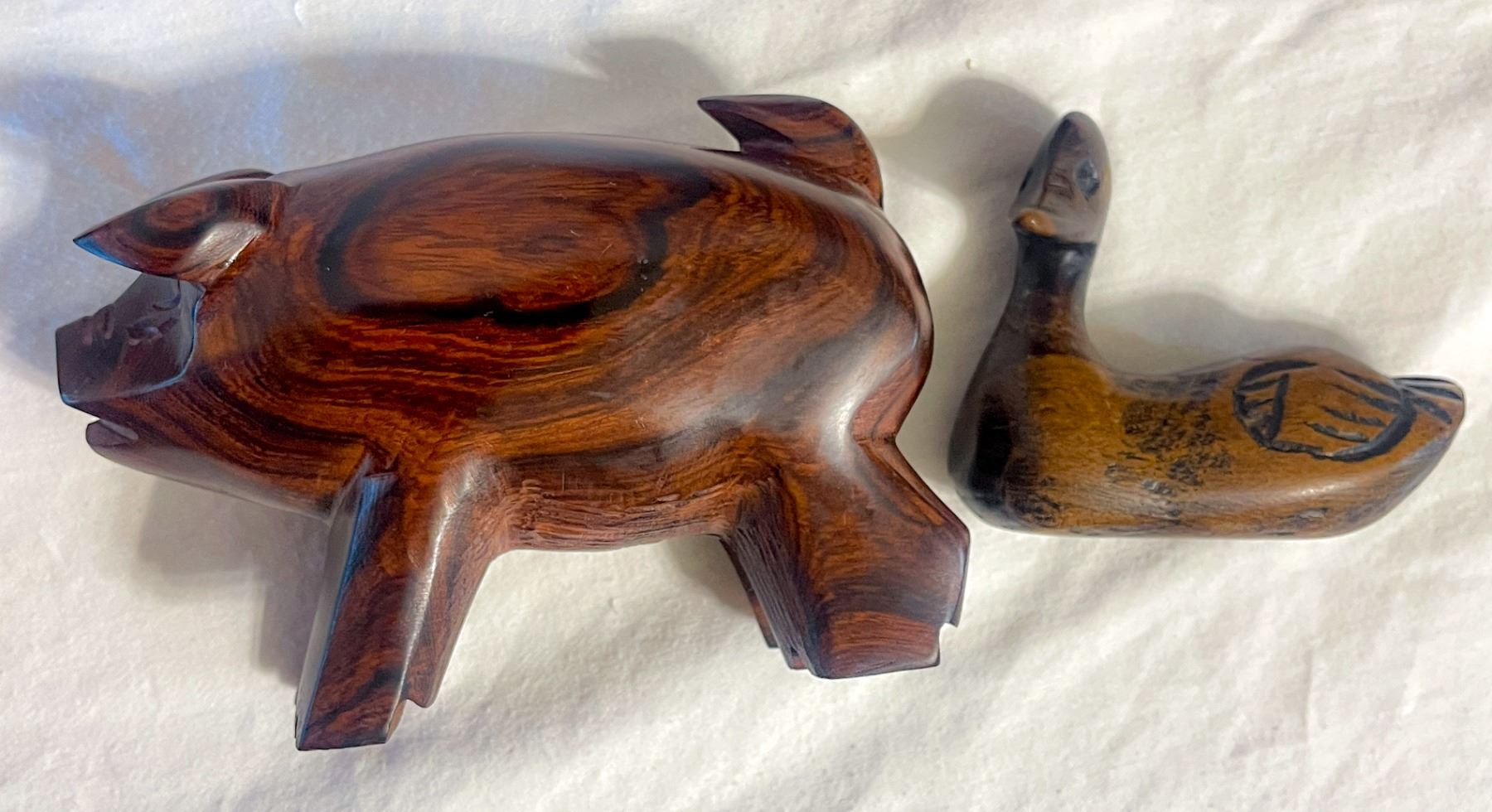 Vintage Eclectic wood carved items – Dragon, Pig, Swan, Basket & Inlaid Tray