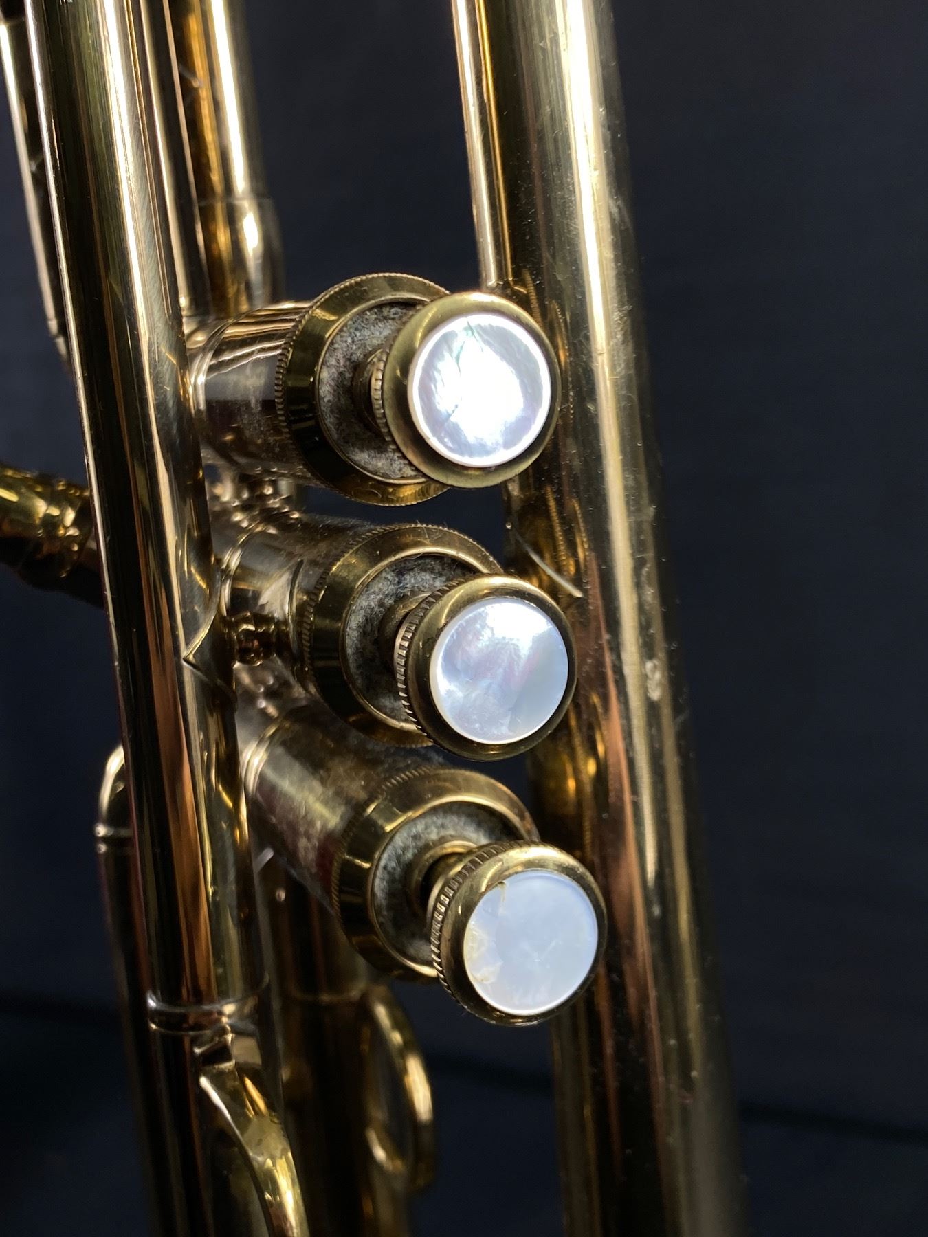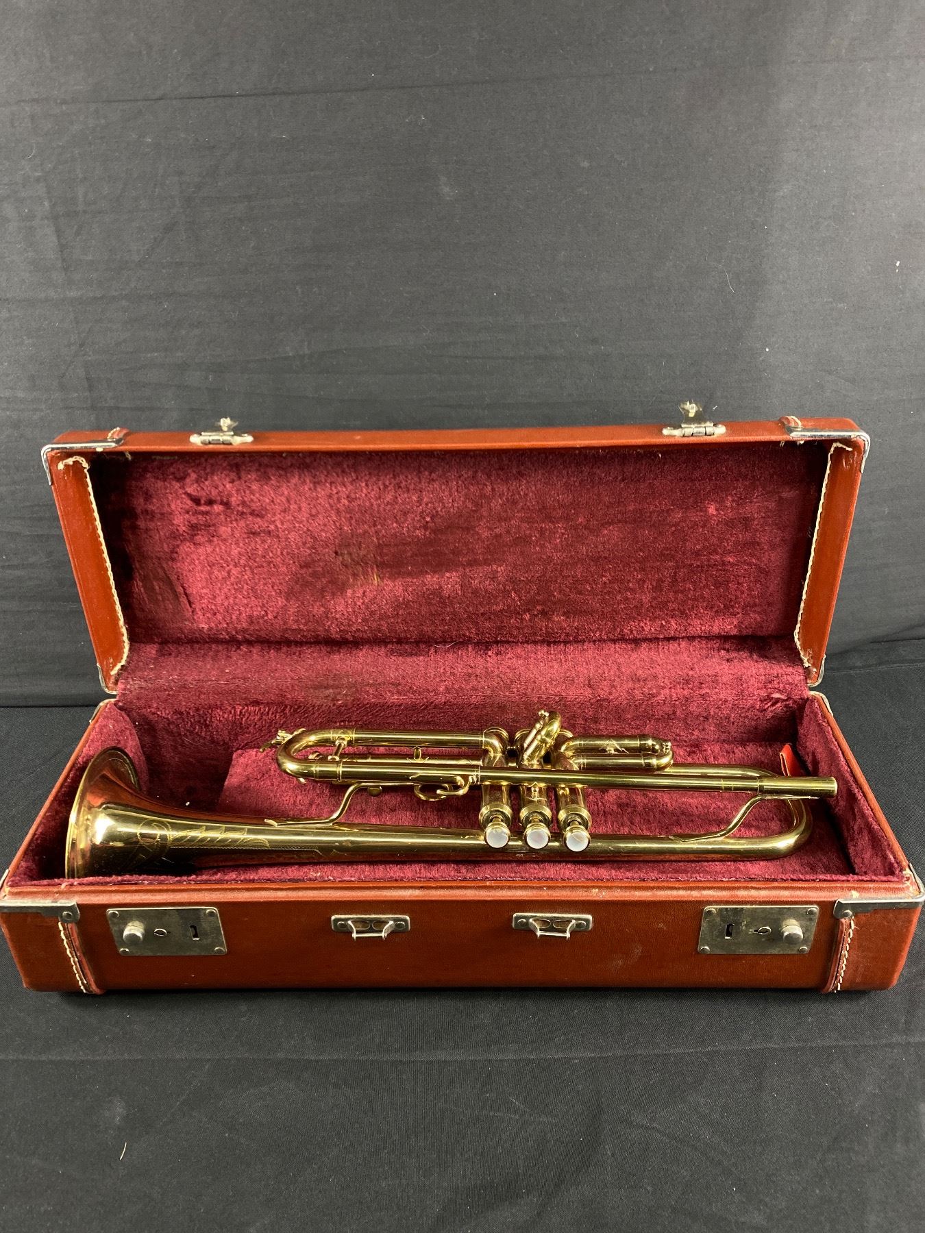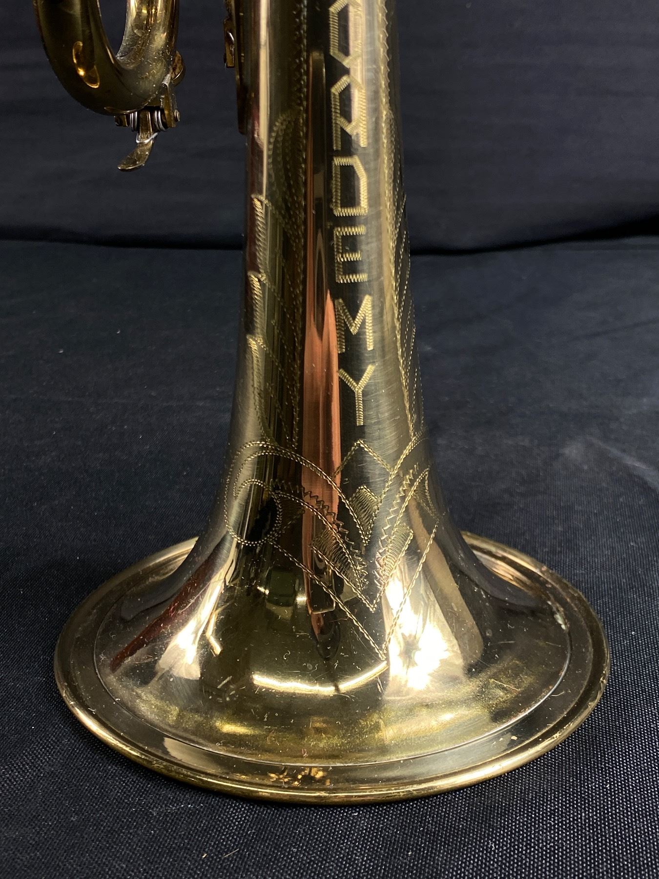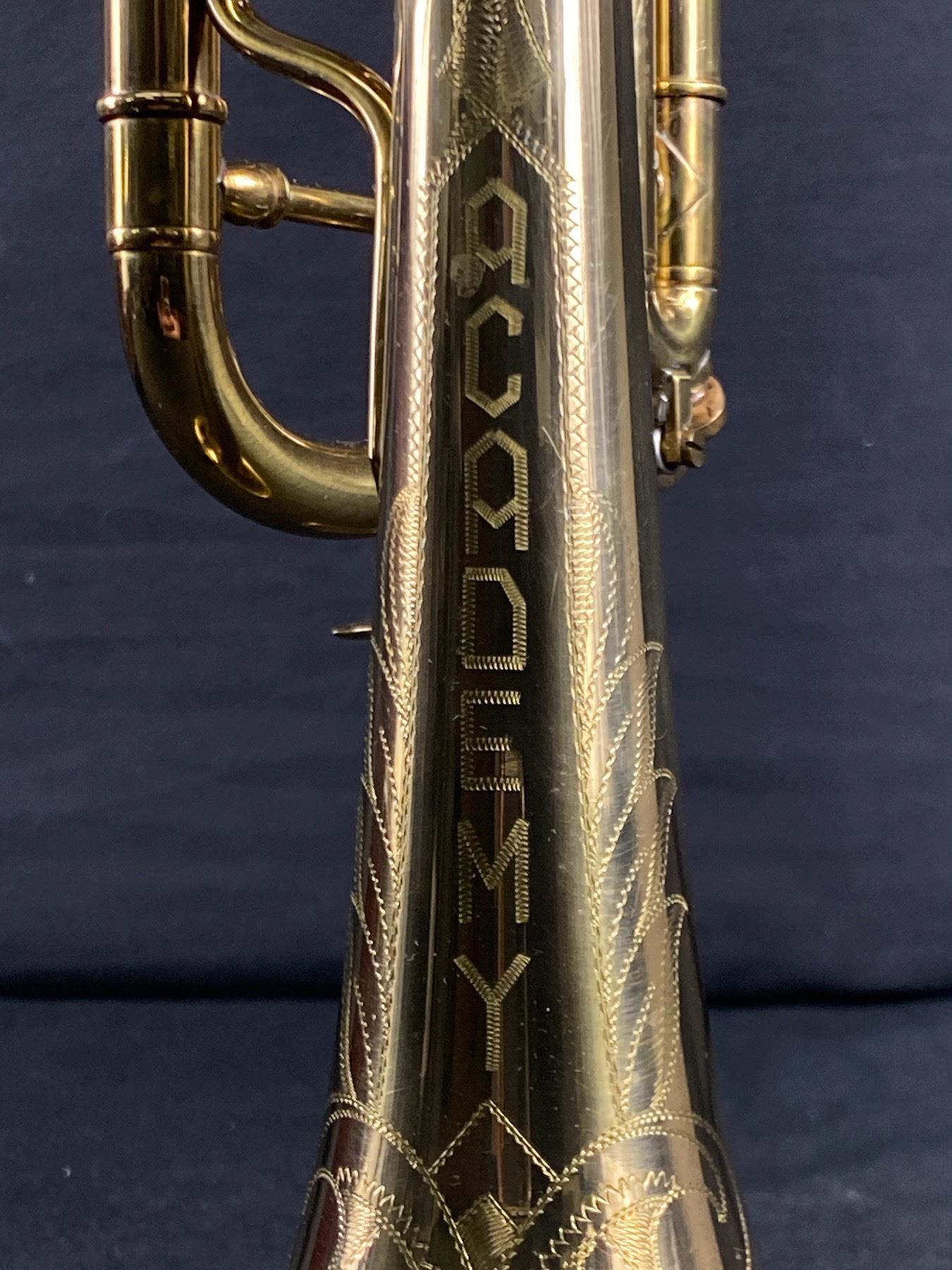 Vintage Engraved Academy Brass Trumpet w/ Mother Of Pearl Accents On Buttons. Comes In Case.