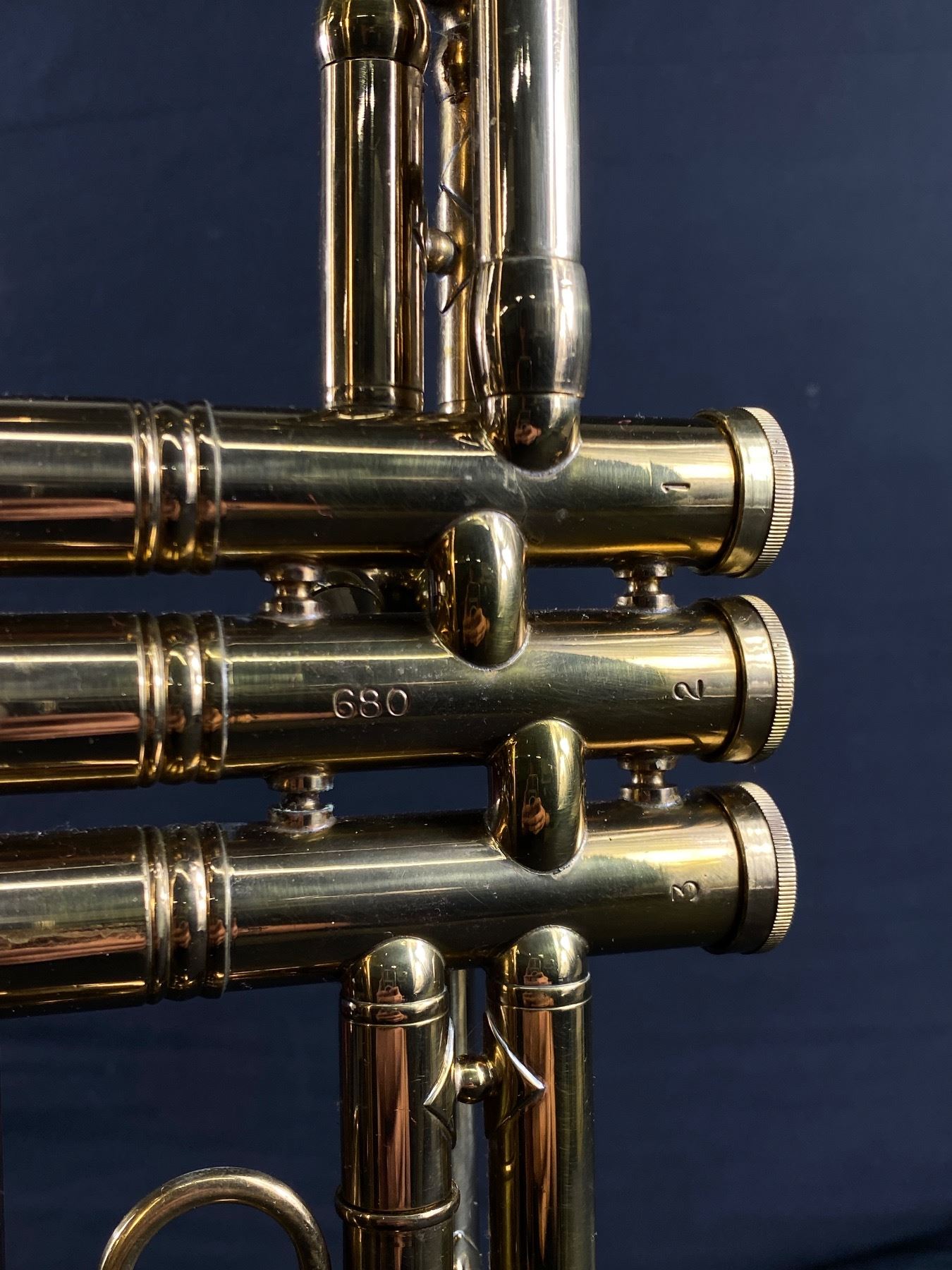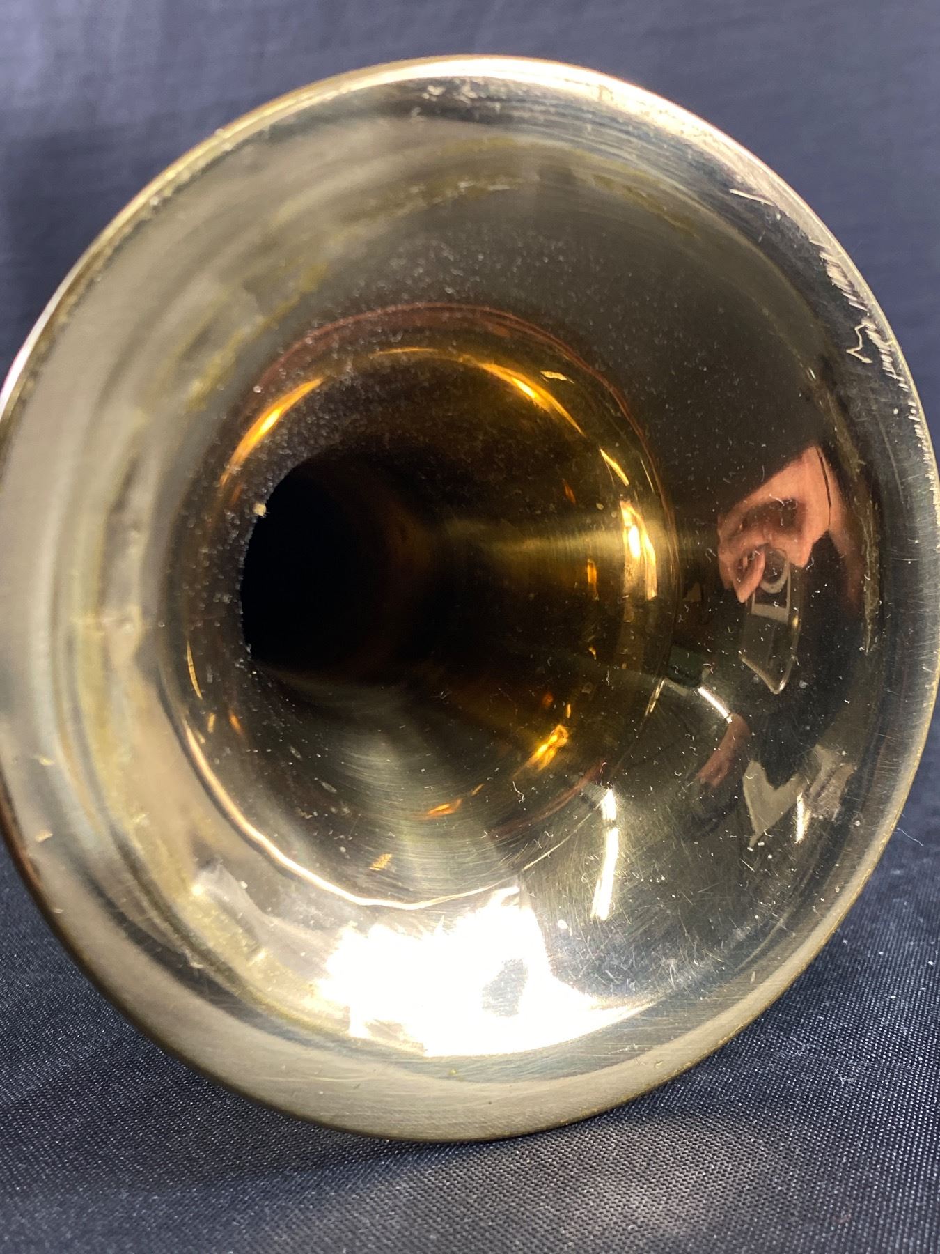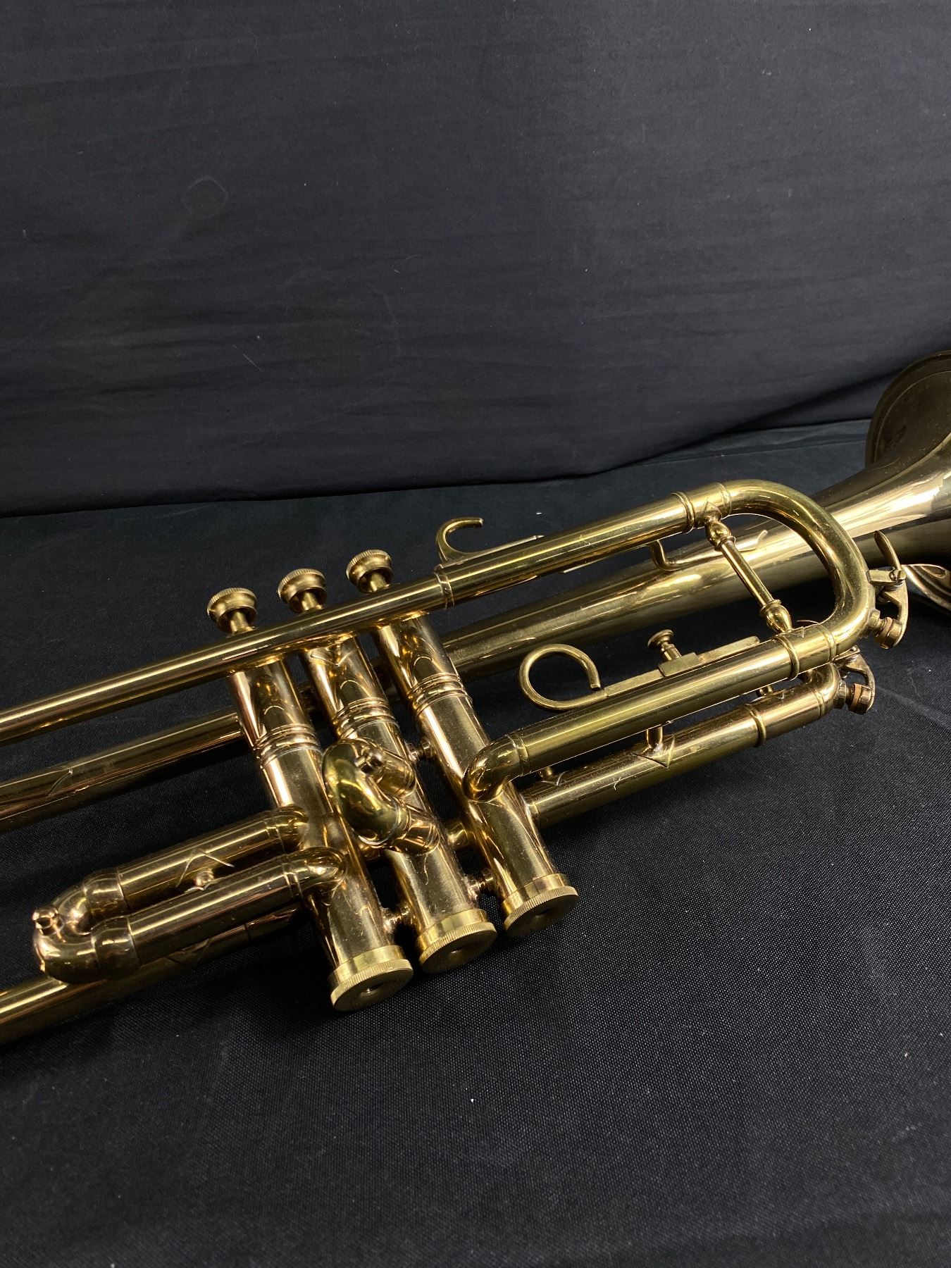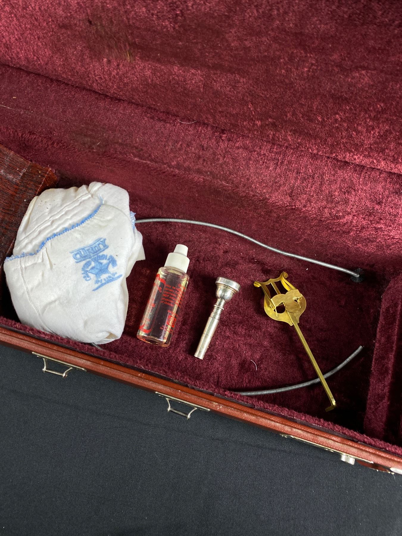 Vintage Engraved Academy Brass Trumpet w/ Mother Of Pearl Accents On Buttons. Comes In Case.