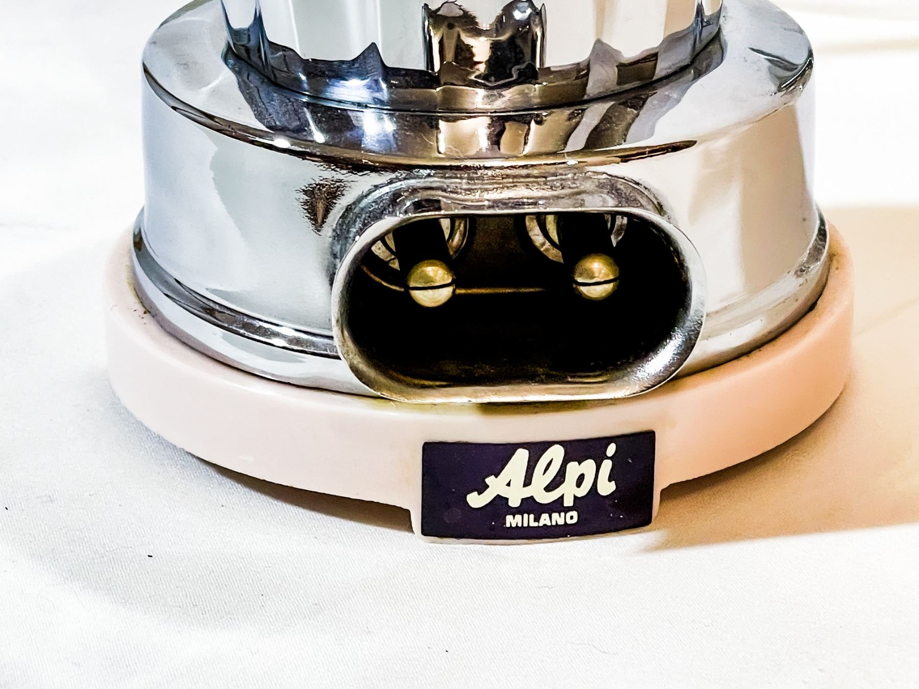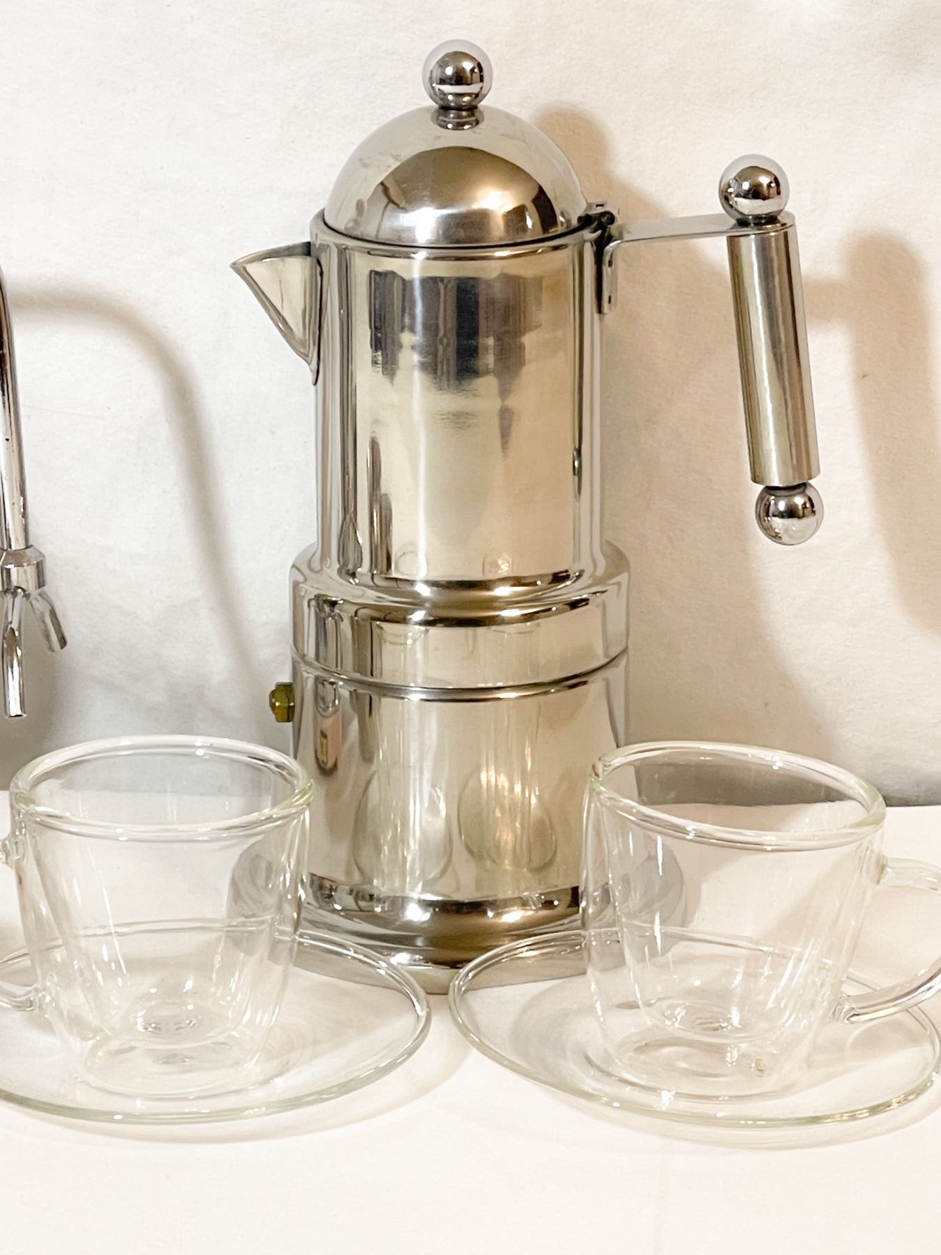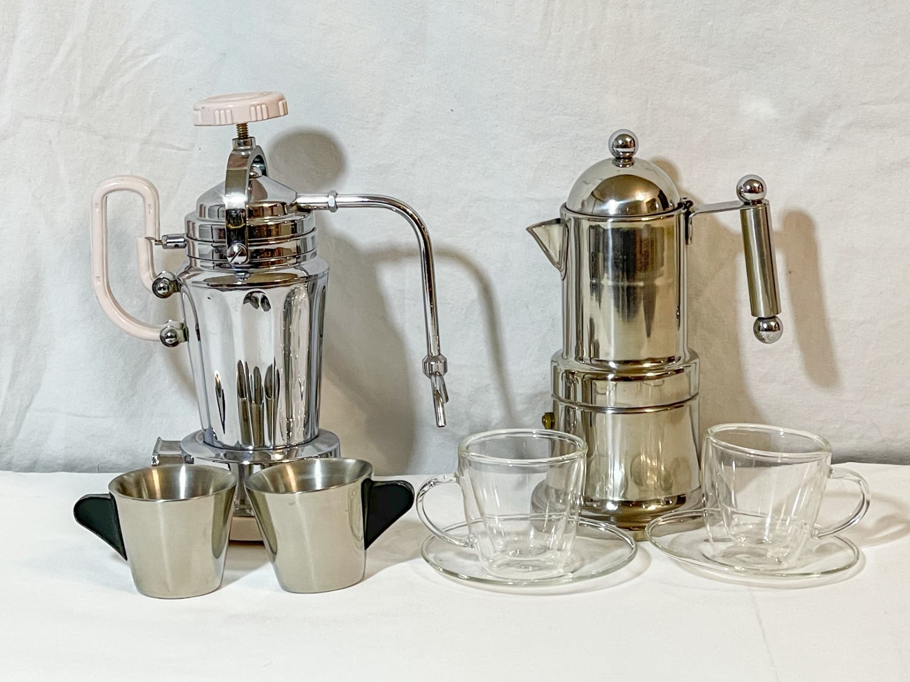 Beautiful mid-century espresso collection featuring a decorative Alpo electric espresso maker (missing cord) and a functional Vev Vigano “Kontessa” stovetop espresso maker. Includes two elegant vintage espresso cup sets—one double-walled stainless steel, one double-walled glass.