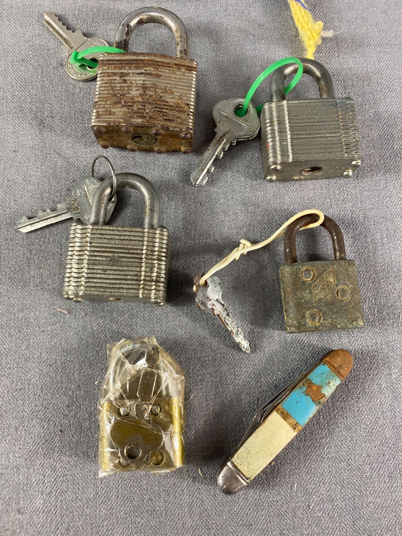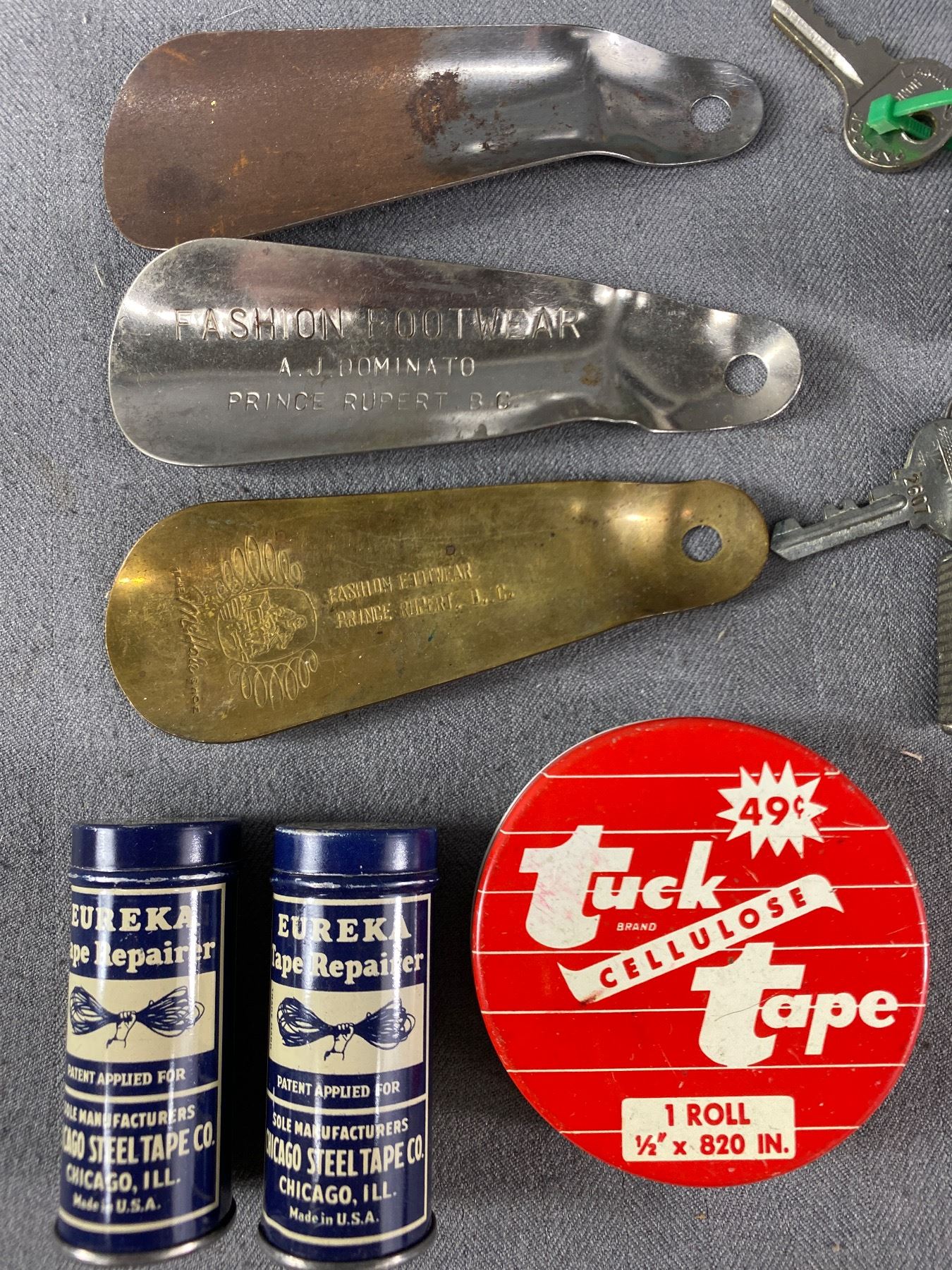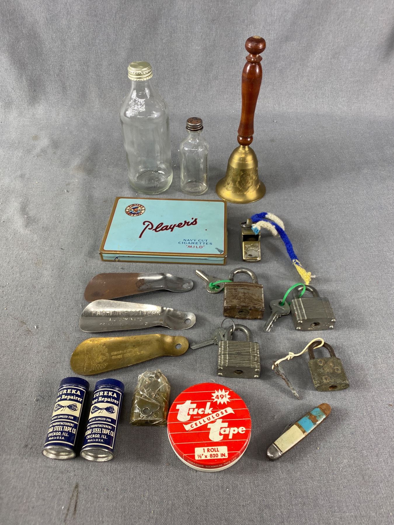 Vintage Finds - 8" Brass Bell w/ Wood Handle, Locks w/Keys, Shoe Horns, Tape Tins & More