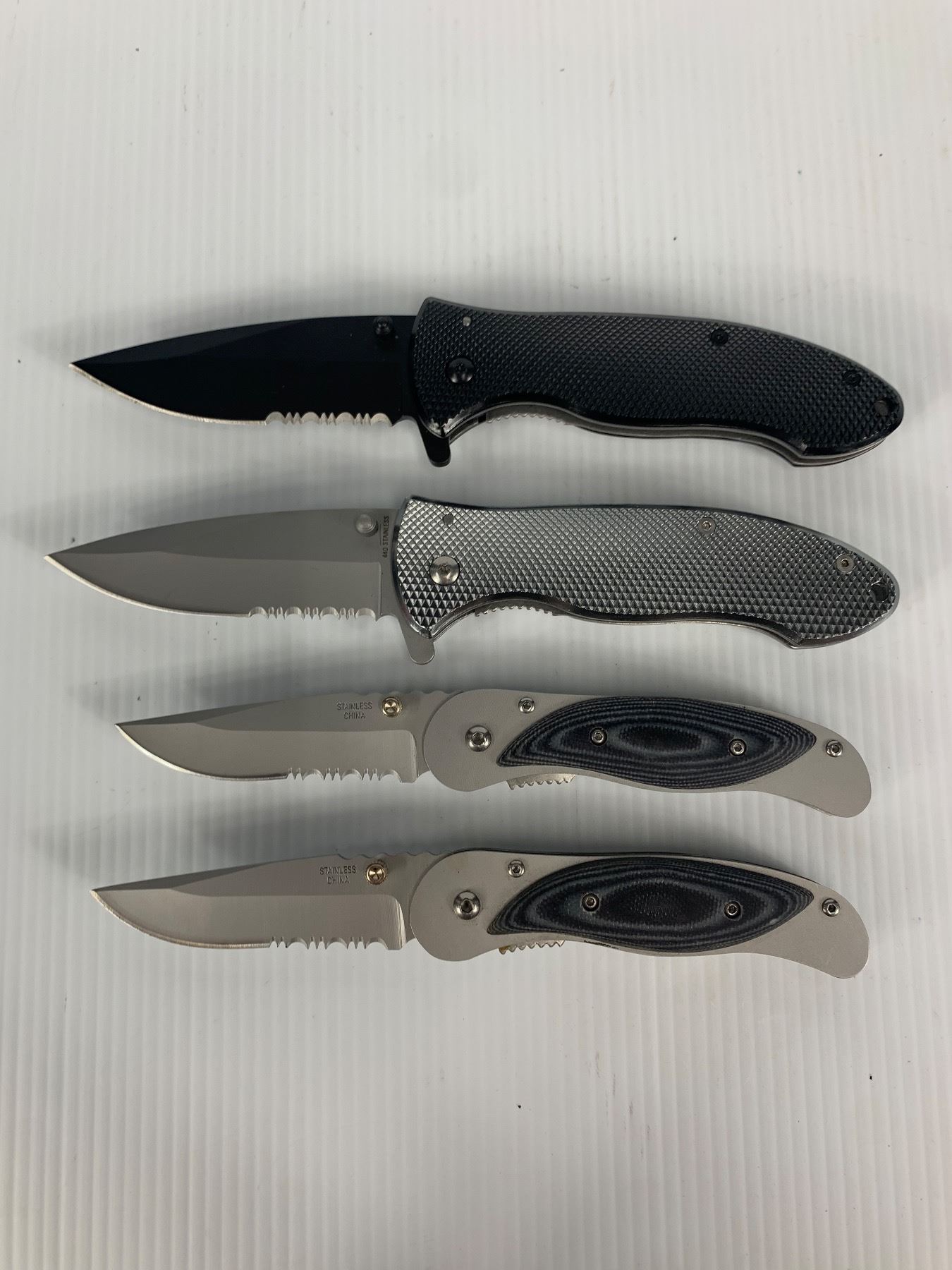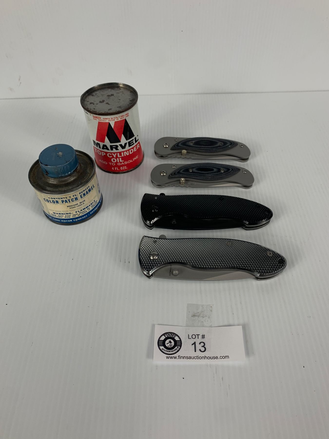 Vintage Ford and Marvel Tin Plus 4 New Pocket Knives