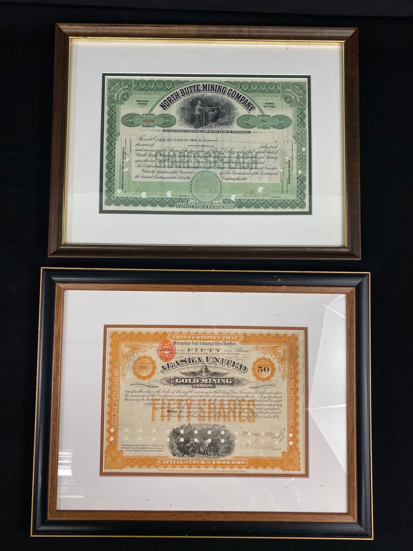 Vintage Framed North Butte Mining Company Shares Certificate & Alaska United Gold Mining Company