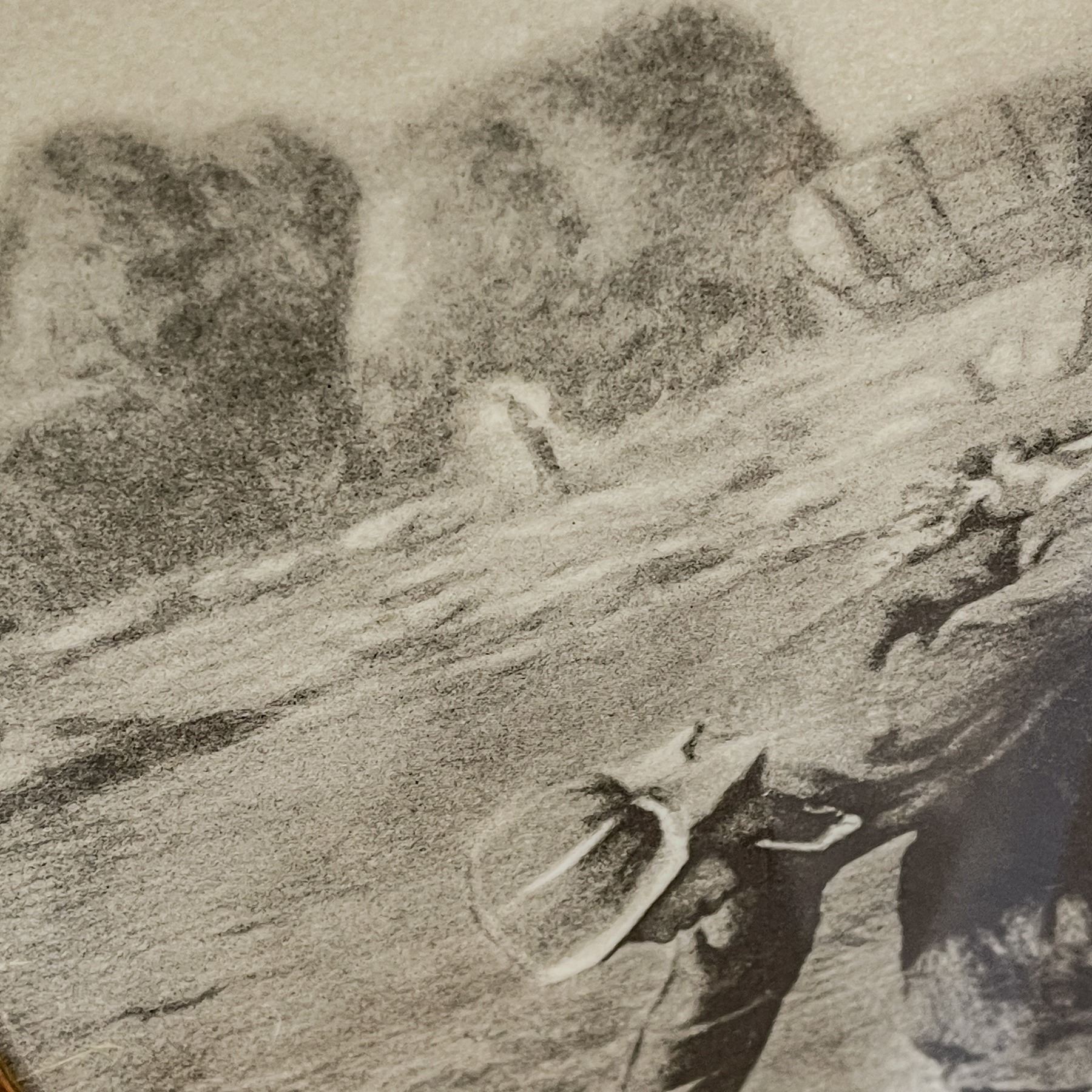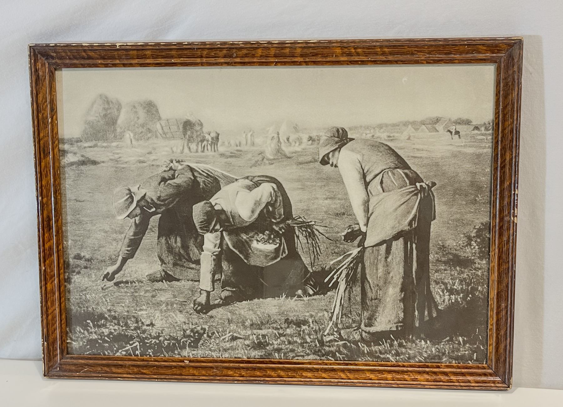 Classic vintage print depicting The Gleaners, based on the iconic 1857 painting by Jean-François Millet. The image portrays three women gathering leftover grain in a rural field, symbolizing the dignity of labor and rustic life. Housed in an aged wood frame with visible wear that adds to its vintage charm. Ready to hang.