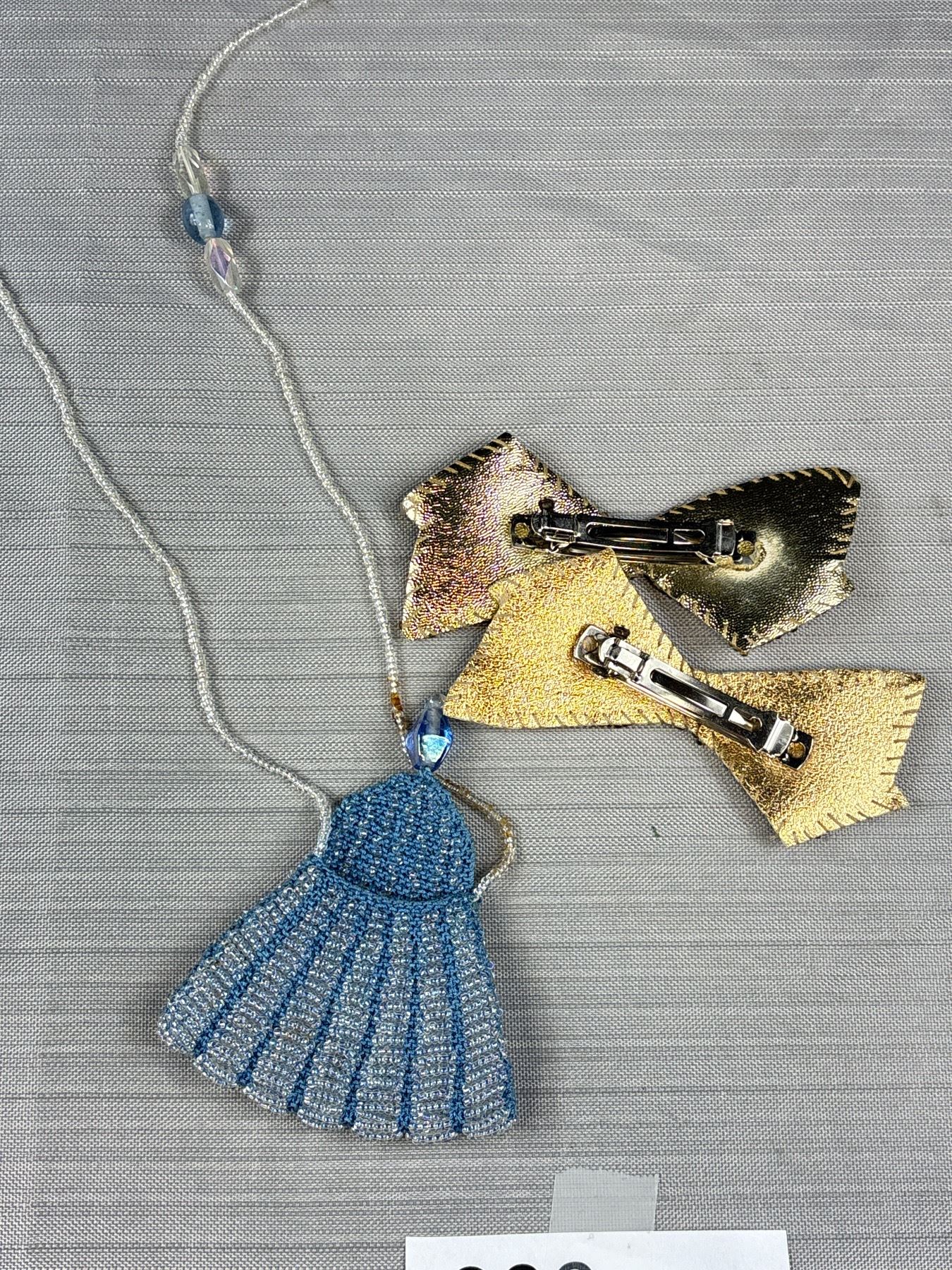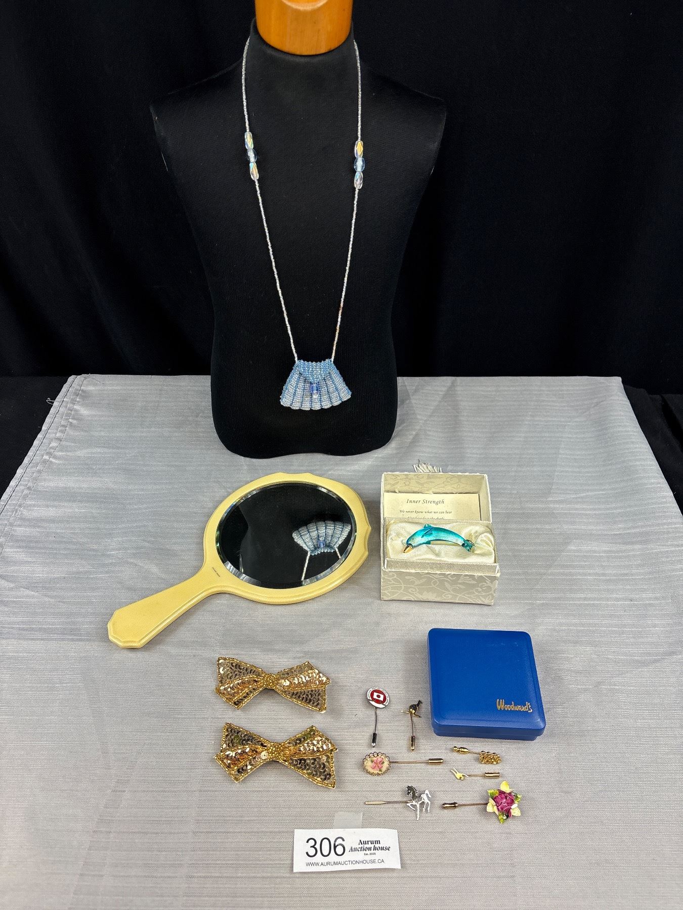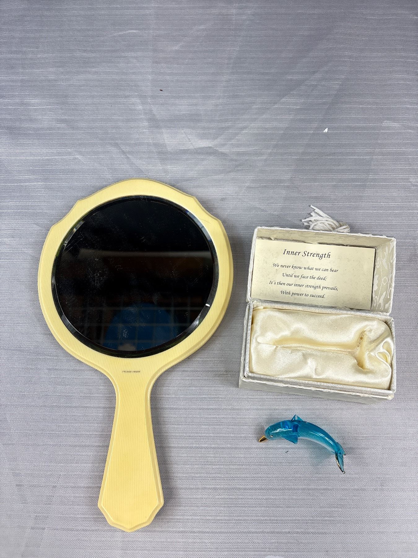 Vintage French Ivory Mirror, Micro Beads Bag Necklace, Pair of Barrettes, Woodwards Box w/ Contents + Inner Strength Glass Ornament, Slightly Damaged
