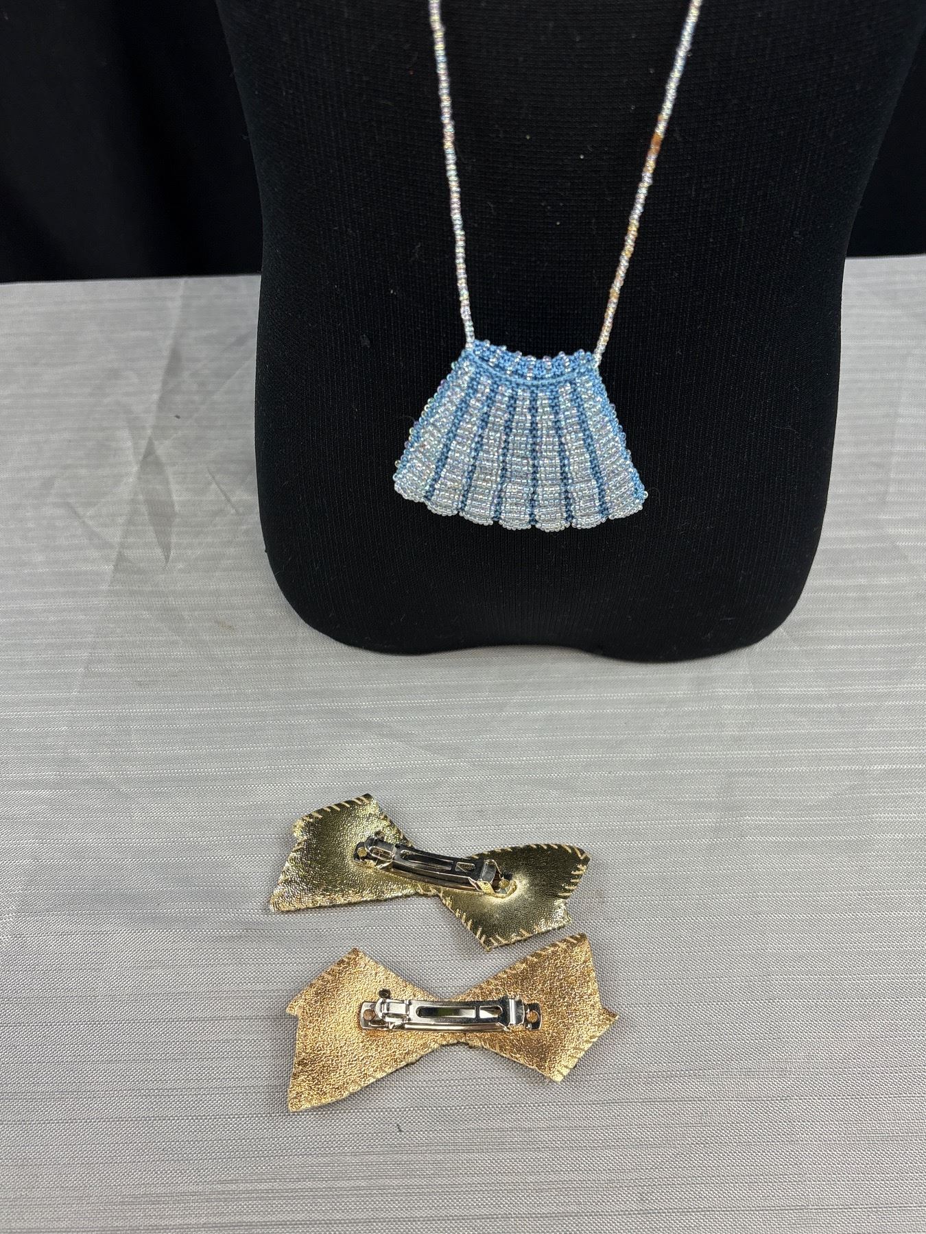 Vintage French Ivory Mirror, Micro Beads Bag Necklace, Pair of Barrettes, Woodwards Box w/ Contents