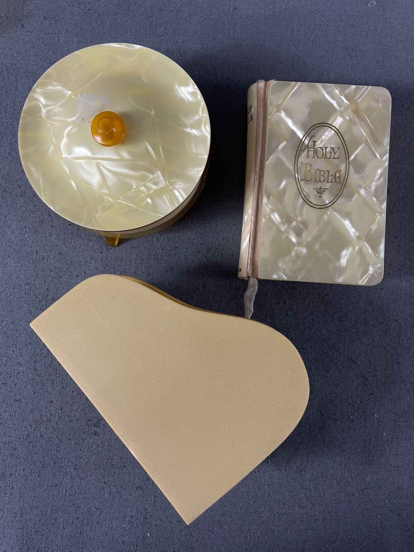 Vintage French Ivory Piano Trinket Box, 4.5" L Bible w/ Lucite Cover & 4" Diam. Lucite? Powder Dish w/ Lid