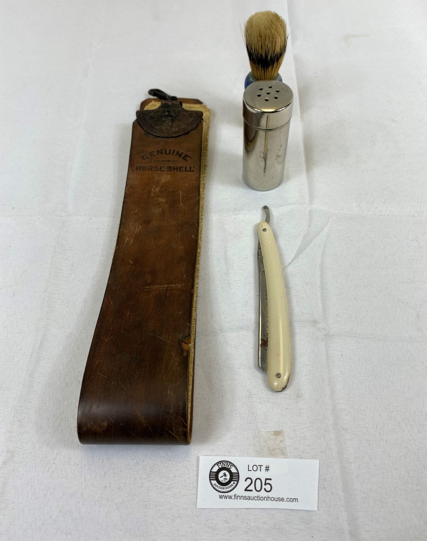 Vintage Genuine Horse Shell Pace Belting Co. NH Strop, Utica Solingen Germany Straight Razor, Stag Brush And Chrome Stick Holder