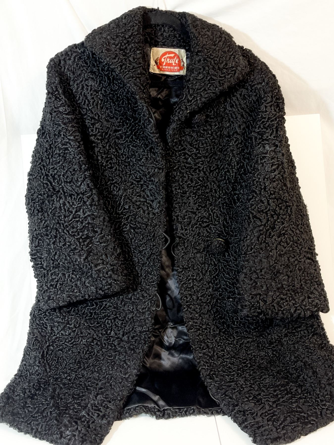 Luxurious vintage black Persian lamb fur coat from Trute Furriers, Saskatoon. Features the signature tight, lustrous curls characteristic of high-quality Karakul lamb pelts, fully lined in satin, with a classic mid-century silhouette. Size small.
