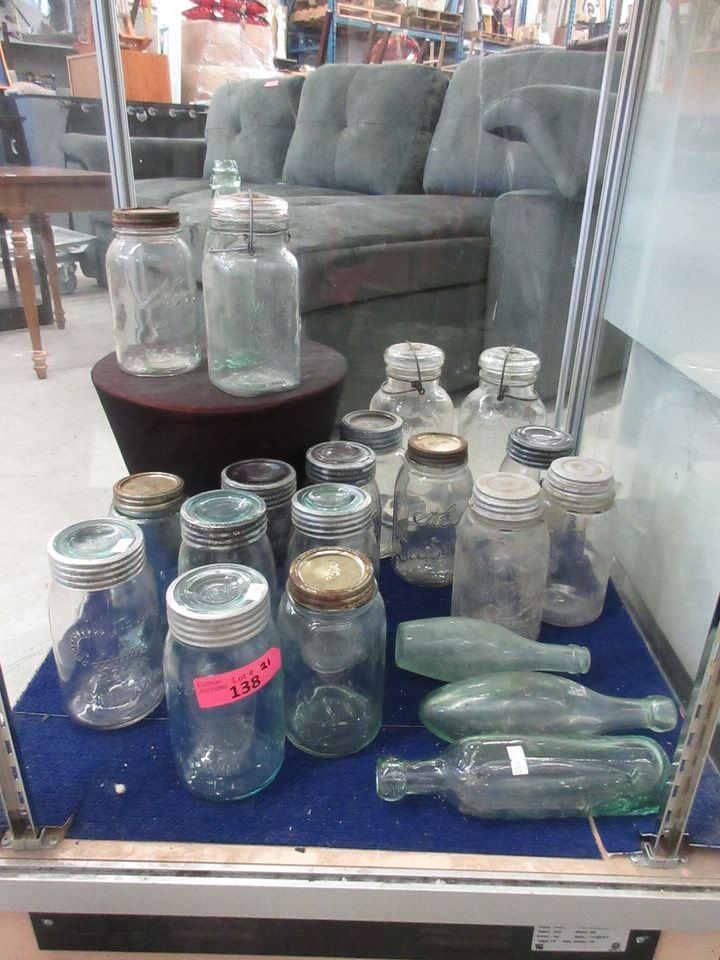 17 Canning Jars (Crow, Perfect, Drey and more) and 4 Glass Beverage Bottles (JS Edisbury, Belfast & more).