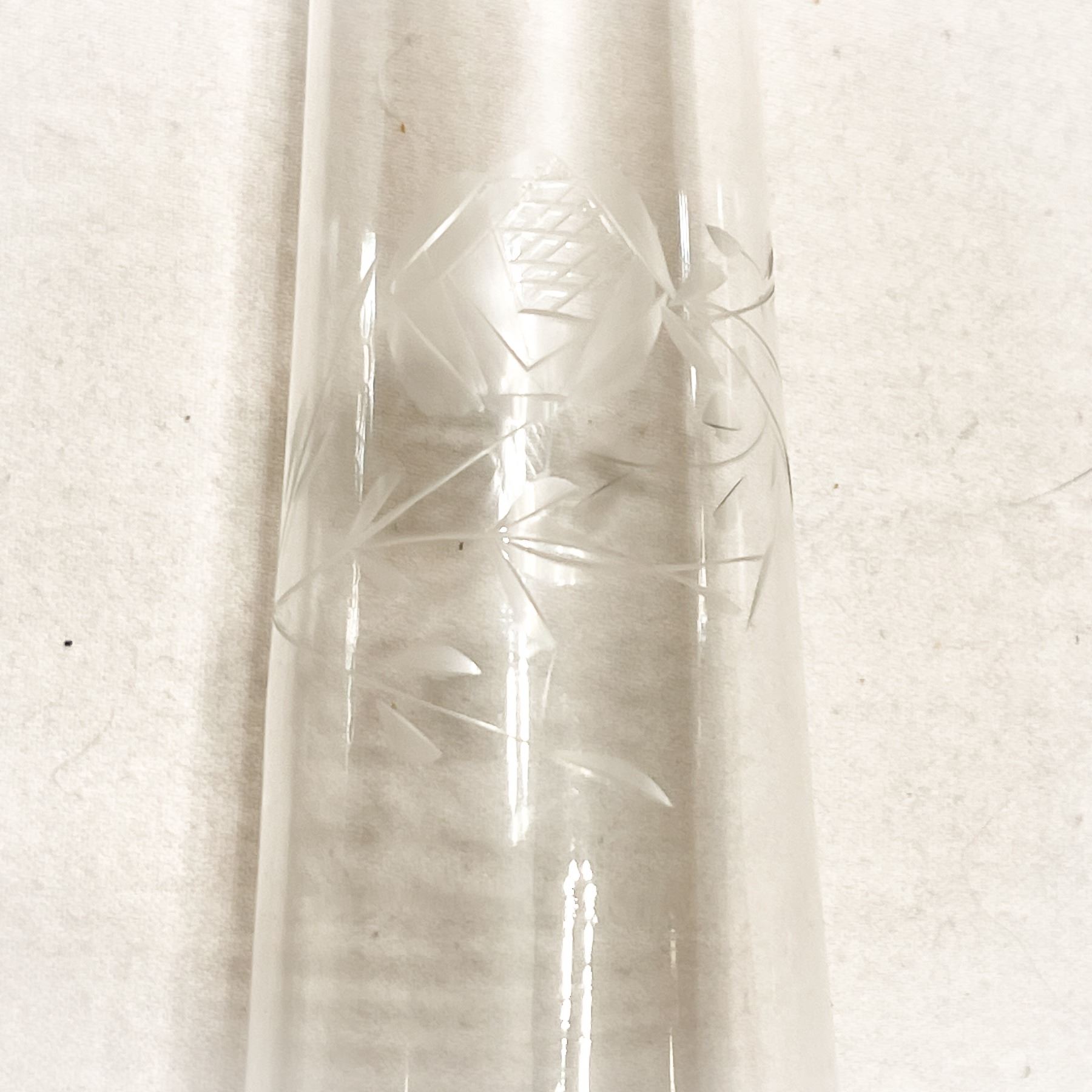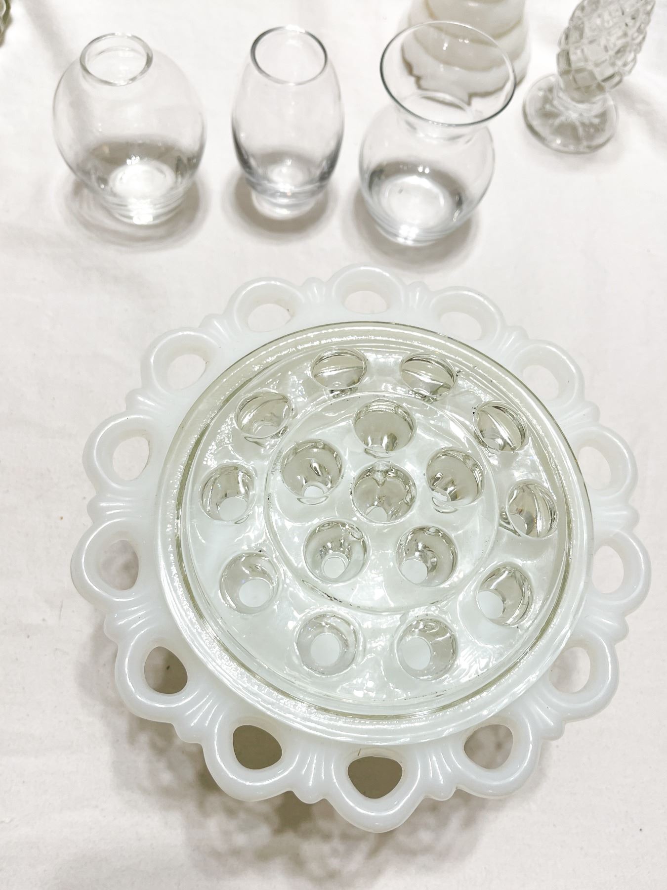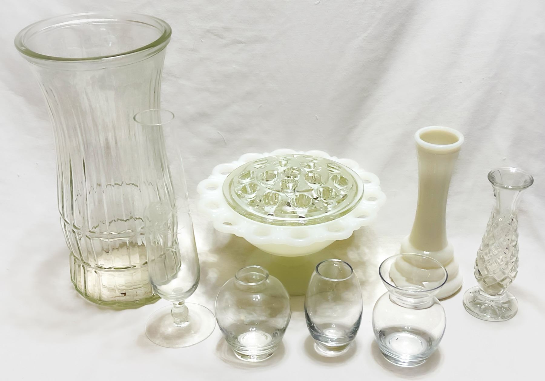 Mixed lot of vintage glass pieces including a Westmoreland-style milk glass compote with glass flower frog insert, assorted clear glass bud vases (one etched), and small rounded mini vases