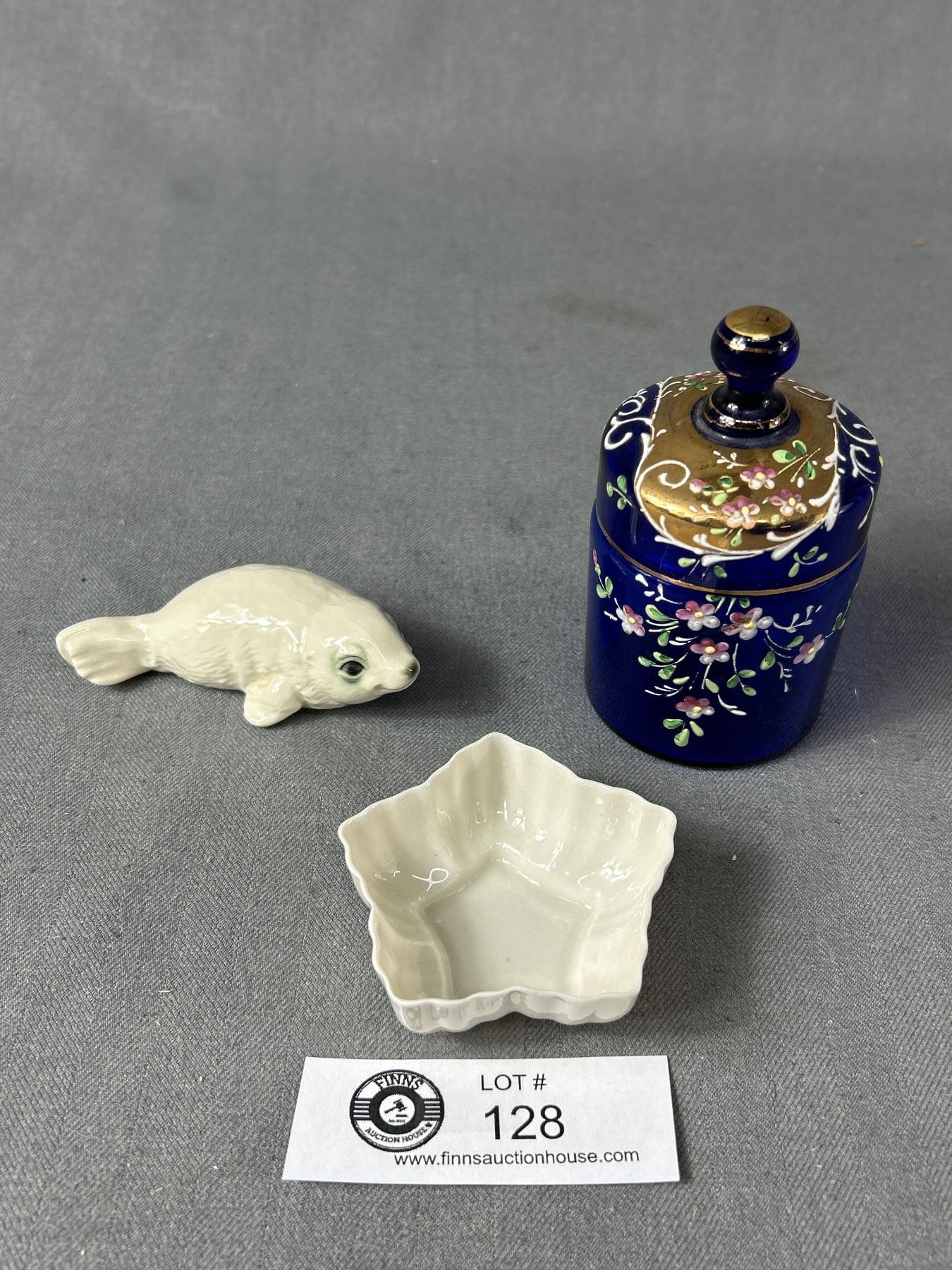 Vintage Goebel W. Germany 1970's White Baby Arctic Seal, Small Belleek Dish & Cobalt Glass with Enamelled Floral Decoration Lidded Jar