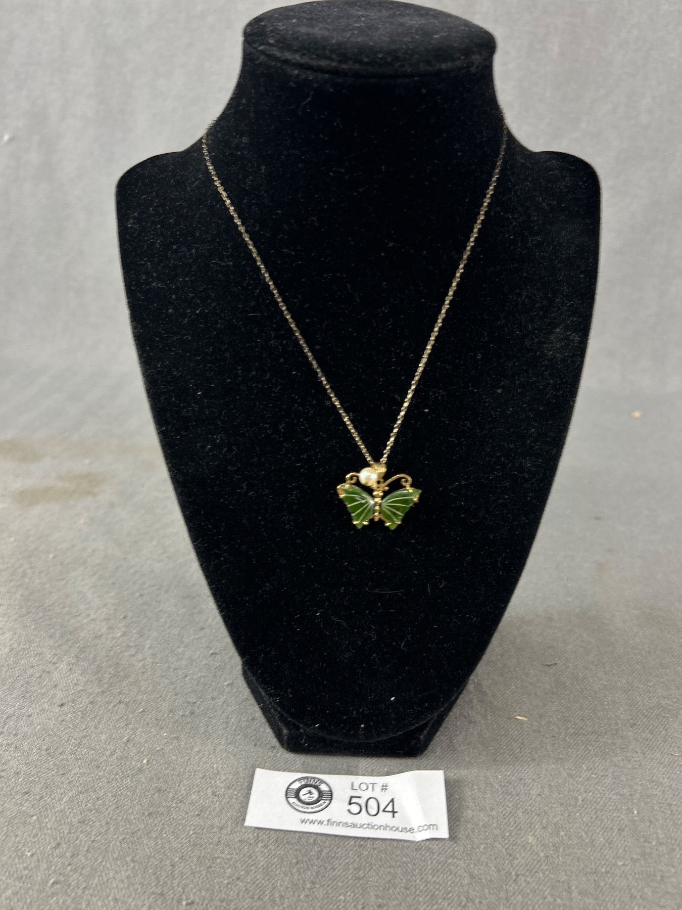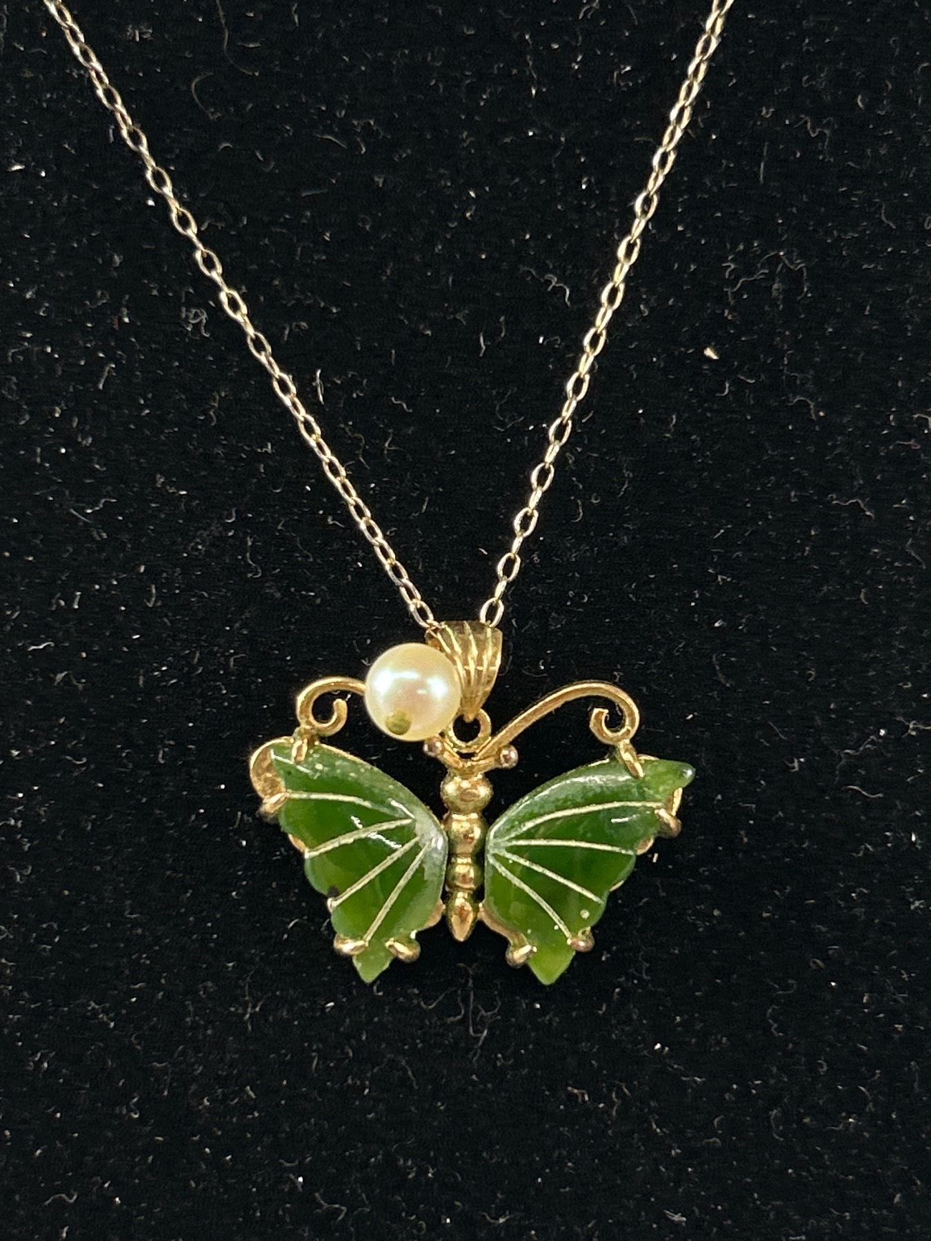 Vintage Gold Filled BC Jade & Genuine Pearl Pendant w/ Sterling Silver Chain