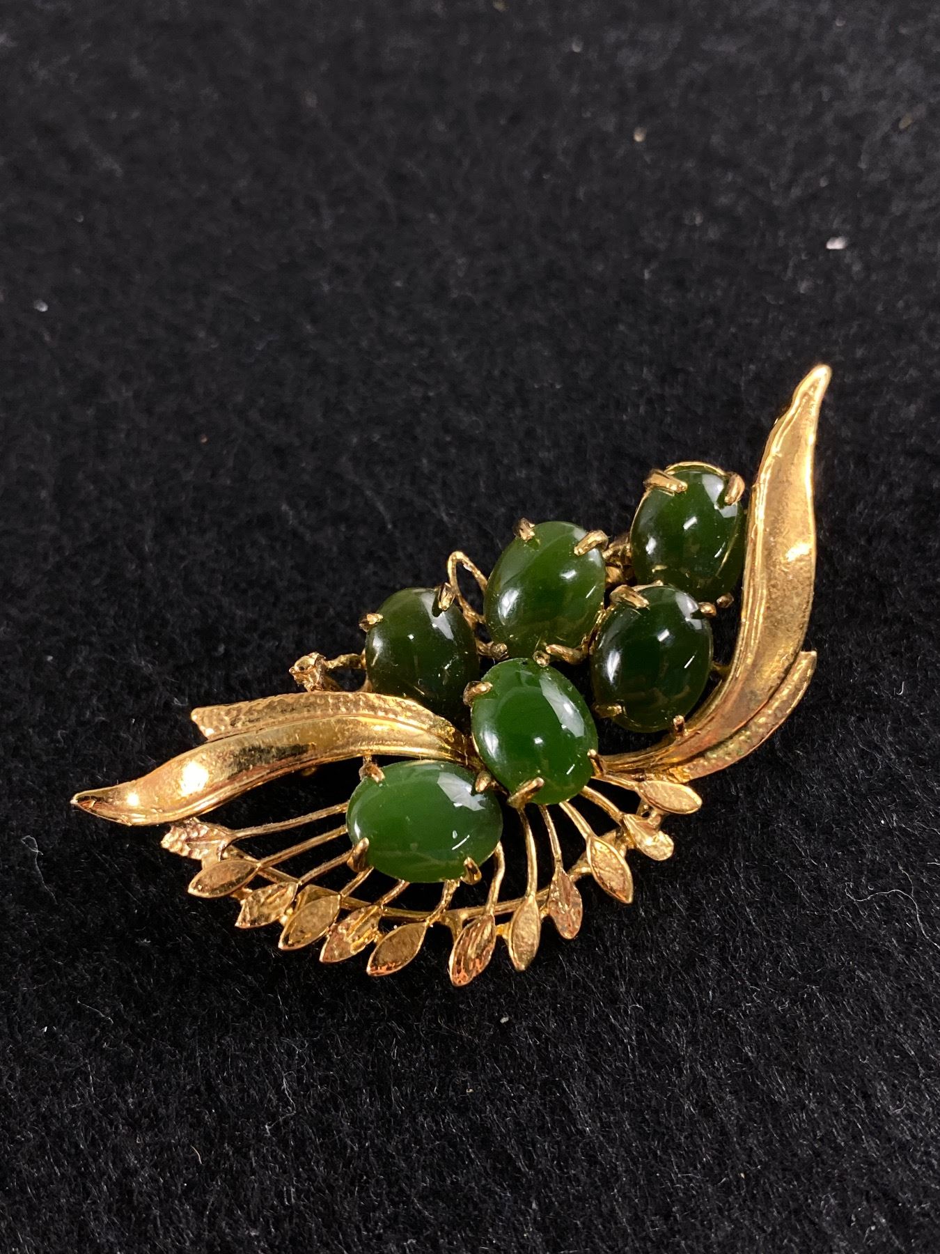 Vintage Gold Filled with Genuine Dark Green BC Jade Stones Brooch
