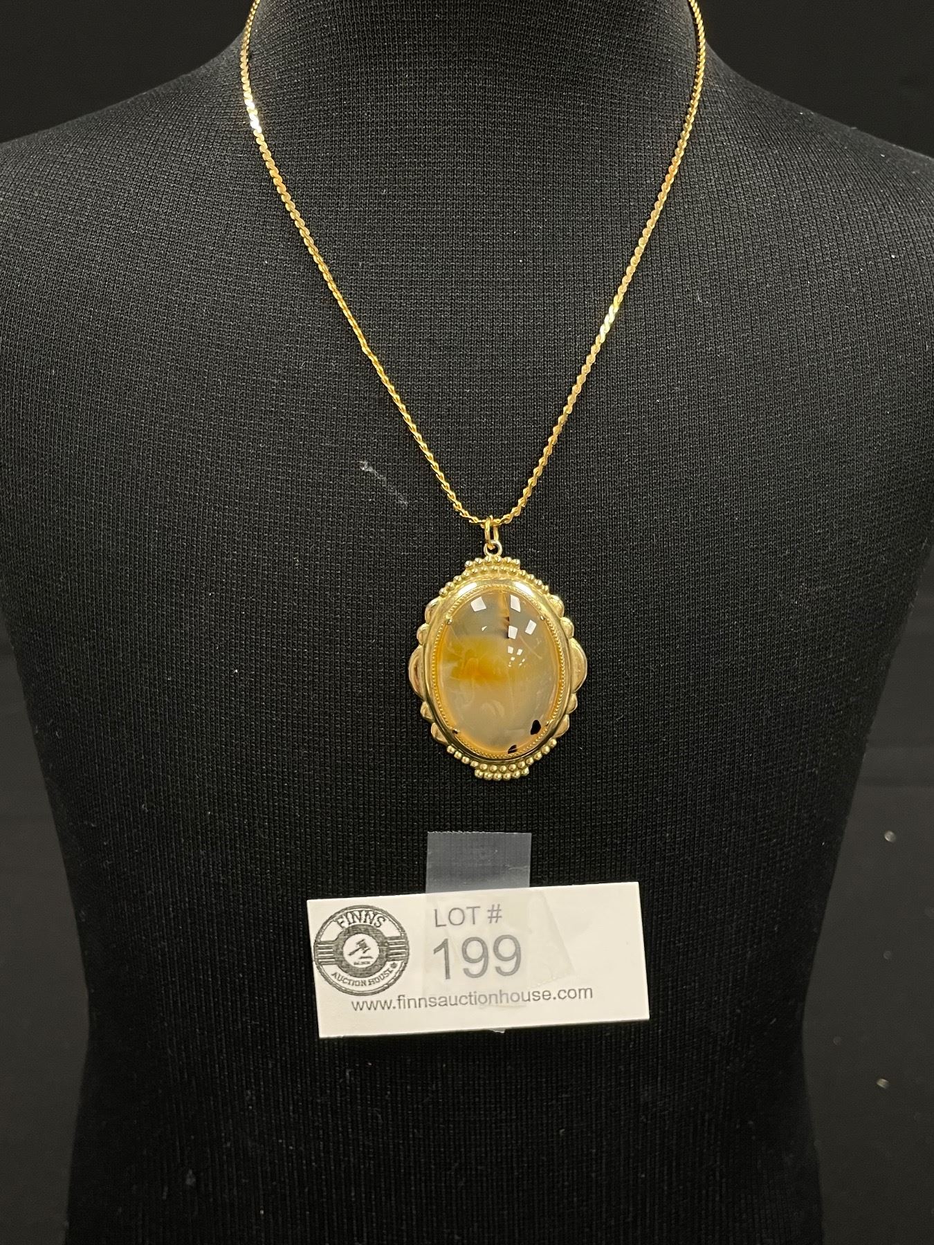 Vintage Gold Plated with Lace Agate Stone Pendant & Chain Necklace 17" L