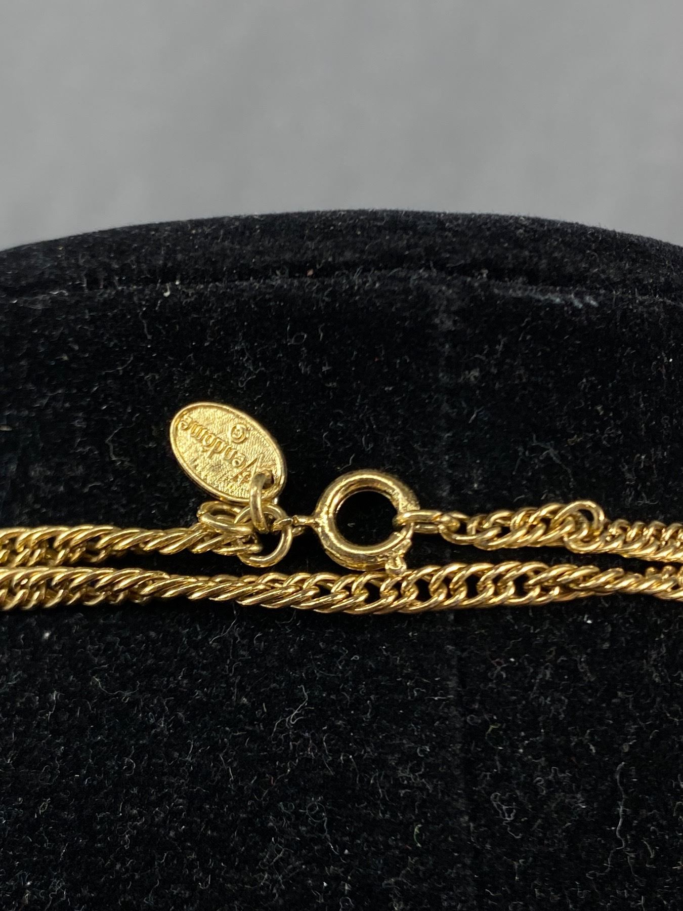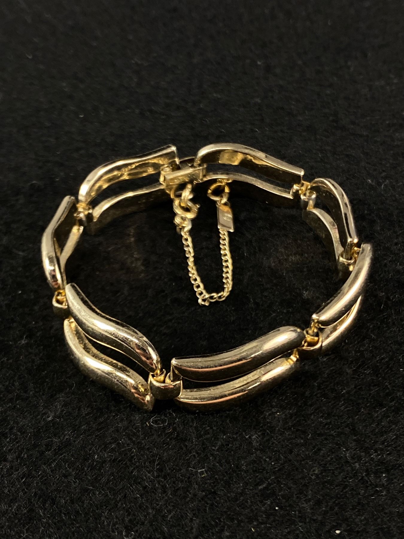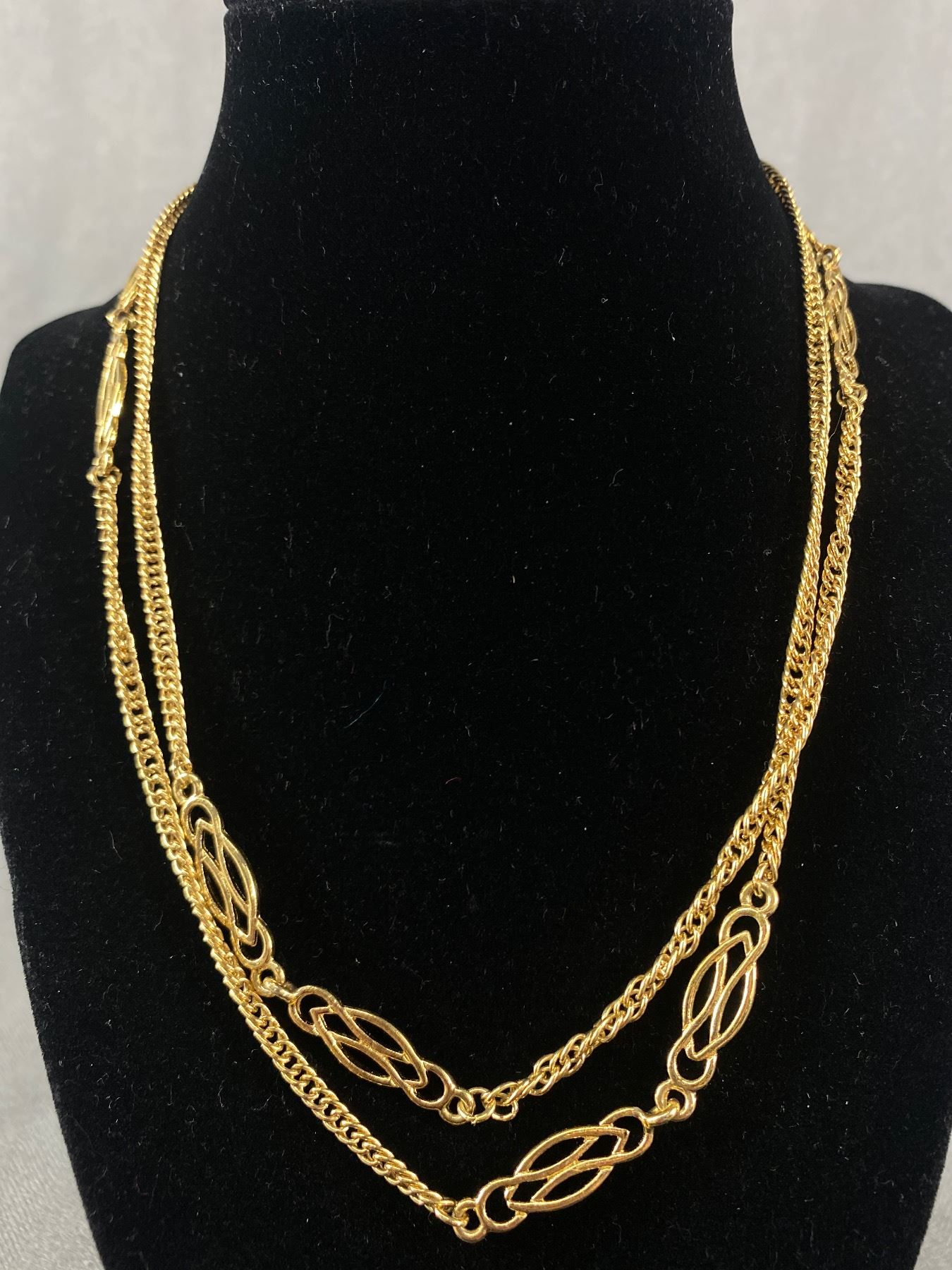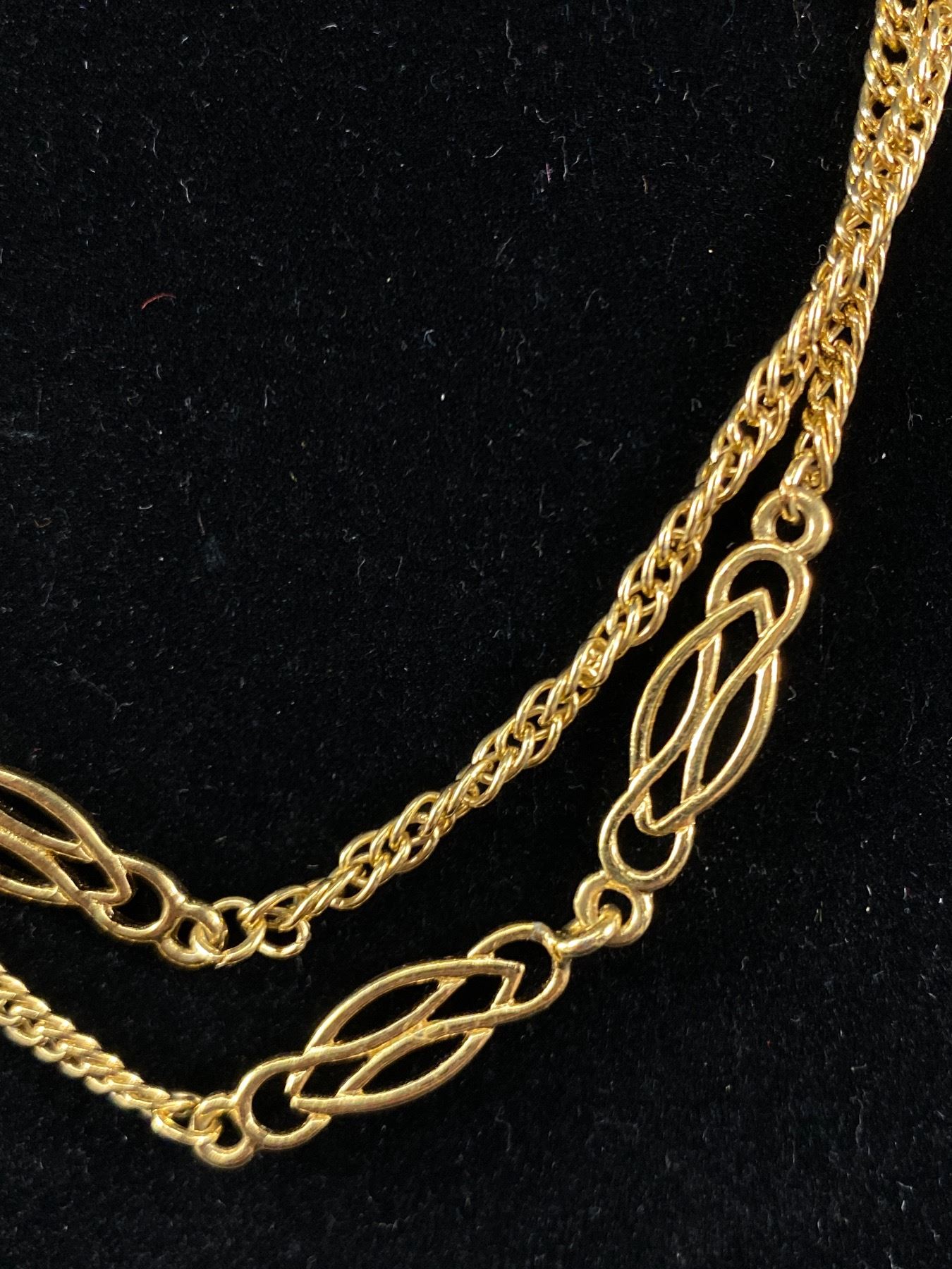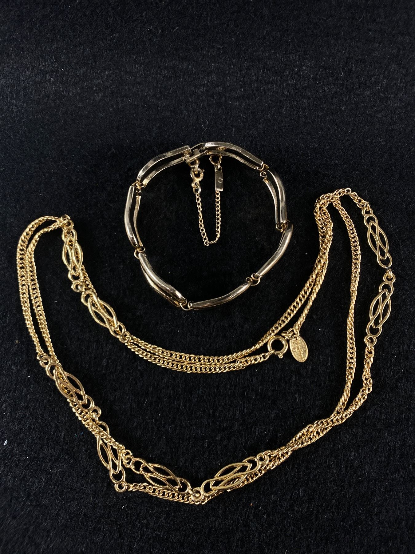 Vintage Gold Tone Lot: Vendome 36" Ornate Metal Flapper Inspired Necklace, Monet Signed Double Wave Link Bracelet W/ Safety Chain