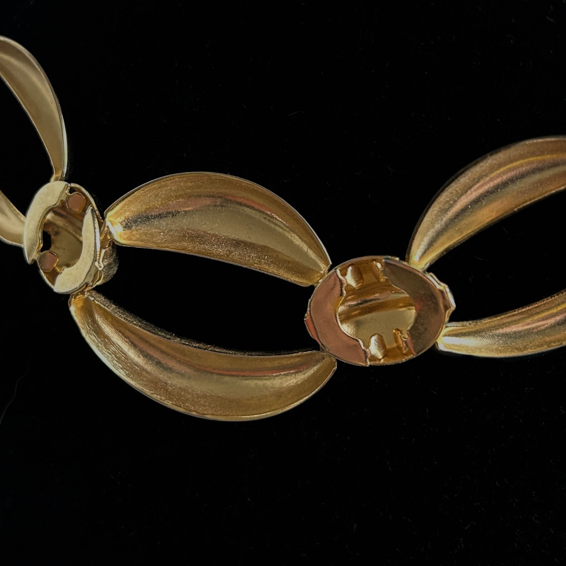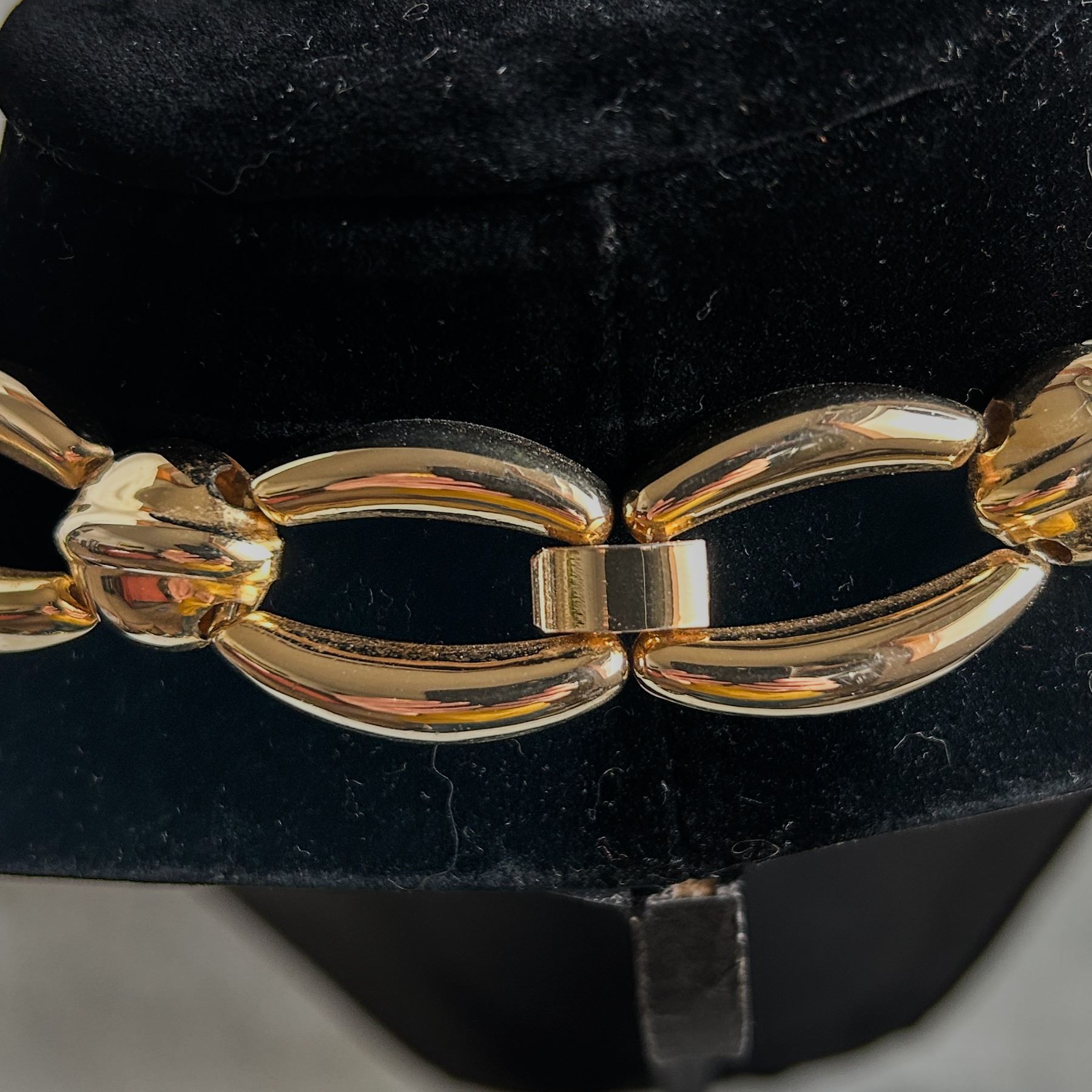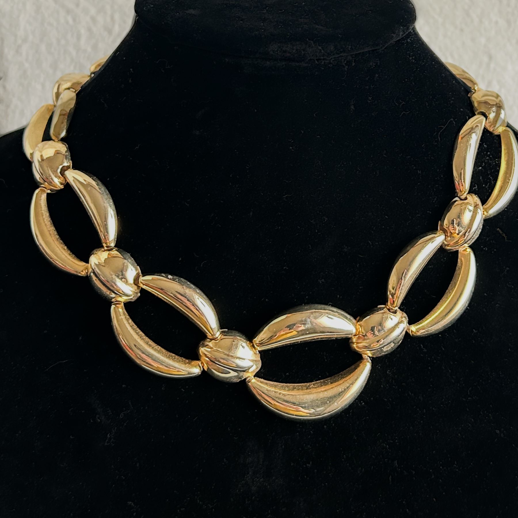 Bold 1980s gold-tone collar necklace with chunky, sculpted links and a seamless box clasp. Unmarked, high-quality vintage construction with a statement look.