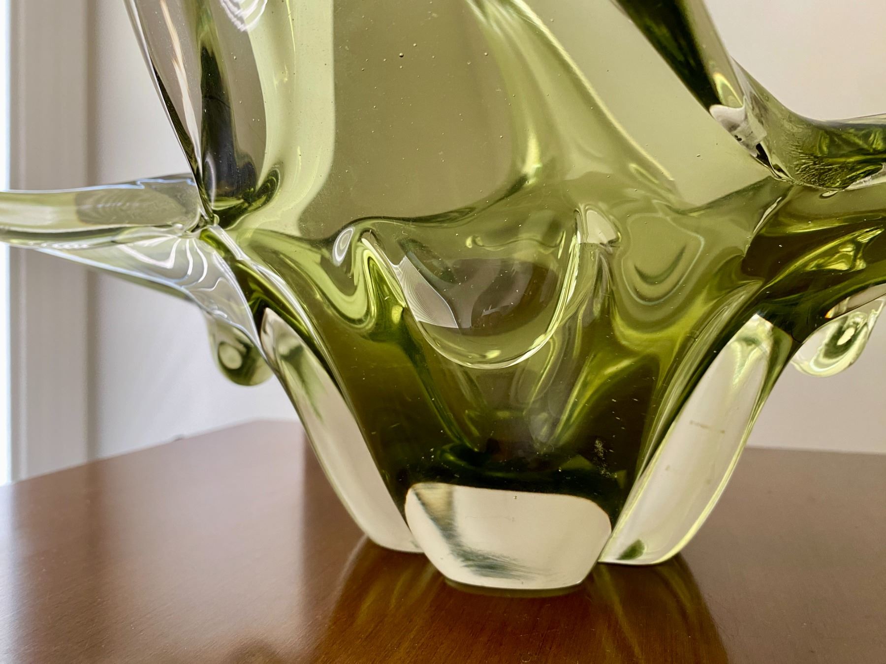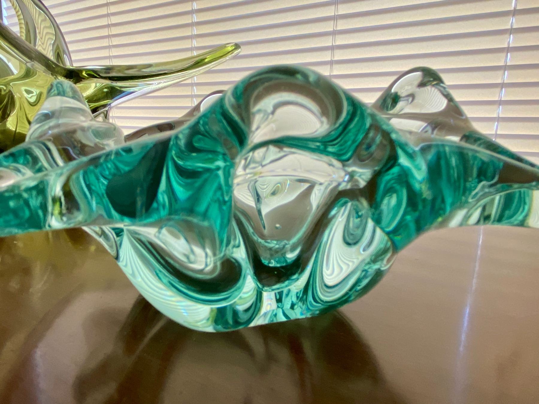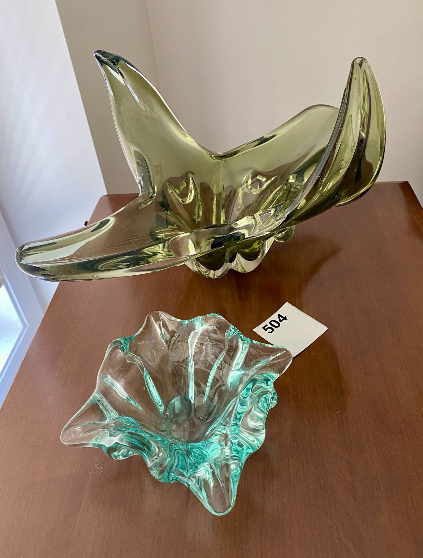 2 pieces of vintage green glass art bowls. Largest is 18x13x9.5".