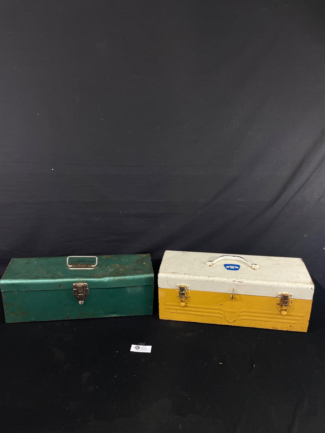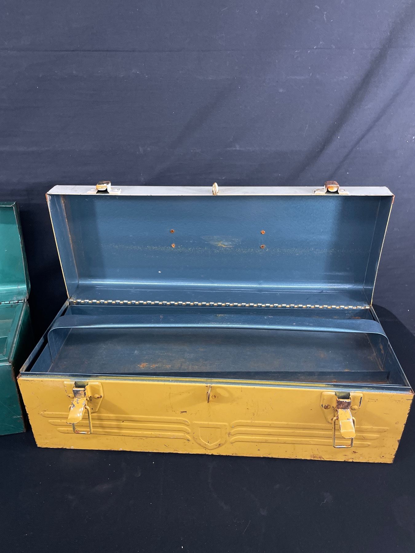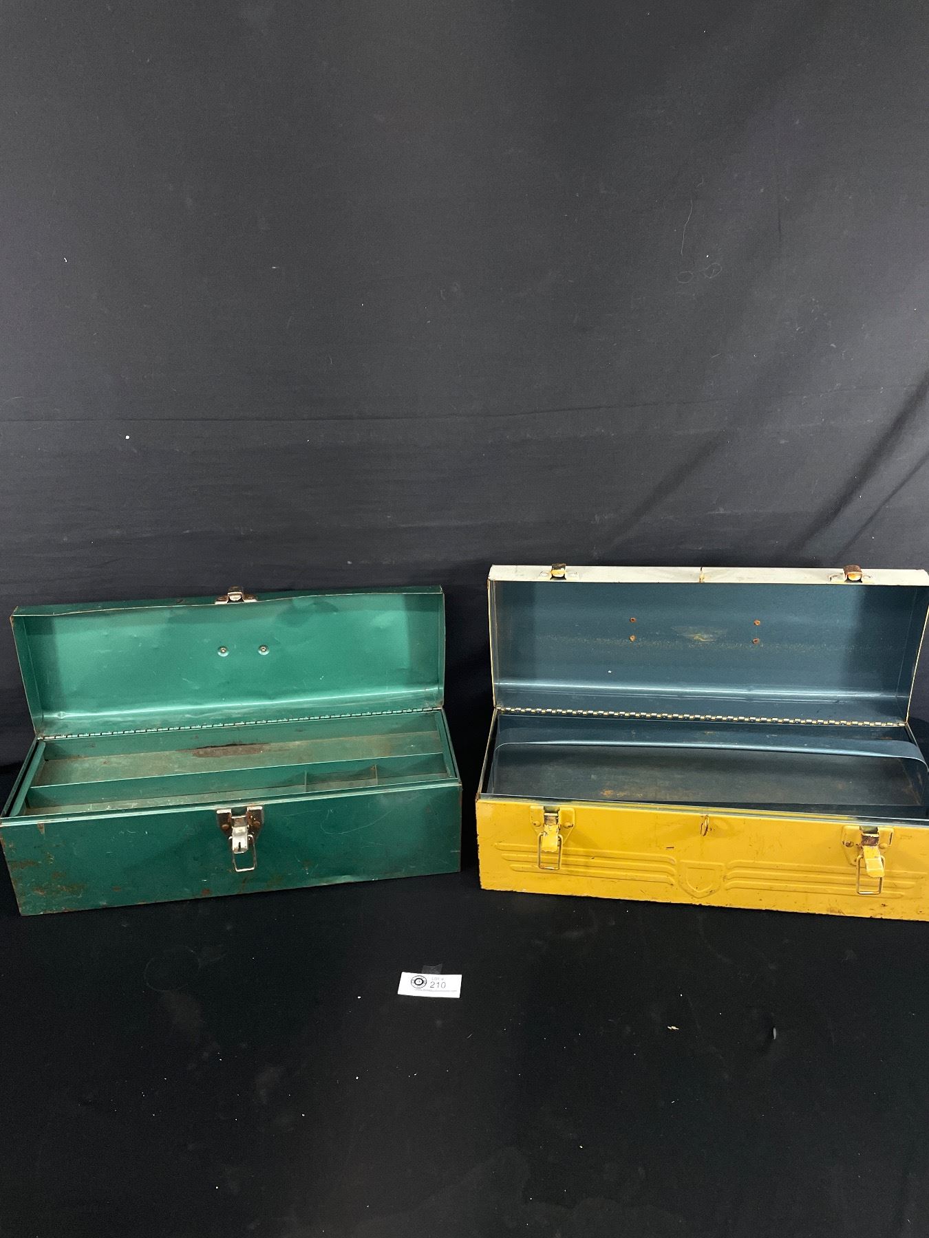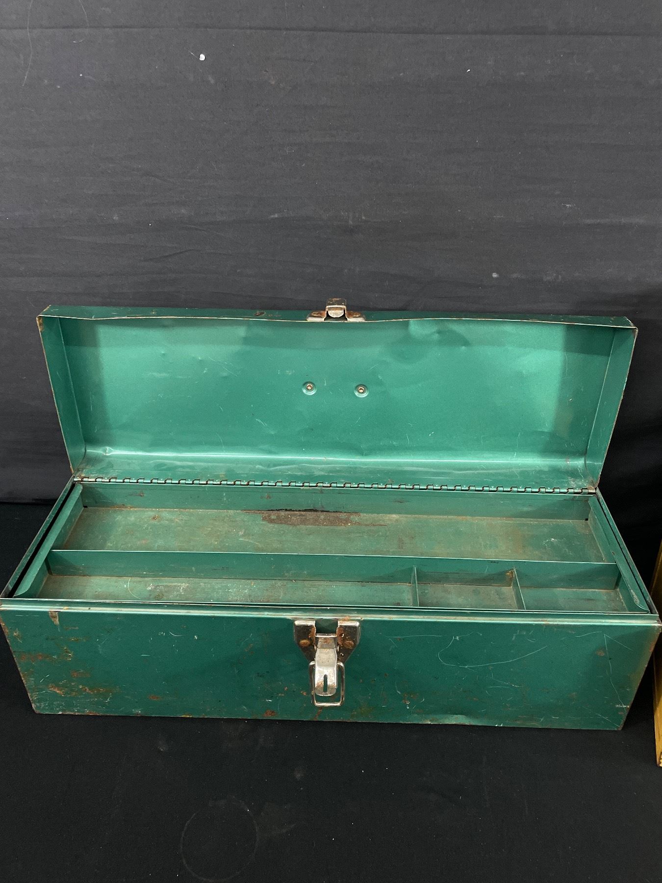 Vintage Green "Beach" Metal Tool Box. Approx. 6 1/2" x 19" x 6" & Vintage BC Telephone Company Tool Box. Approx. 7" x 7 " x 19"
