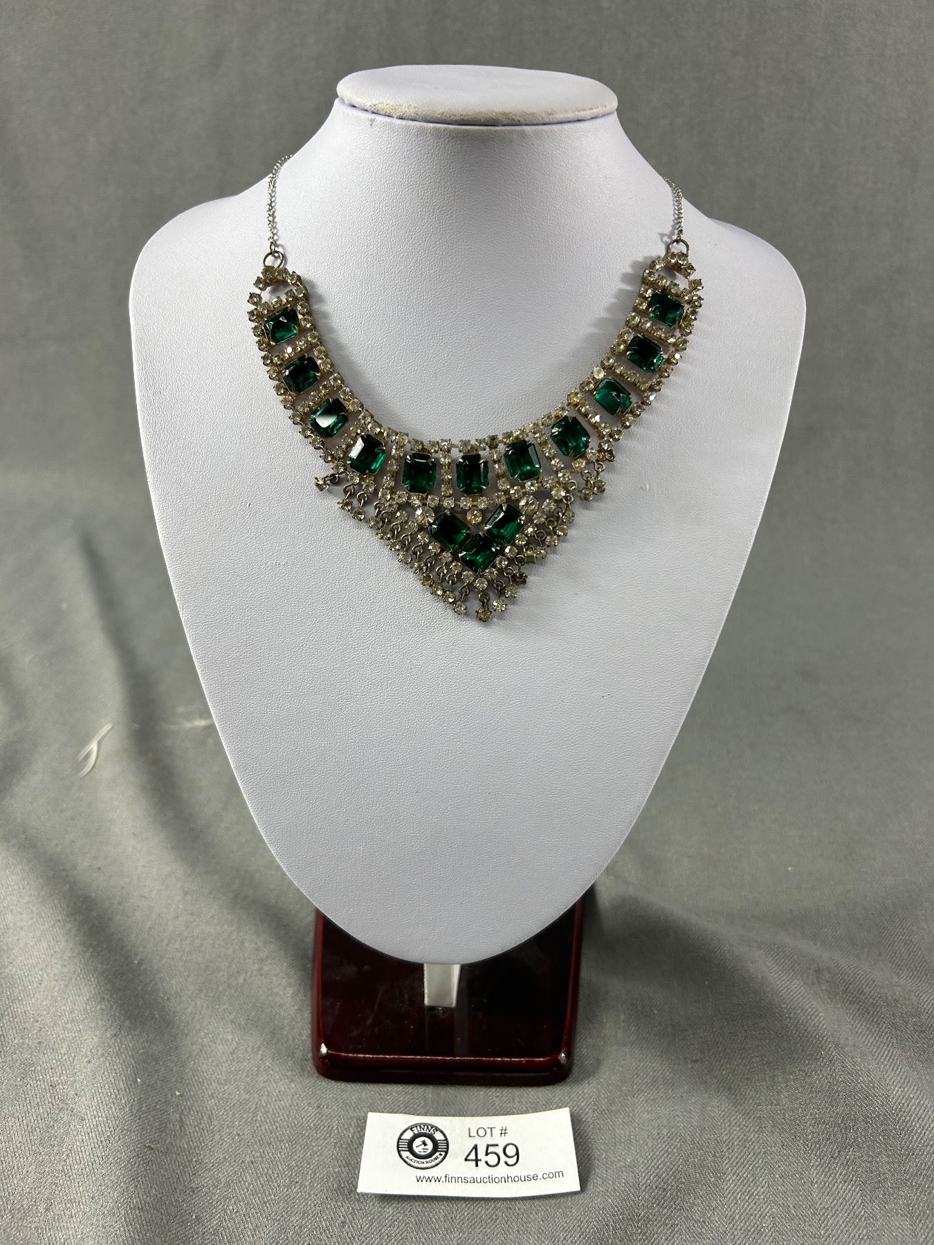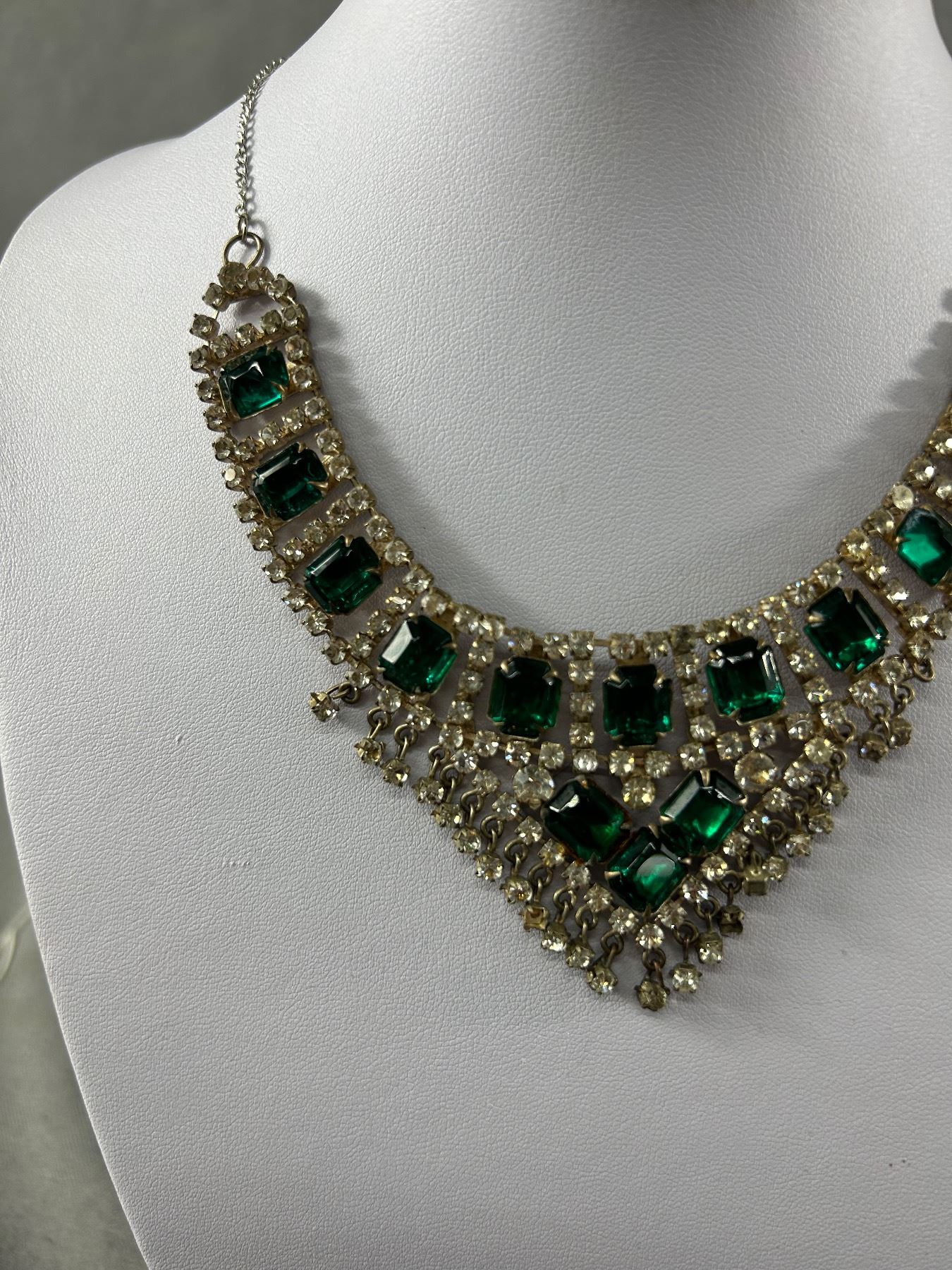 Vintage Green Glass & White Rhinestones Necklace, Original Patina