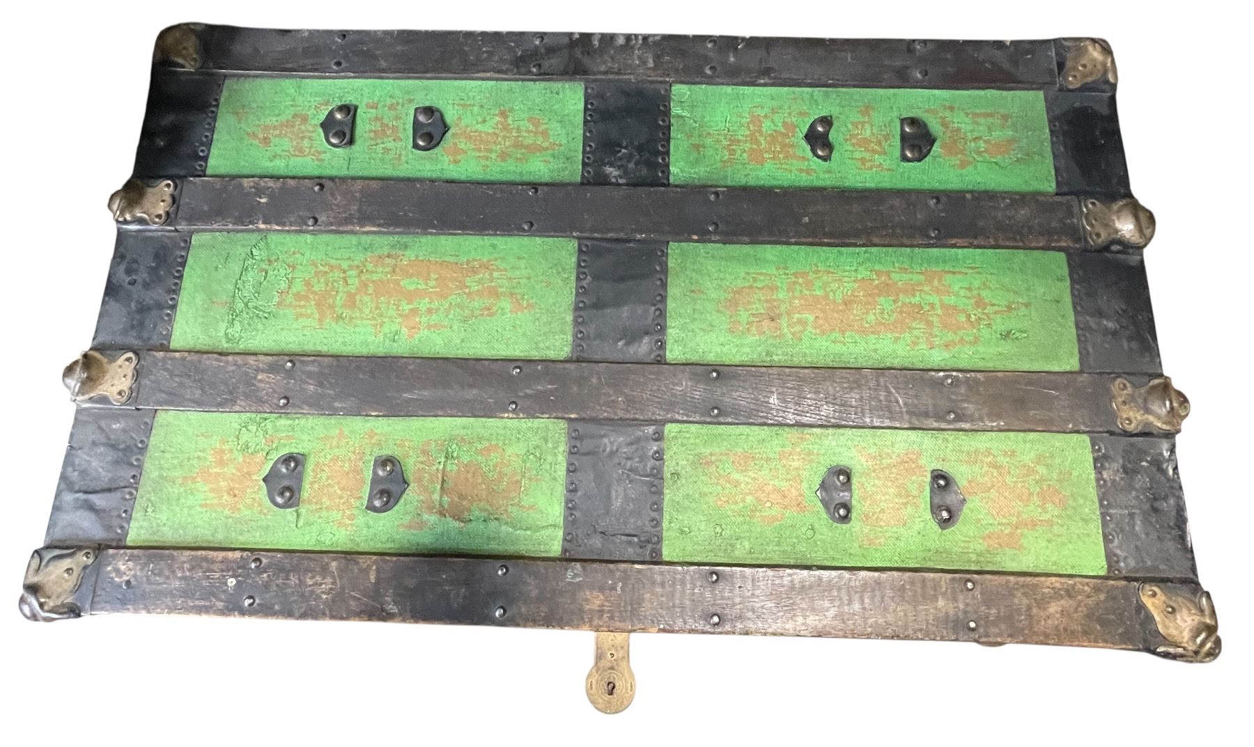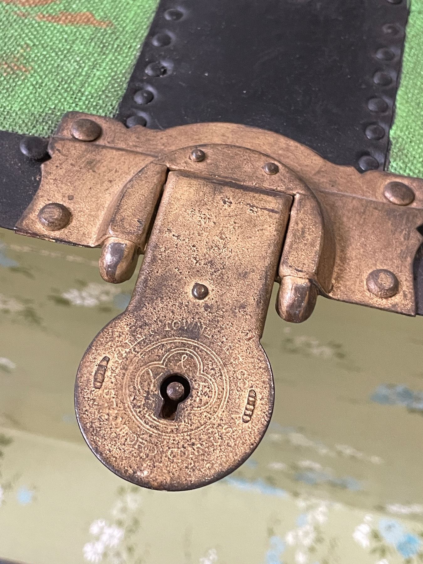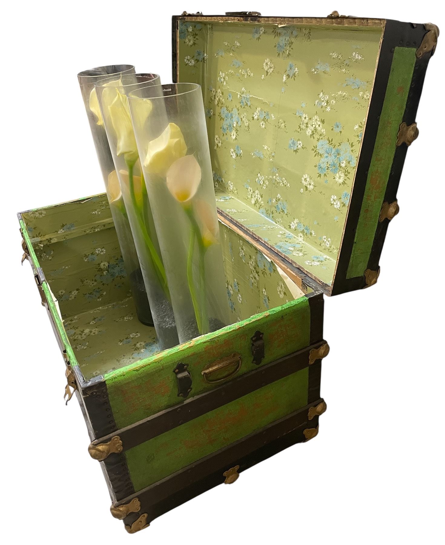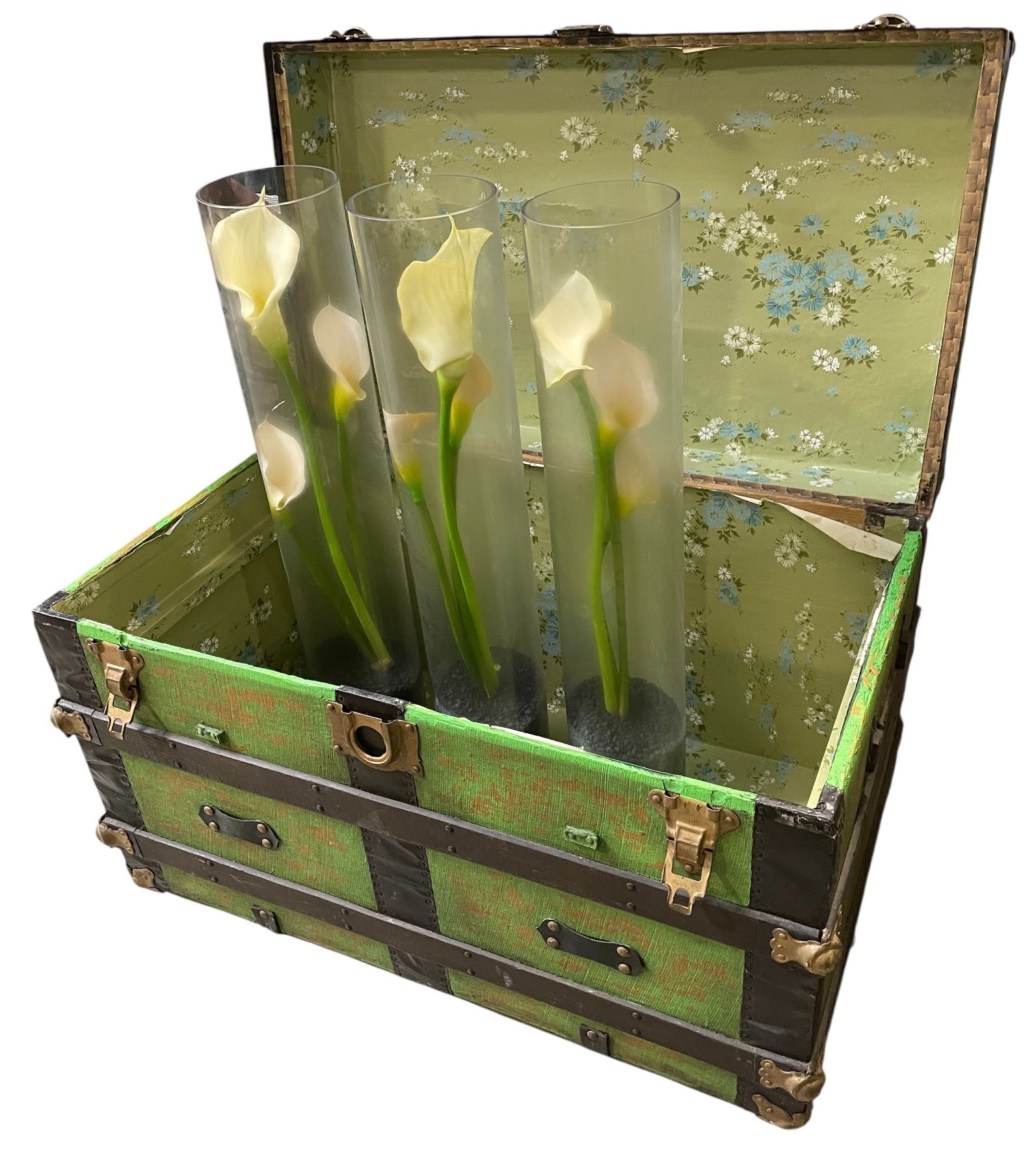 Vintage Green Trunk with Floral Lining and Three Tall Glass Vases Containing Artificial Calla Lilies