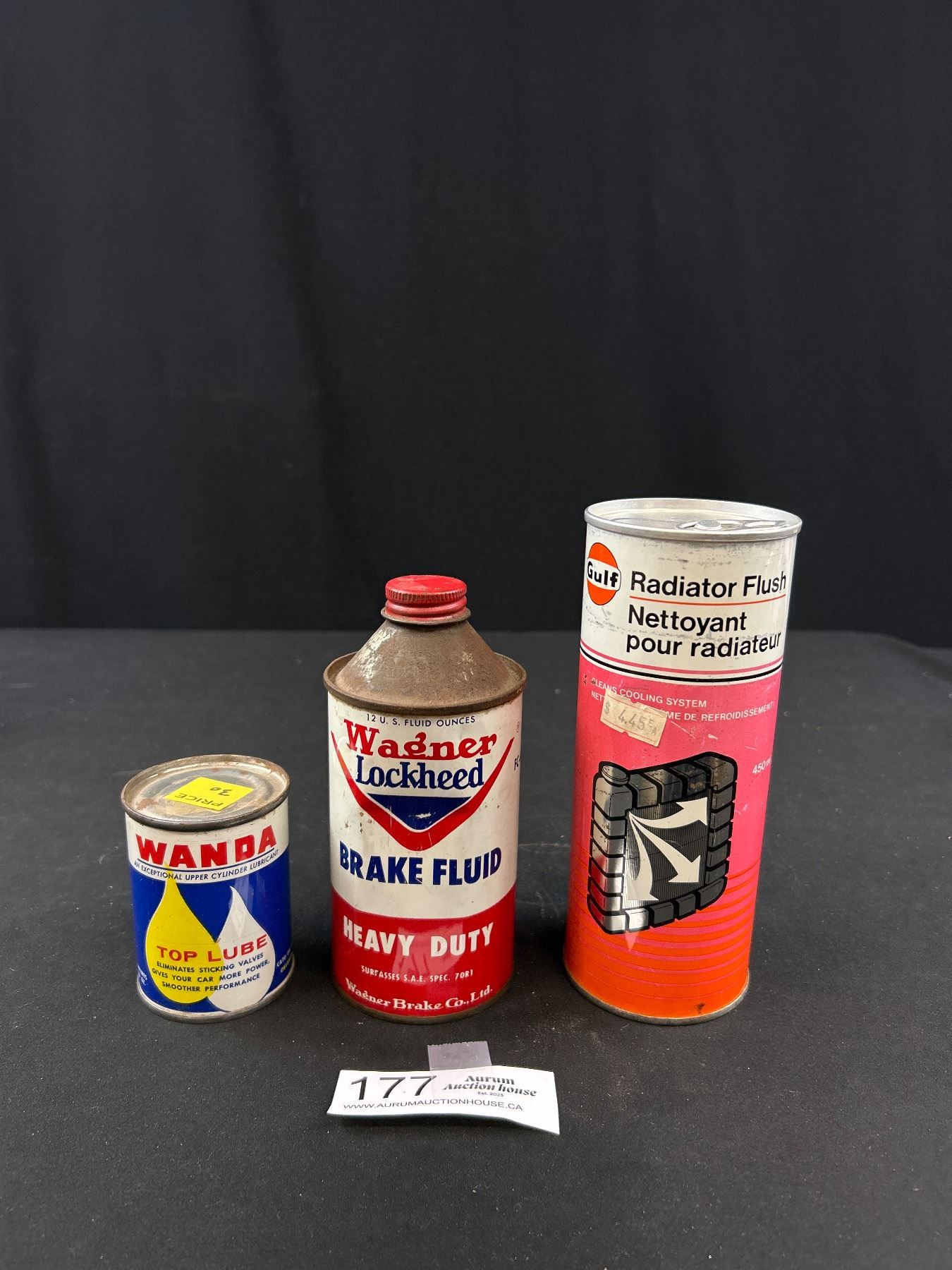 Vintage Gulf Radiator Flush, Wagner Brake Fluid and Wanda Top Lube Tins