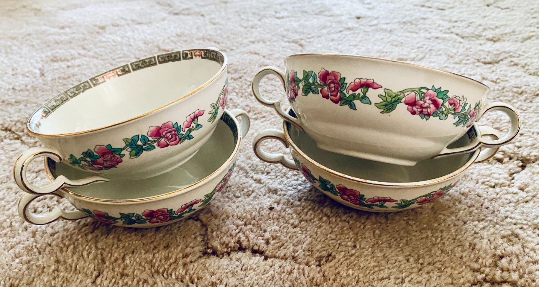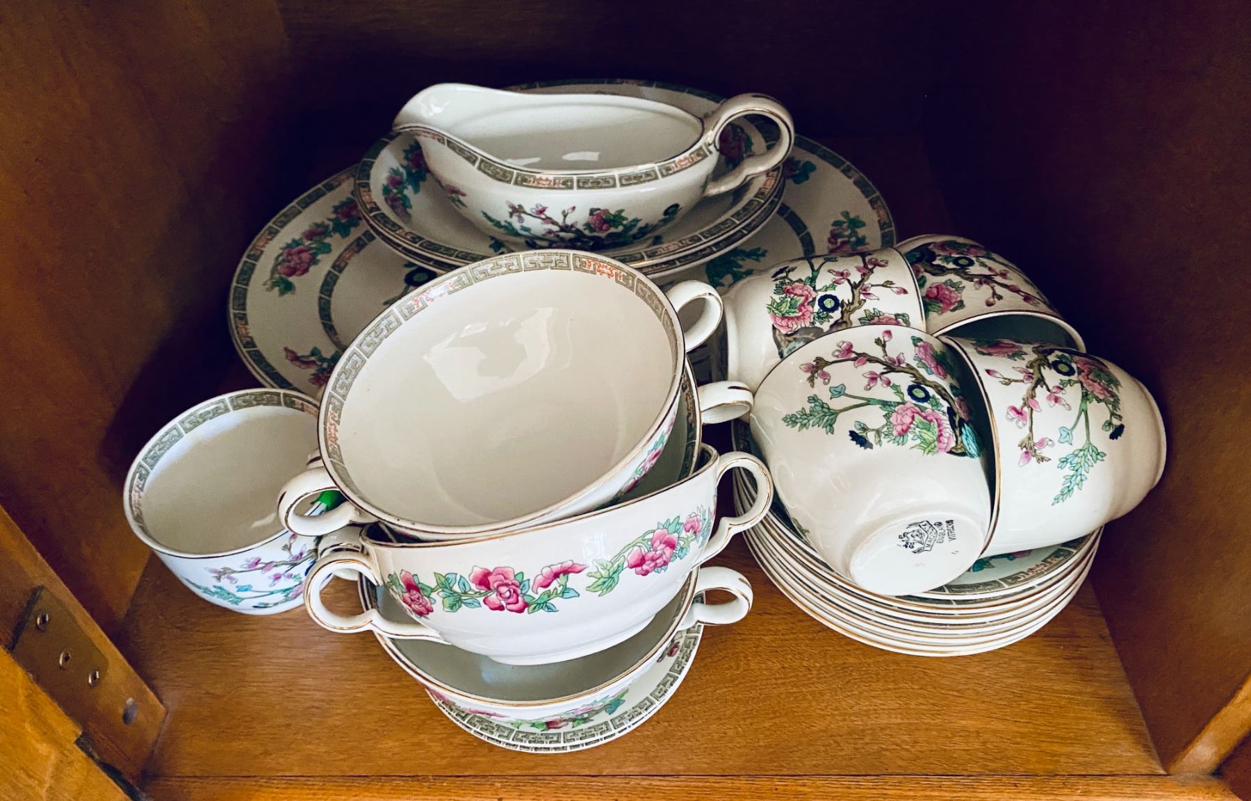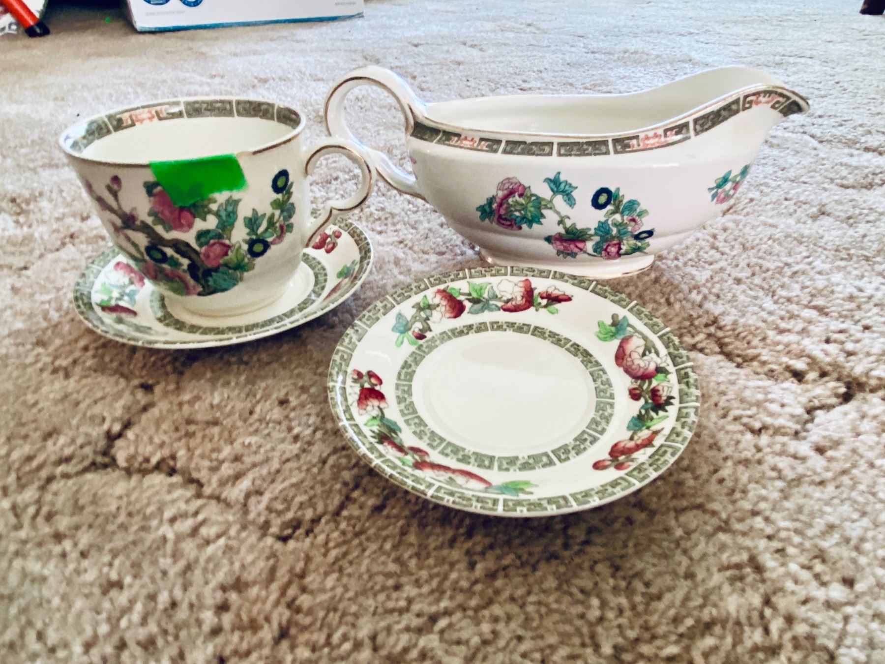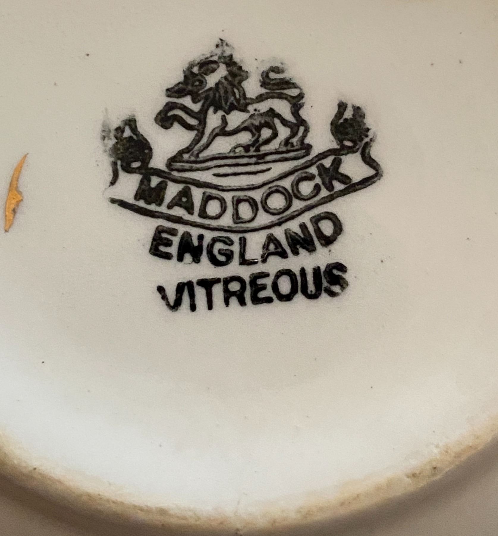 Haddock Vitreous china: !5"L platter, soup bowls, gravy bowl, cups, saucers. 22 piece total. Chip. Made in England.