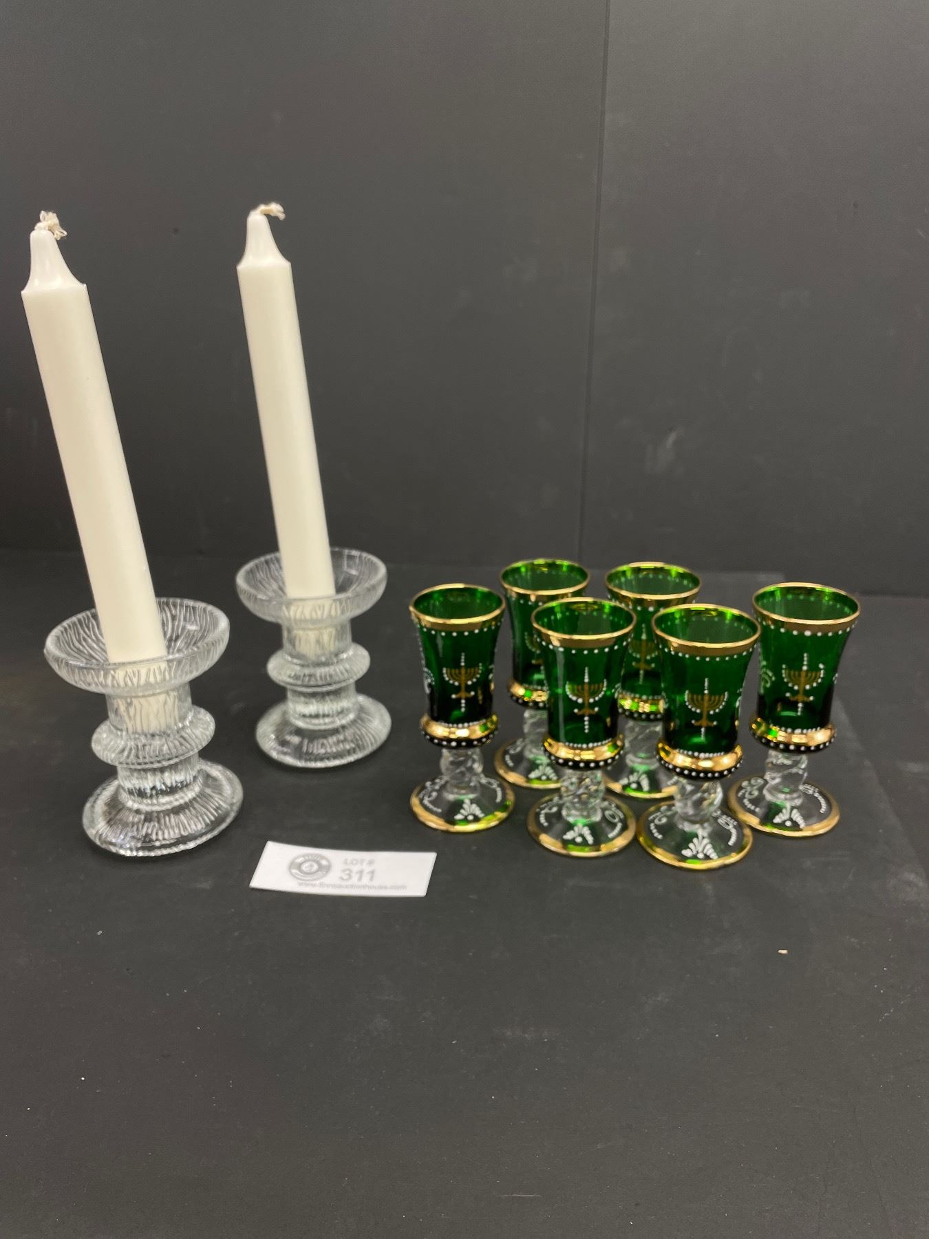 Vintage Hand Decorated Jewish Cordial Glass Set & Pair of Glass Candlesticks