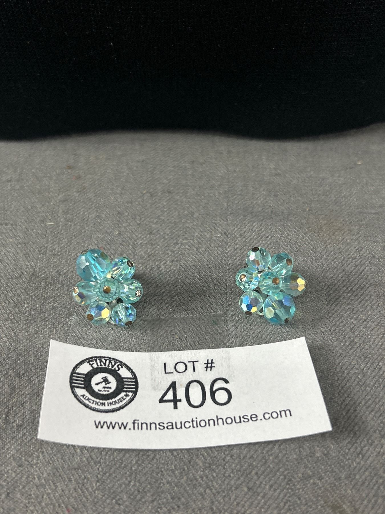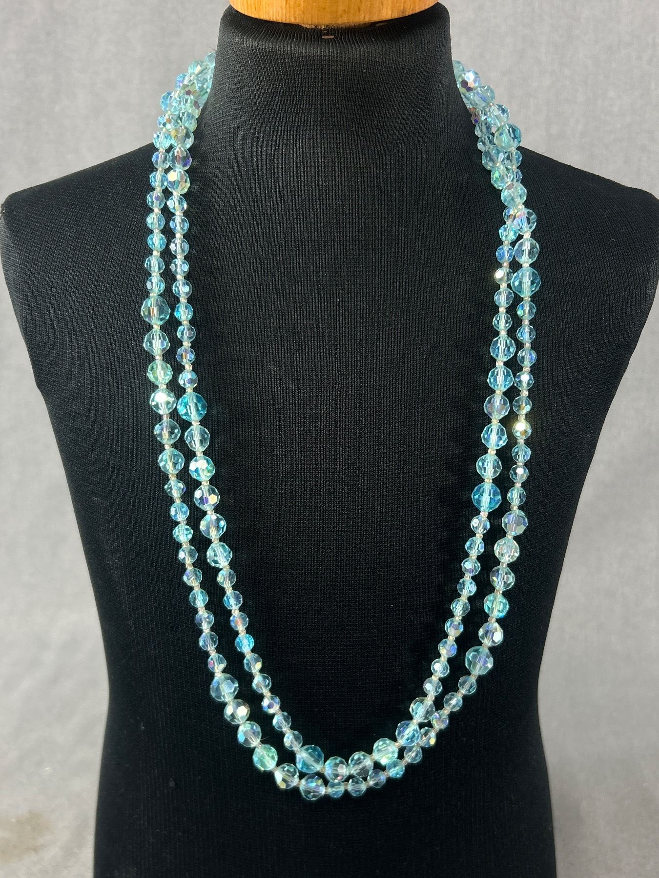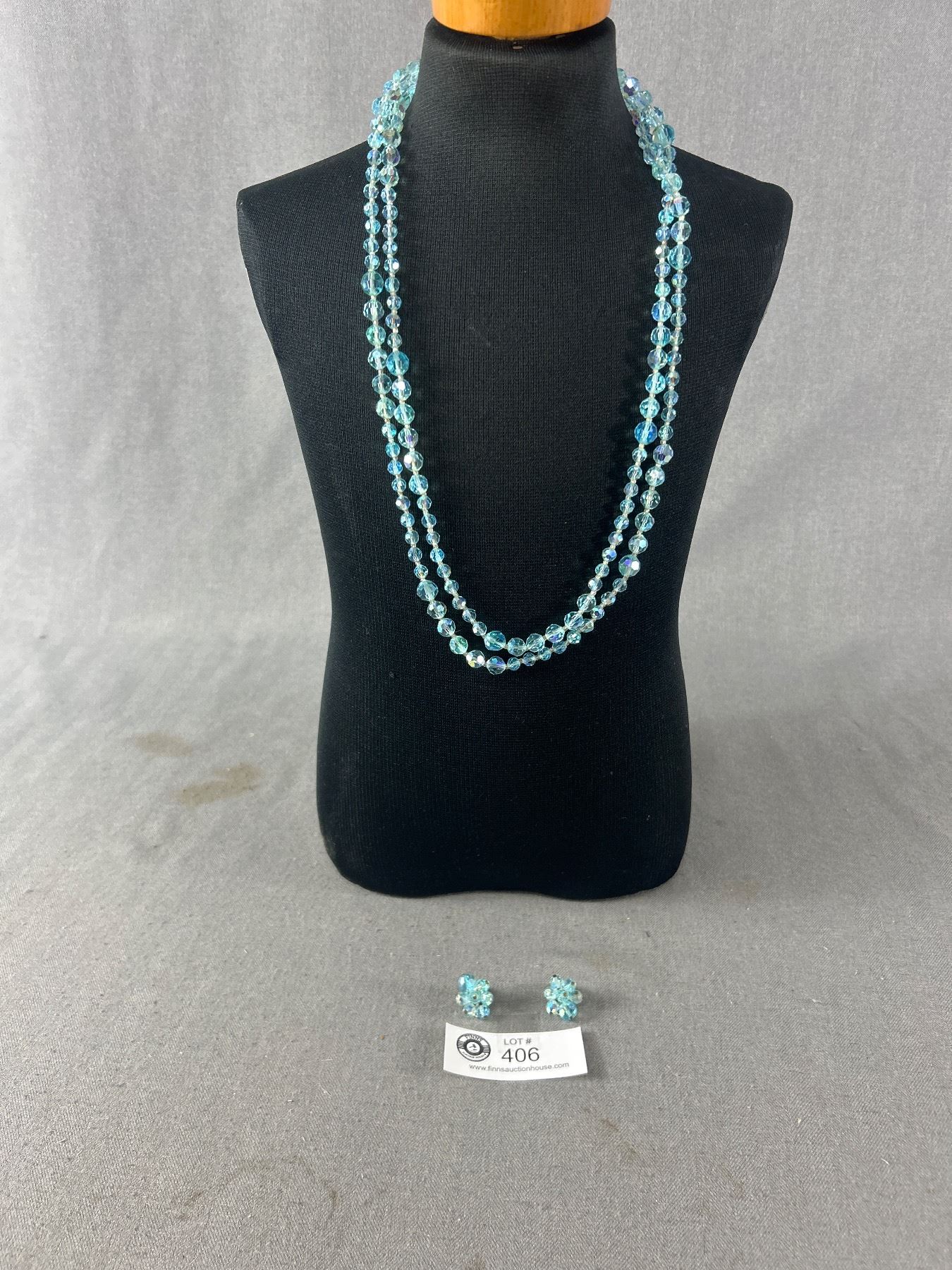 Vintage Hand Knotted Blue Faceted Crystal Beads Necklace and Earrings