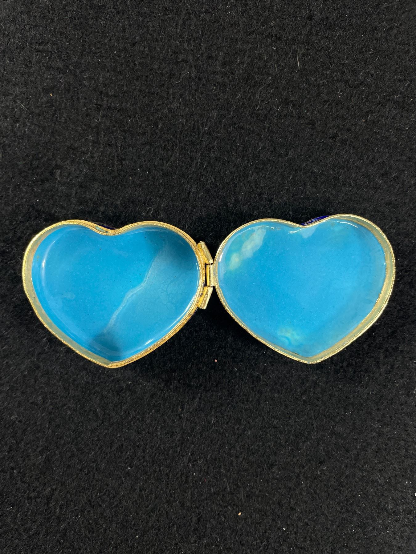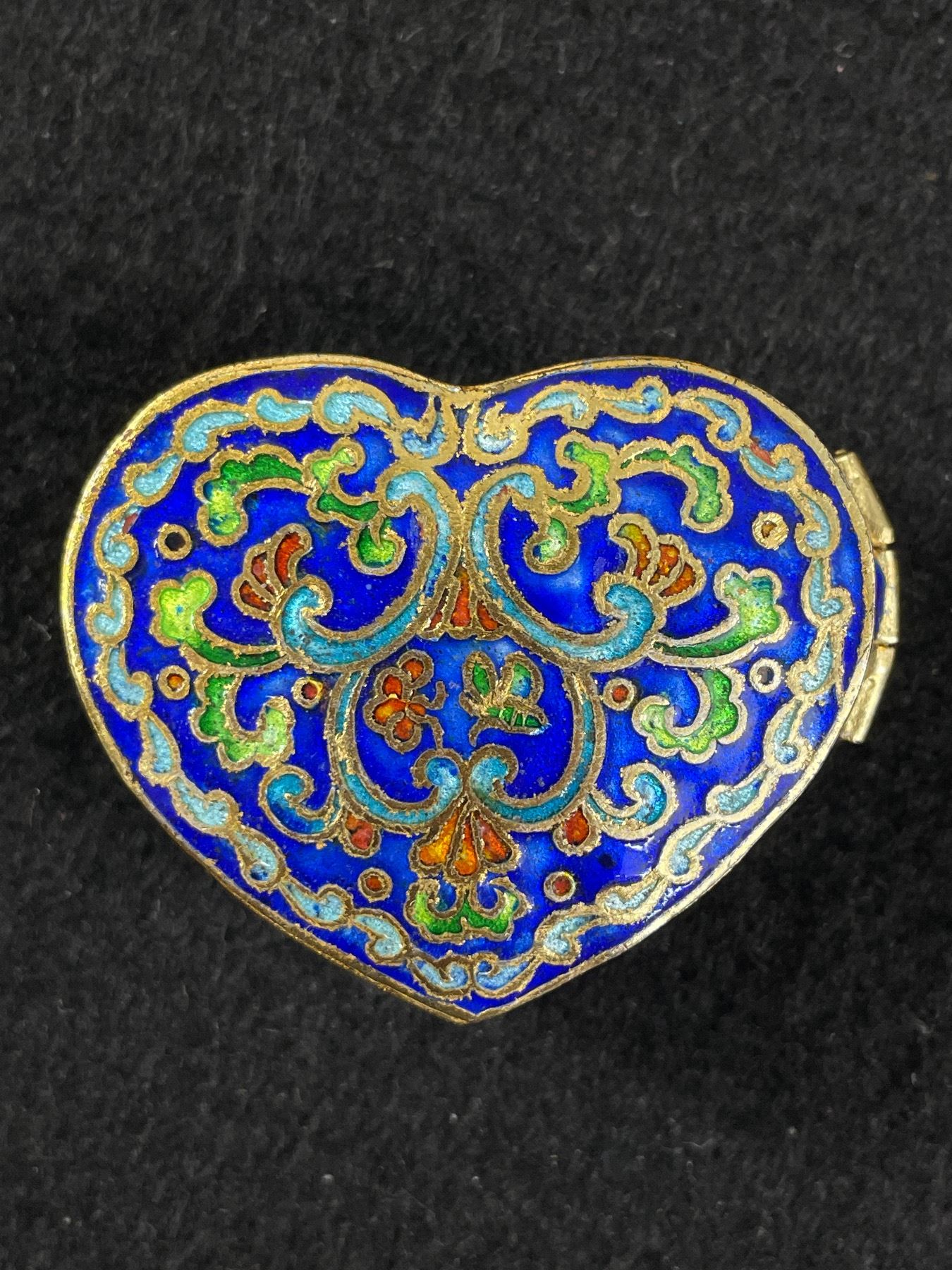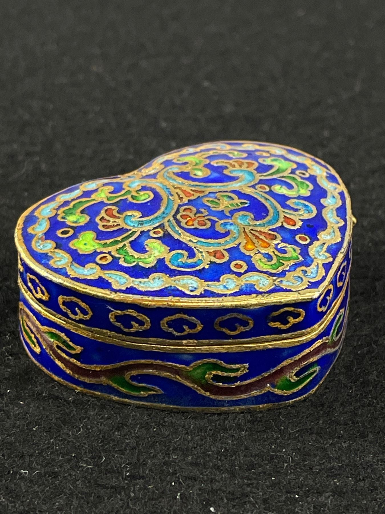 Vintage Hand Painted Enambled Cloisonne Hinged Metal Heart Shaped Trinket Box. Approx. 2" x 1.5" x .5'