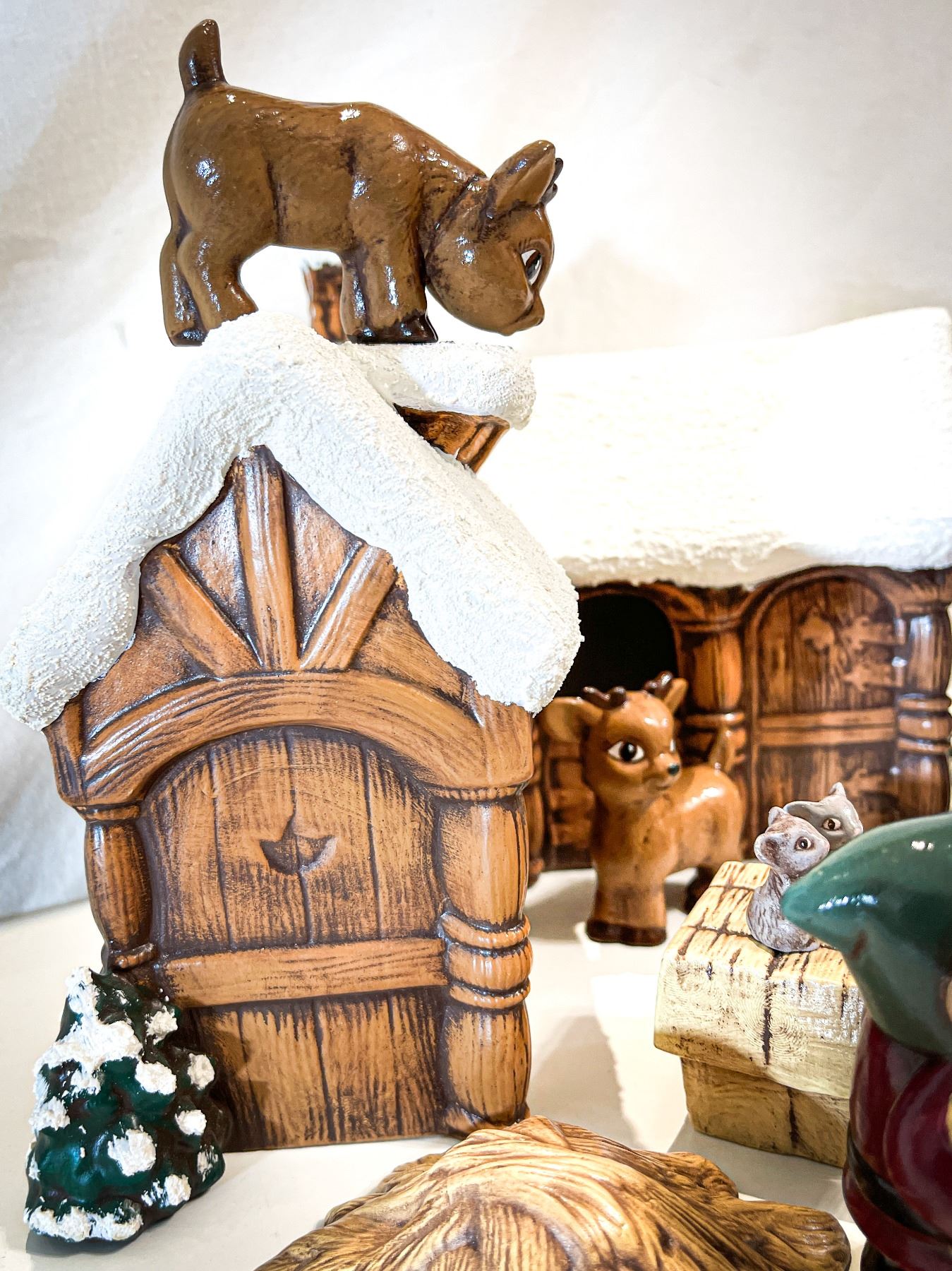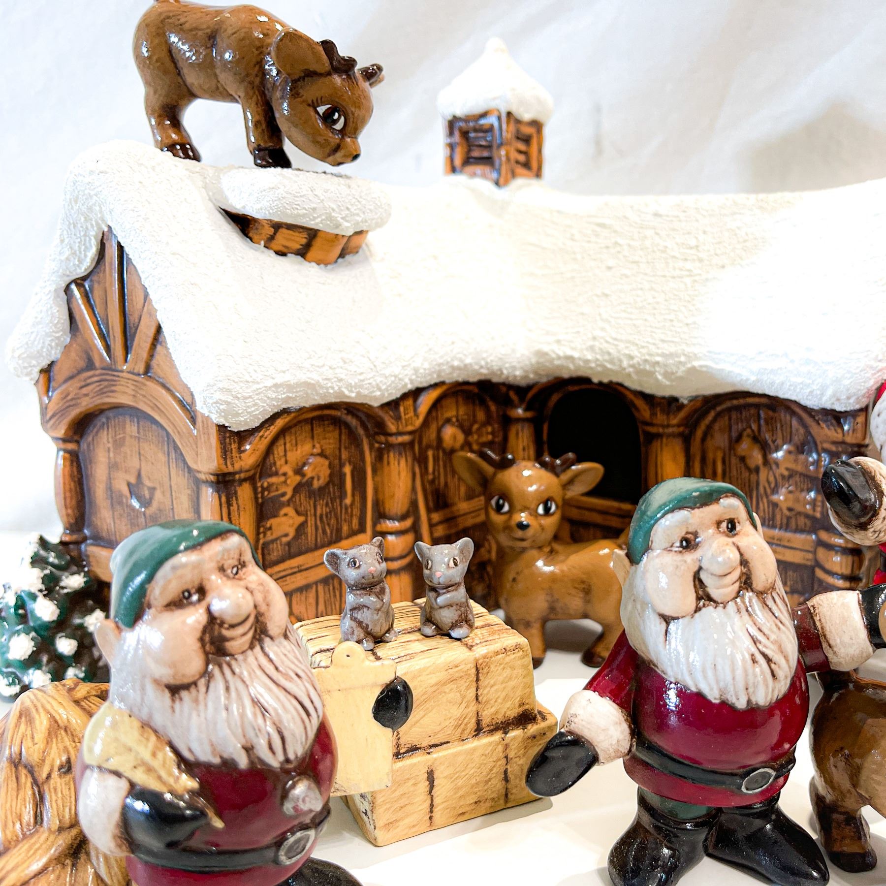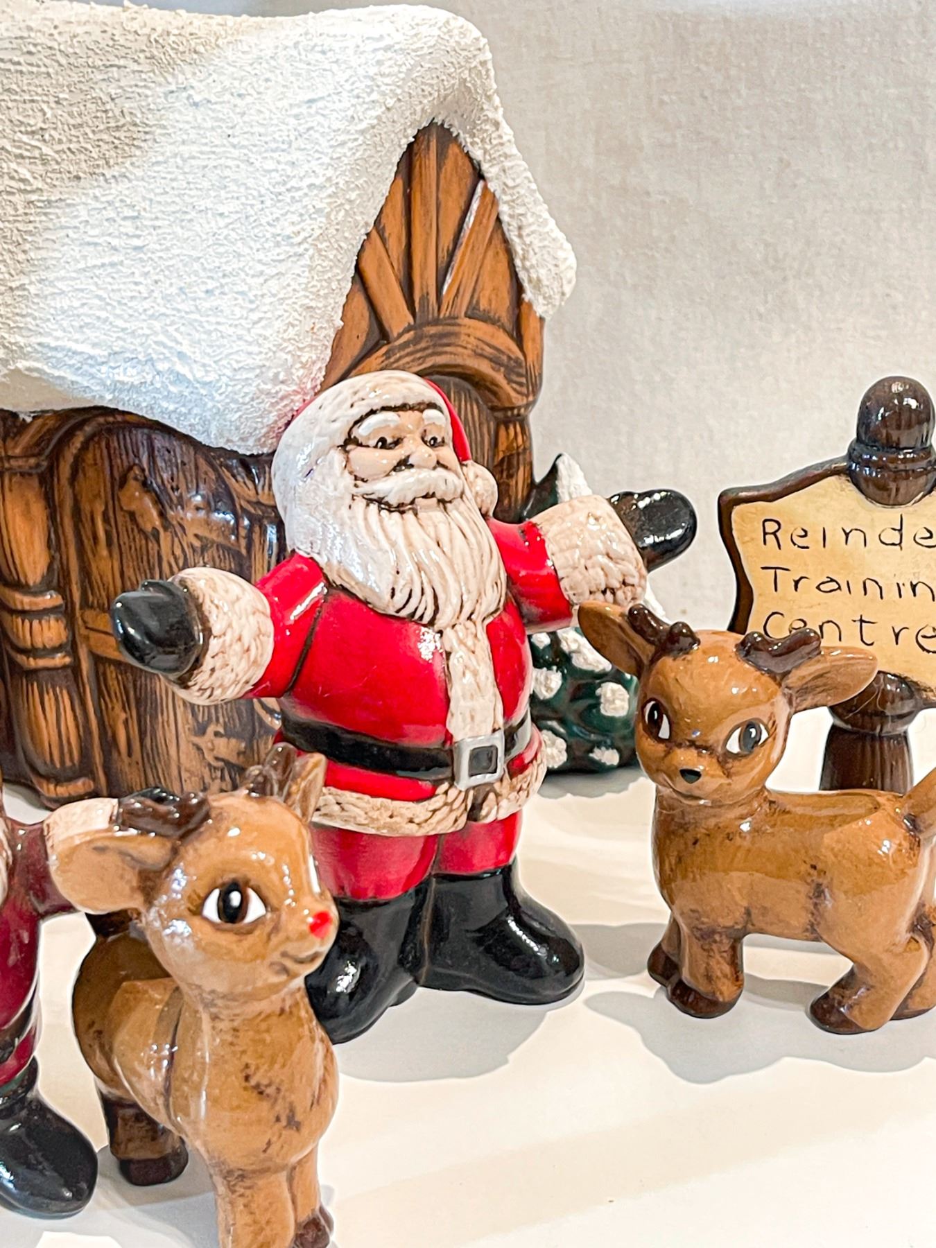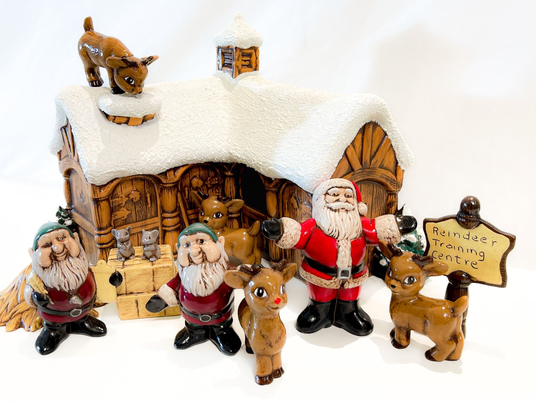 Charming vintage hand-painted ceramic Christmas display featuring Santa, two elves, and several reindeer outside the “Reindeer Training Centre.” The snow-covered building and whimsical expressions on each figure capture classic mid-century holiday charm. In excellent vintage condition—perfect for collectors or nostalgic seasonal décor.