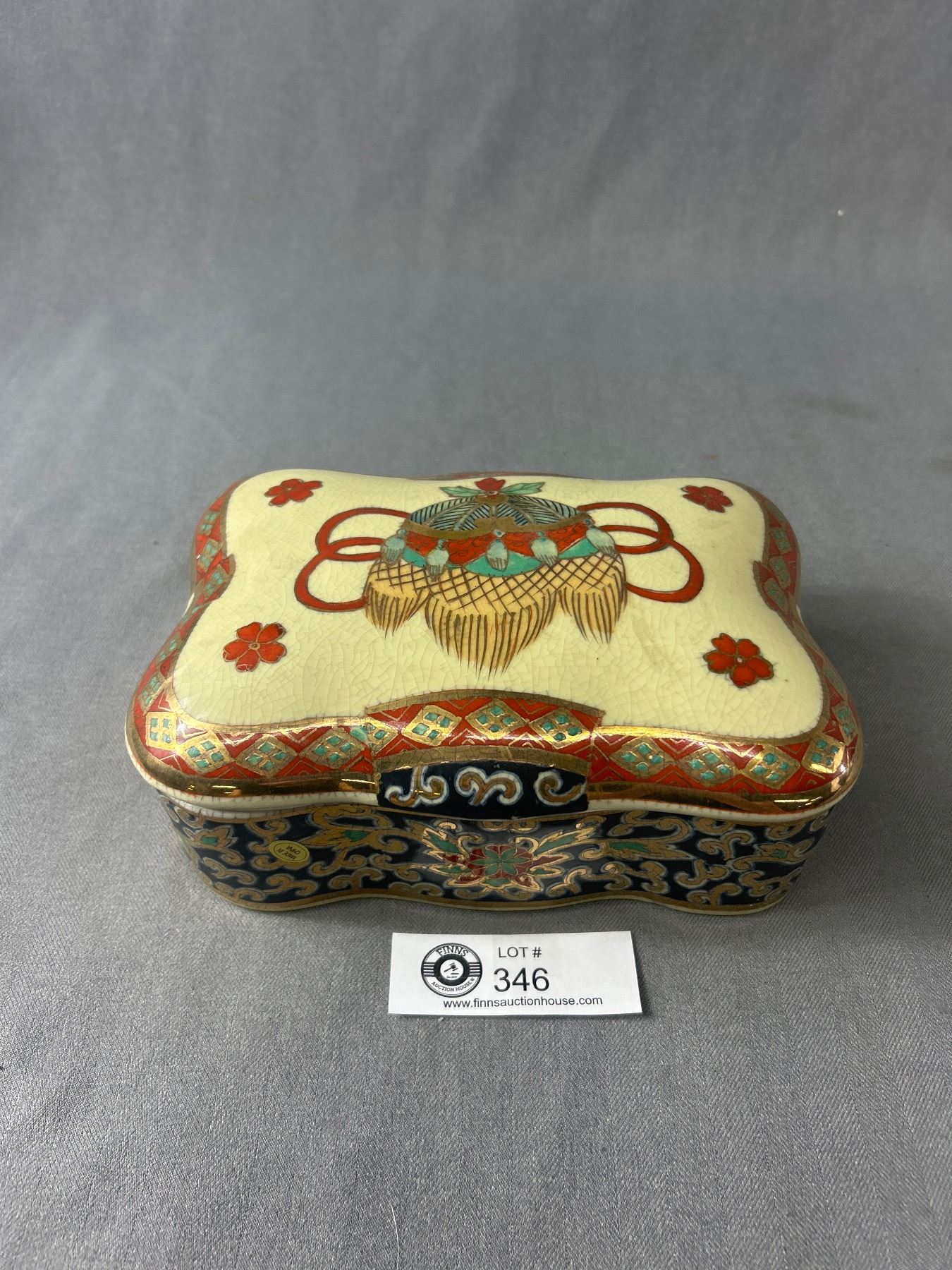 Vintage Hand Painted ? w/ Gold Colour Accents, Asian Trinket Box w/Lid. 2 chips to top of box. Displays Well.Approx. 6" x 8" x 2"