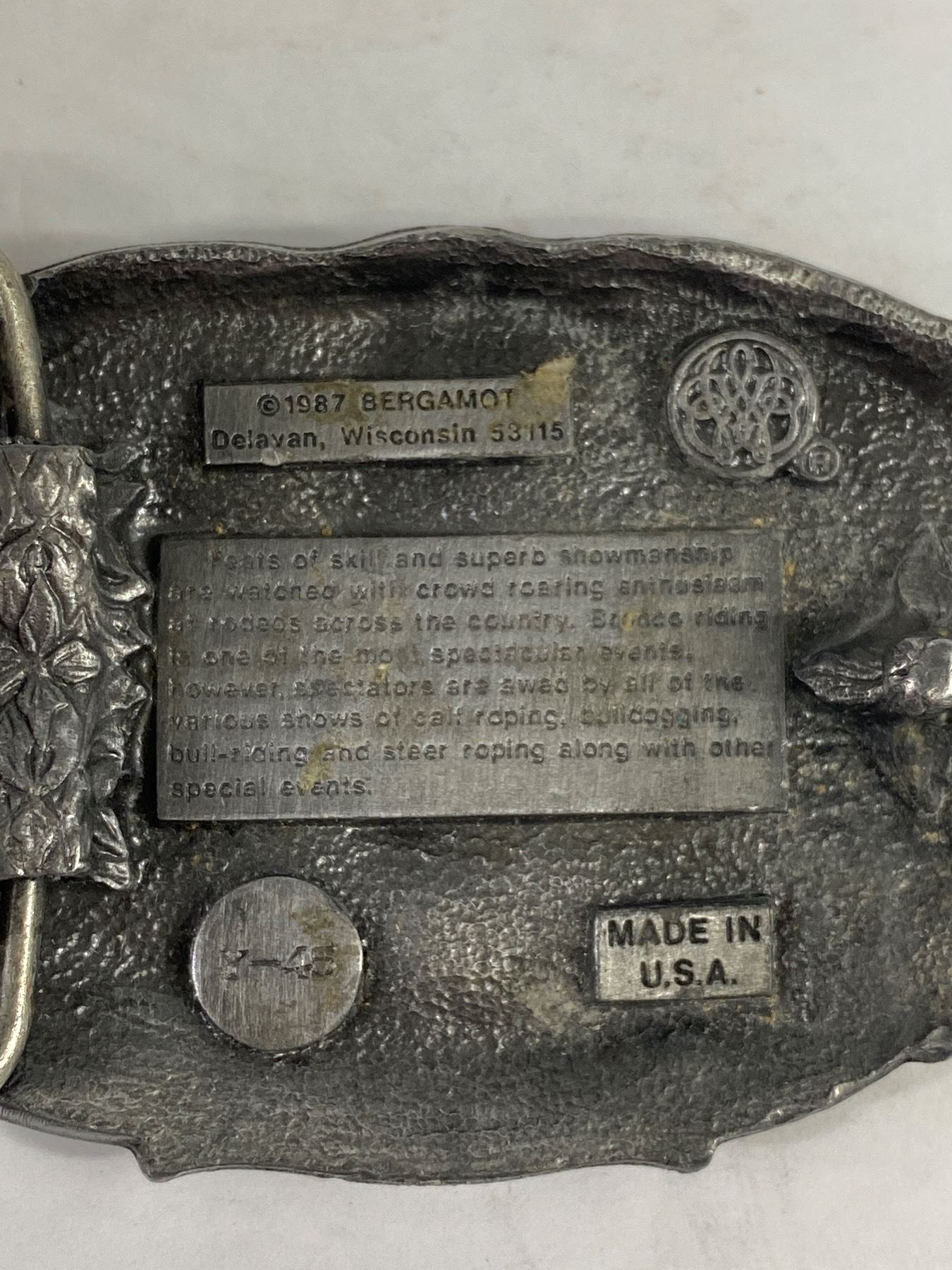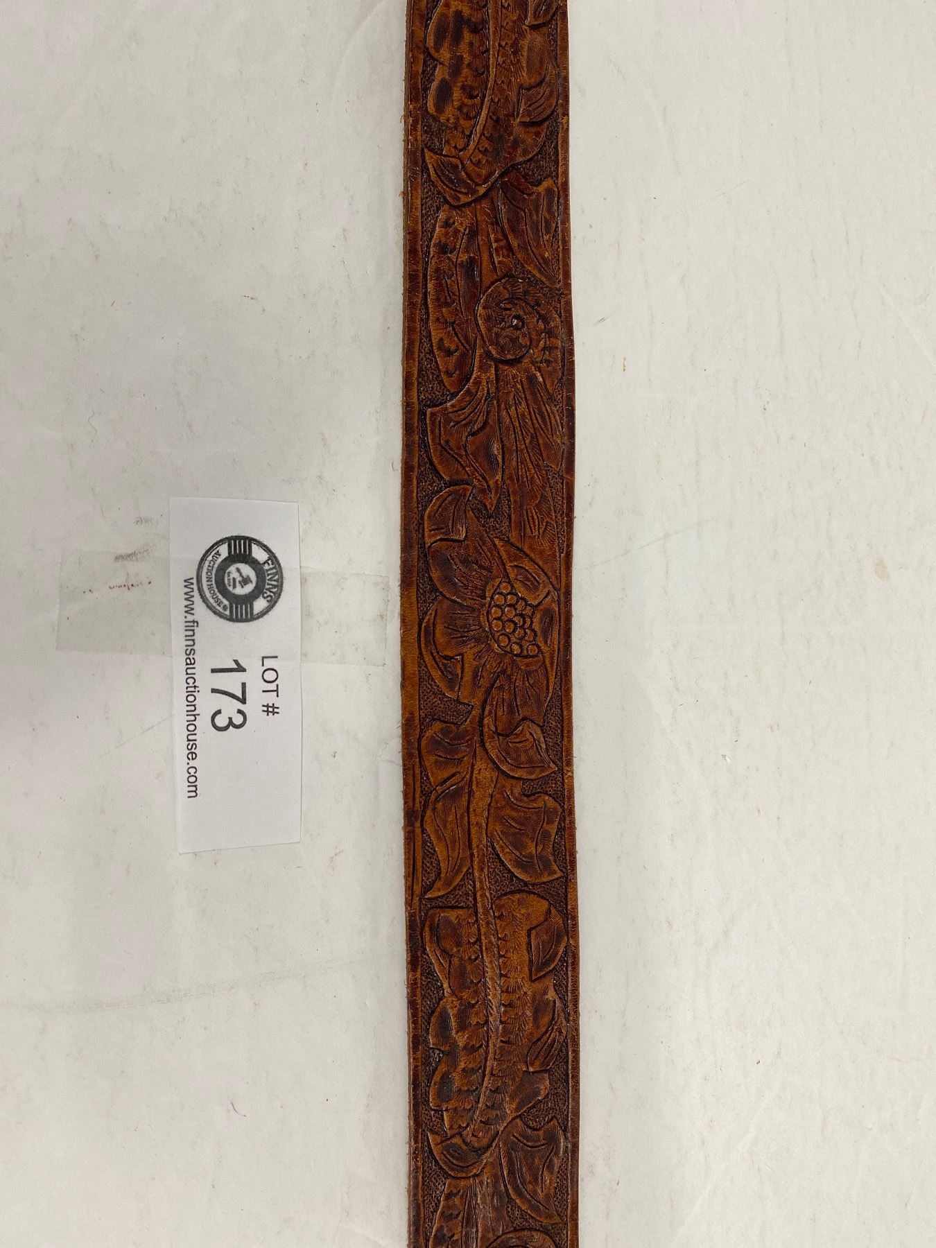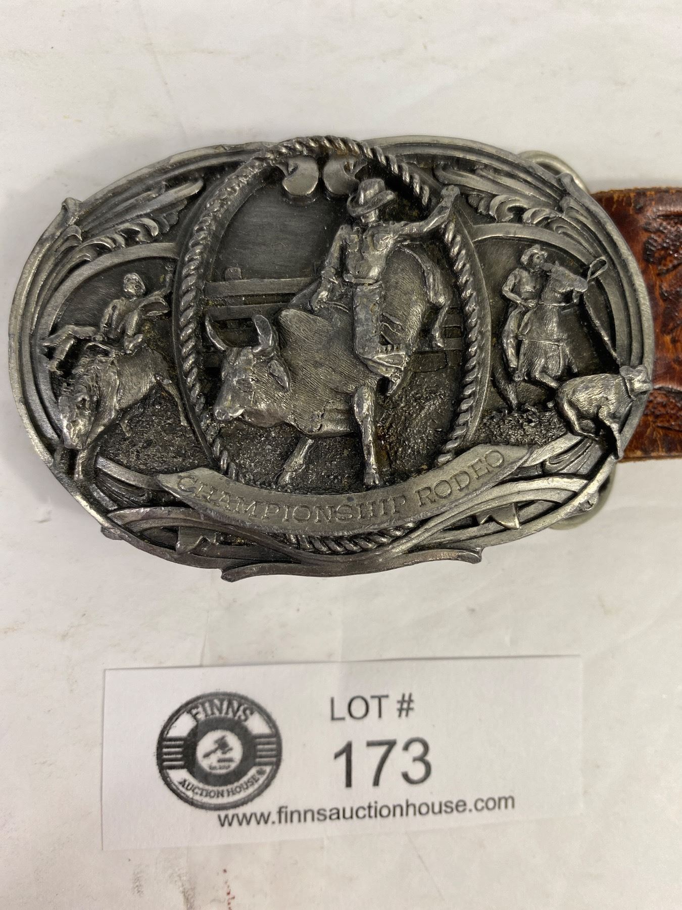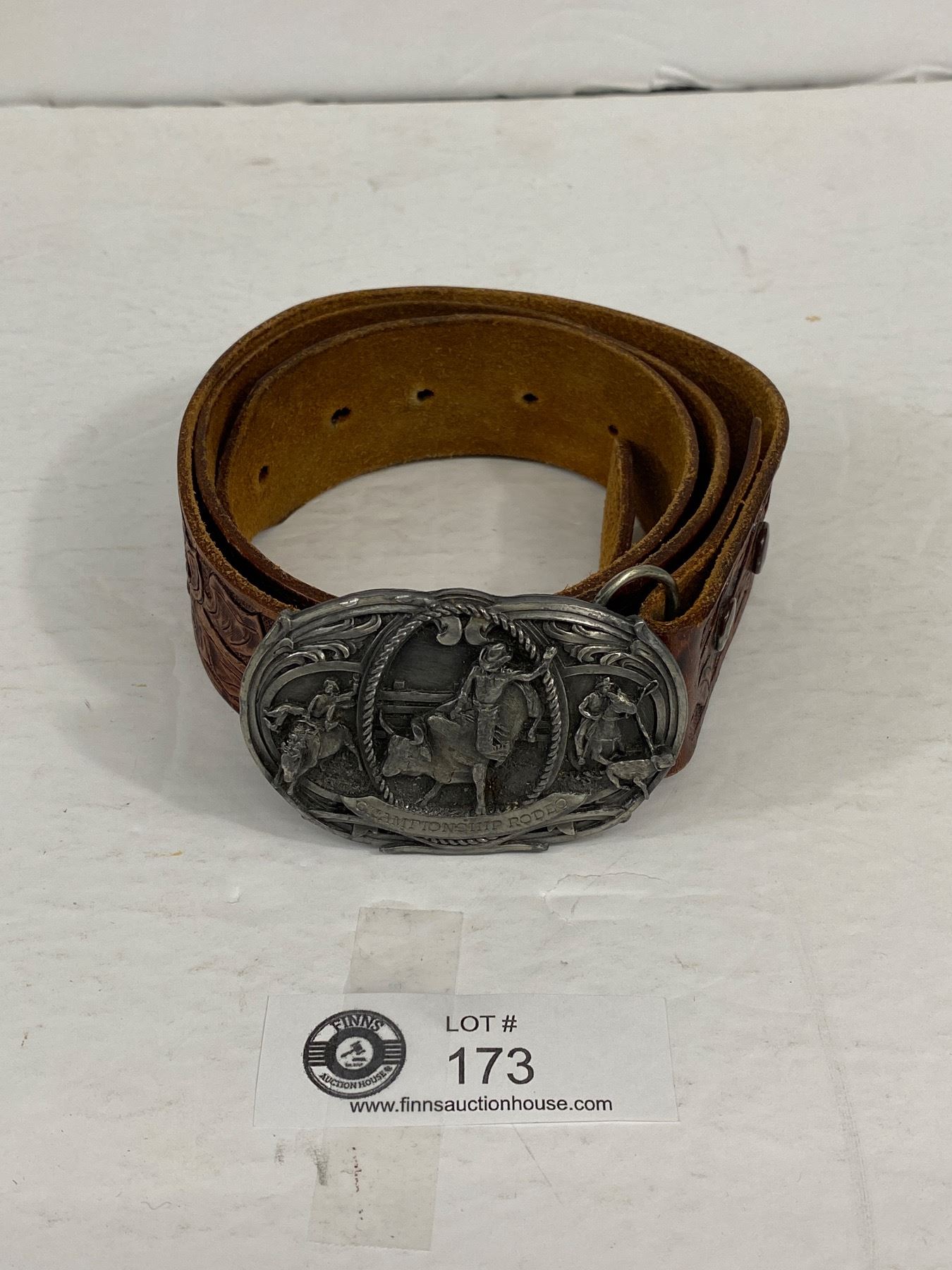 Vintage Hand Tooled Leather Belt w/1987 Bergamot Championship Rodeo Buckle